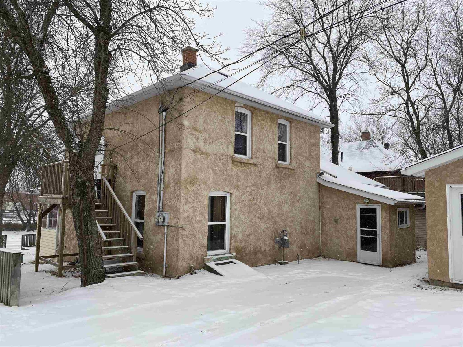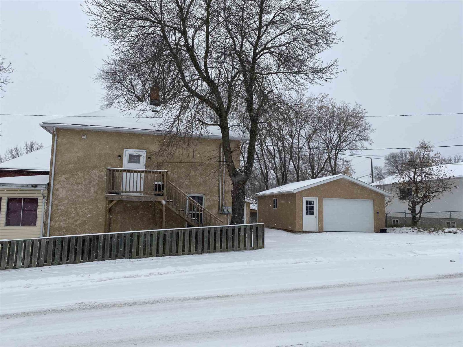 Centrally located duplex. Live in one and rent out the other or rent out both to double the income. Approx 1440 square foot, 2 storey brick building divided into 2 suites. Full Basement with inside and outside access. Fenced yar. One unit presently rented. One unit vacant. Main Floor is approx 840 sq ft, 1brdm with 1-4pce bath. Kitchen with appliances. Full basement with washer and dryer. Upper Level is approx 605 sq ft, 1 bdrm with 1-3pc bath. Fridge, stove, washer, dryer to stay. 2 stall garage measures 22' x 24'. Taxes are $2133.55 for 2020. Possession can be after Jan 1, 2021. Heat is Main floor Gas forced air and upstairs is electric heat. Chattels included are 2 fridges, 2 stoves, washer and dryer. Excluded is the rental hot water tank. Electrical is 100amp. (id:22211)