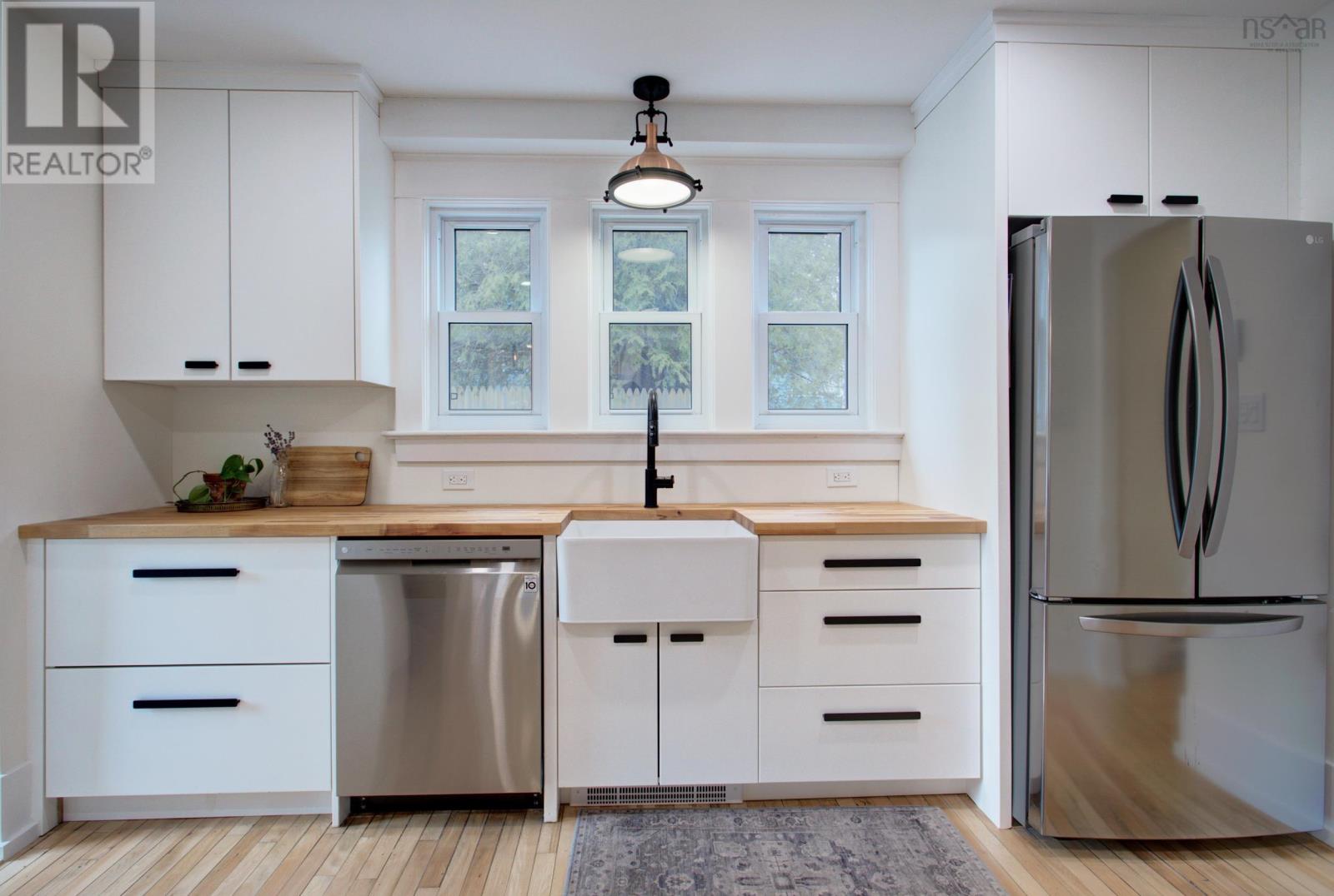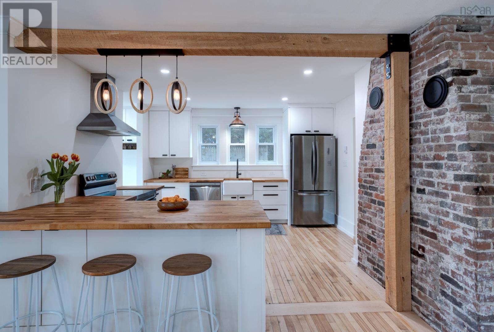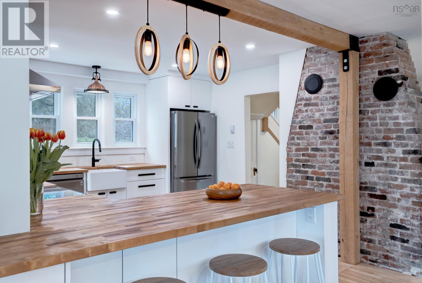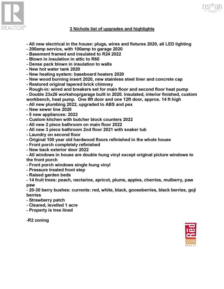 Welcome to 3 Nichols Avenue, a fully restored character home in Kentville. Every room in this charming valley home has been updated since 2020. Walking into the home, you're greeted with a charming sunroom, drenched in sunlight and perfect for reading, board games, or simply relaxing in, all year round. Enjoy all new electrical throughout, an updated heating system, new plumbing and sewer line, two renovated bathrooms, brand new custom kitchen with butcher block counters and stainless steel appliances, and the list goes on. The character of the home still remains with it's original (but refinished) 100 year old hardwood floors, gorgeous brick wood-burning fireplace with new insert and stainless steel liner. The main floor is bright, welcoming and functional. Upstairs, the bedroom floor is calm, quiet and serene. Exposed brick, black hardware, and penny-tile bathroom with soaker tub provide a tasteful and timeless look. You'll be impressed - but that's just the inside! Outside, a very large backyard is home to fruit trees - 14 in total - including peaches, plums, apricots, apples and more. Various berry bushes and raised garden beds make this an absolute Gardener's Paradise. An acre of land in total, most of it cleared, leads to a partially wooded section, perfect for playing and exploring under a canopy of mature trees. The double garage (23' x 26' with 14' ceilings) is insulated and finished, complete with a custom workbench with heat pump sits just steps from the back door of the house. Think of all the possibilities. 3 Nichols Ave is not one to be over looked - showings start Friday! (id:22211)