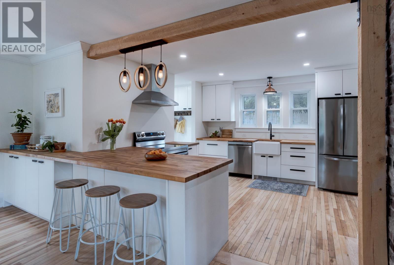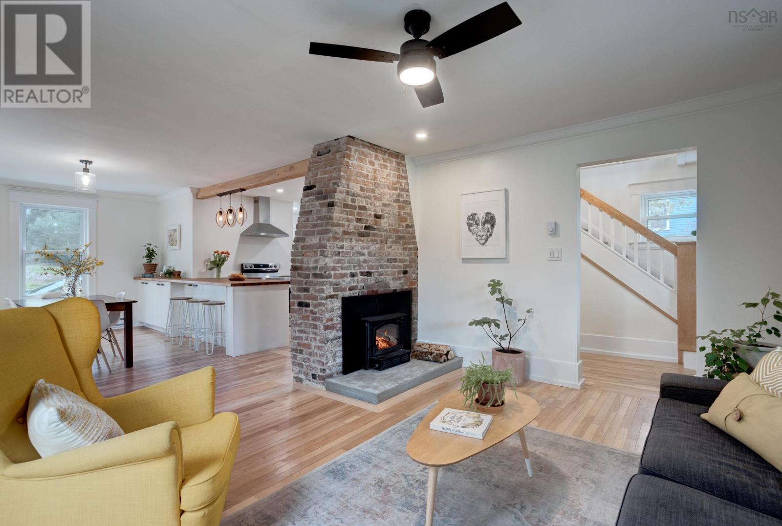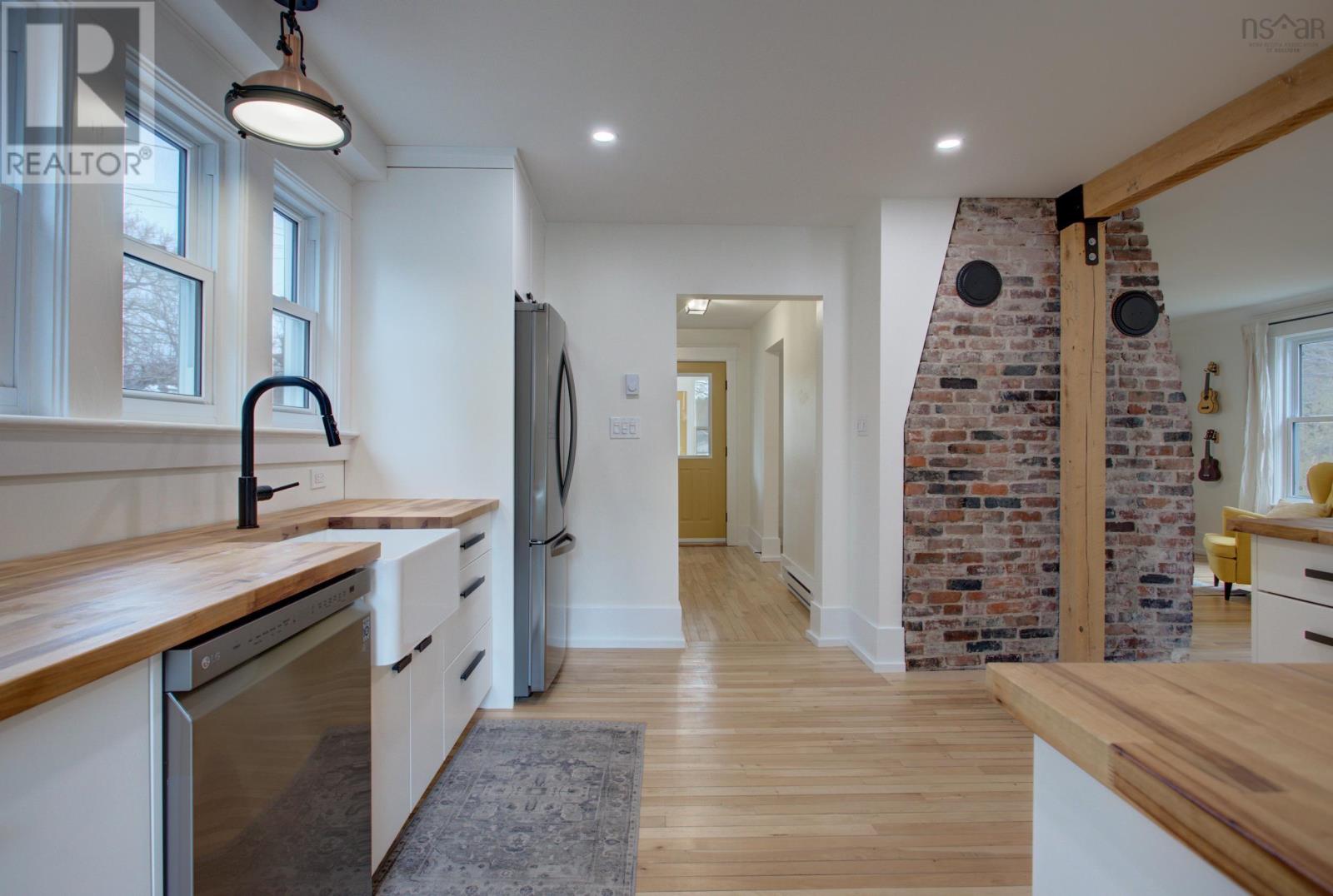 Welcome to 3 Nichols Avenue, a fully restored character home in Kentville. Every room in this charming valley home has been updated since 2020. Walking into the home, you're greeted with a charming sunroom, drenched in sunlight and perfect for reading, board games, or simply relaxing in, all year round. Enjoy all new electrical throughout, an updated heating system, new plumbing and sewer line, two renovated bathrooms, brand new custom kitchen with butcher block counters and stainless steel appliances, and the list goes on. The character of the home still remains with it's original (but refinished) 100 year old hardwood floors, gorgeous brick wood-burning fireplace with new insert and stainless steel liner. The main floor is bright, welcoming and functional. Upstairs, the bedroom floor is calm, quiet and serene. Exposed brick, black hardware, and penny-tile bathroom with soaker tub provide a tasteful and timeless look. You'll be impressed - but that's just the inside! Outside, a very large backyard is home to fruit trees - 14 in total - including peaches, plums, apricots, apples and more. Various berry bushes and raised garden beds make this an absolute Gardener's Paradise. An acre of land in total, most of it cleared, leads to a partially wooded section, perfect for playing and exploring under a canopy of mature trees. The double garage (23' x 26' with 14' ceilings) is insulated and finished, complete with a custom workbench with heat pump sits just steps from the back door of the house. Think of all the possibilities. 3 Nichols Ave is not one to be over looked - showings start Friday! (id:22211)