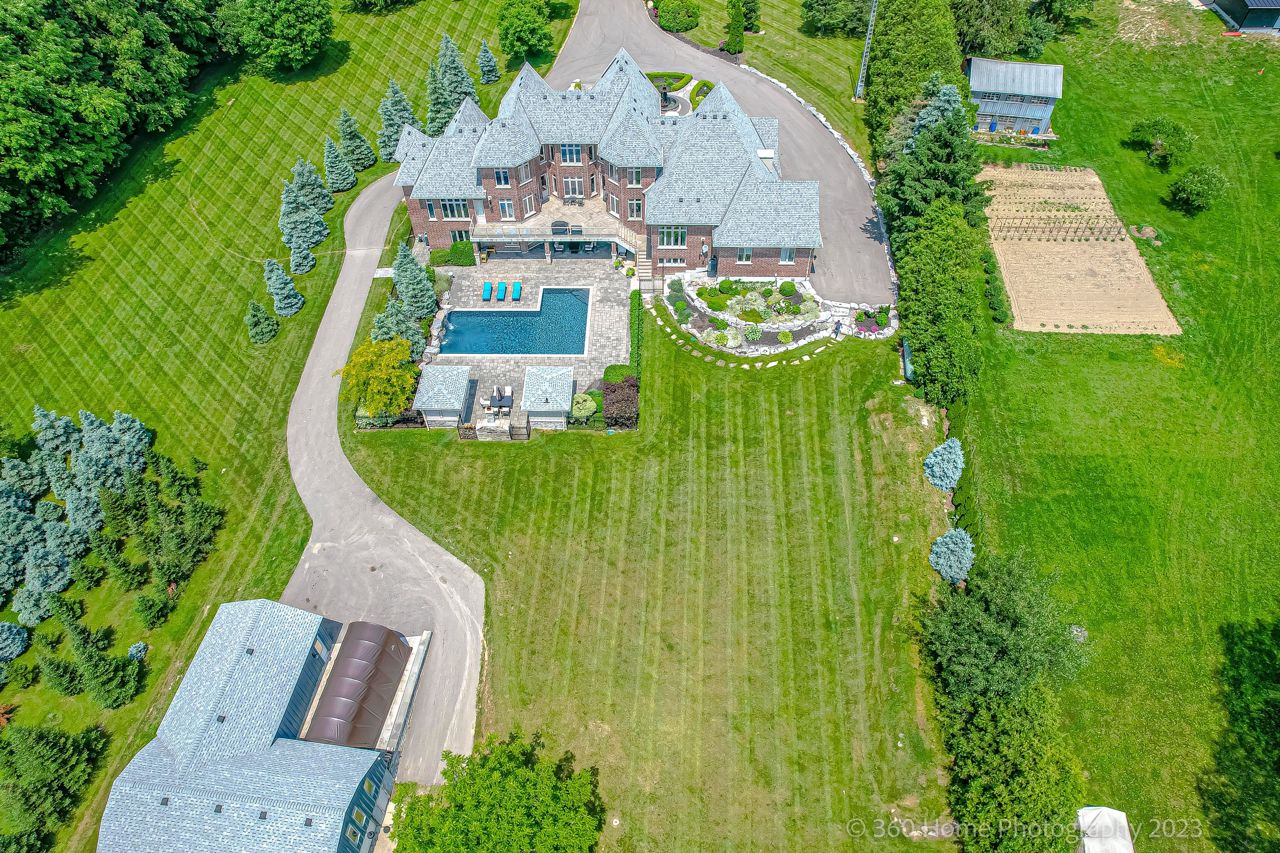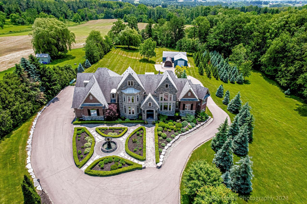 Exceptional Country Estate, An Amazing Property with Spectacular Views *One of a Kind*, Approx. 6000* Sq. Ft. Of Total Living Space On 9.4 Rolling Acres. Situated Behind Video-Monitored Gates, Split Driveway Leads To 4 Car Garage Of Home, & To Board & Batten Tri-Level Barn/ With Insulated Workshop, Hydro & Water. Elegant Bungaloft Boasts Multiple Walk-Outs to a Stone Patio & Waterfall Salt Pool with Custom Made Winter Safety Cover & Main Level Concrete & Glass Deck. 1 Outdoor Cabana W Washroom + Shower, 1 Kitchen Cabana, Temperature Controlled Wine Room, Gym, 2 Offices, Games Room. Pond, Fountain with Custom raised Basin surrounded by manicured landscaping.***A MUST SEE***See Attached For List Of Property Features & Exclusions. Extensive Security System& Cameras, New Coach lights Throughout, Multi-Zone Indoor & Outdoor Speakers; Sauna; Outdoor Wood Fireplace; Sprinkler System. Recreation Retreat Year-Round!