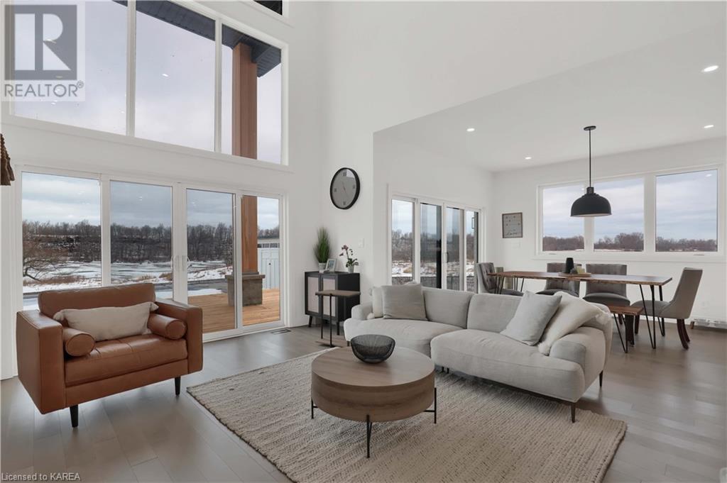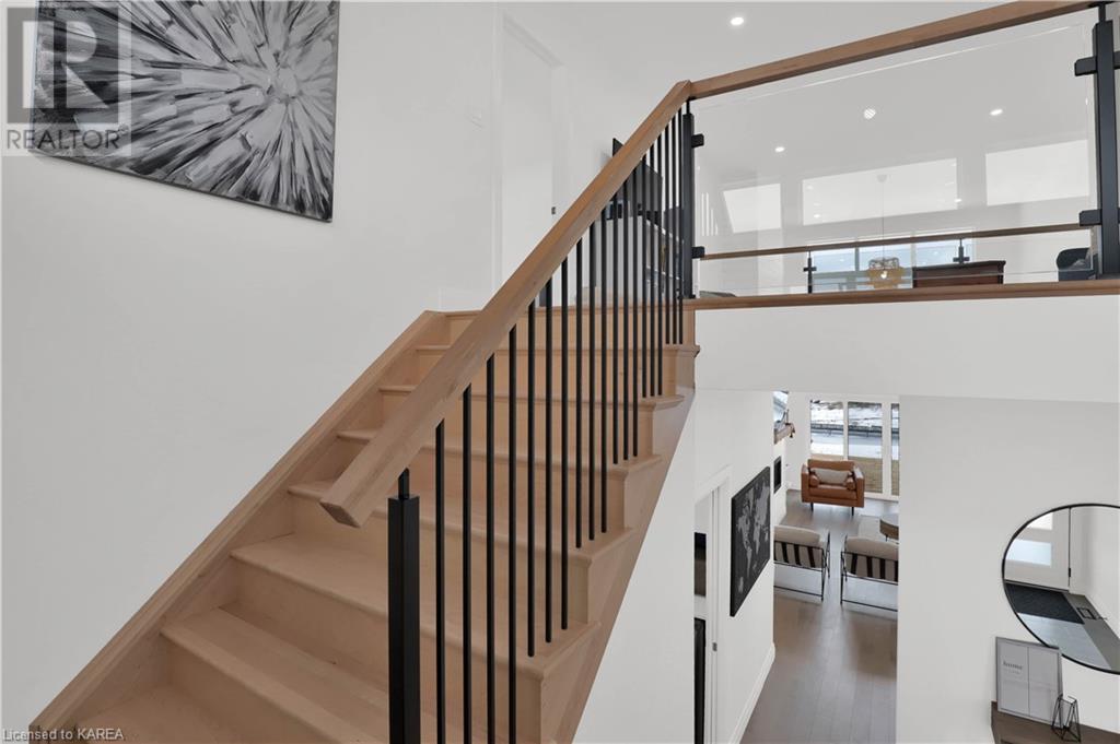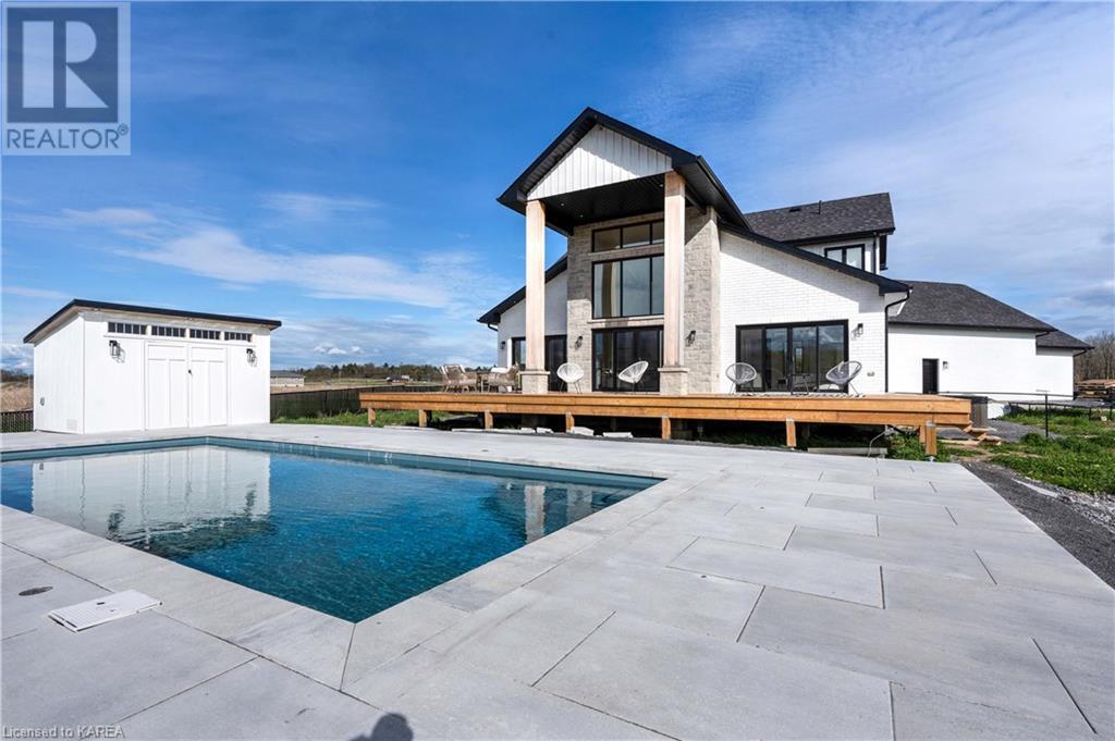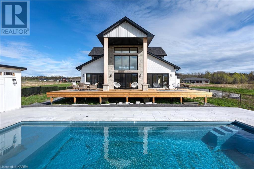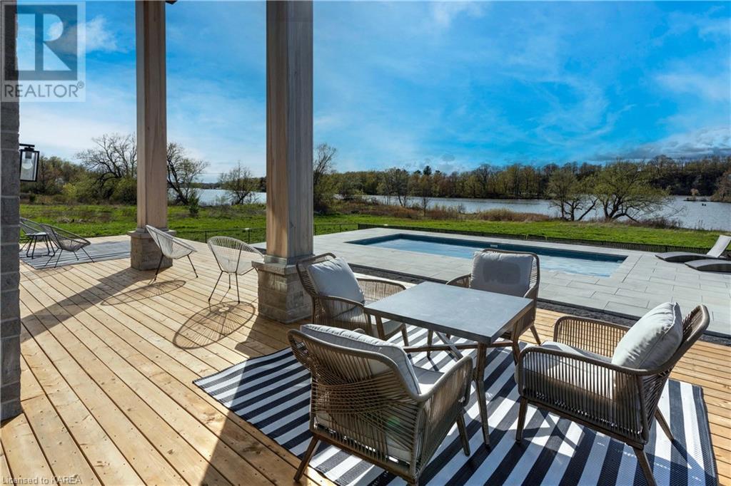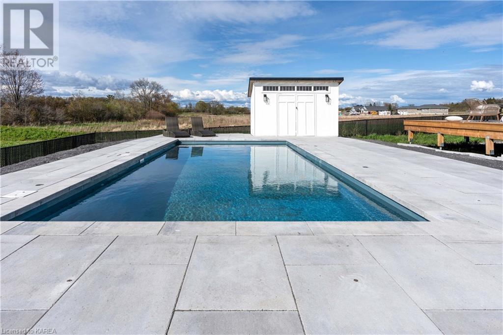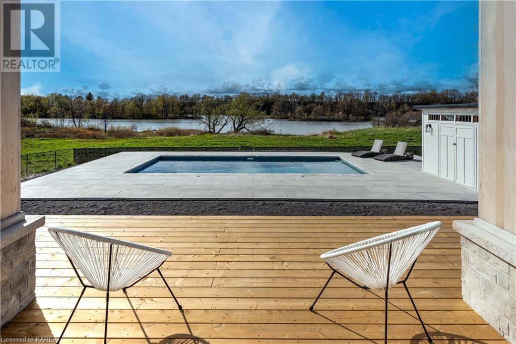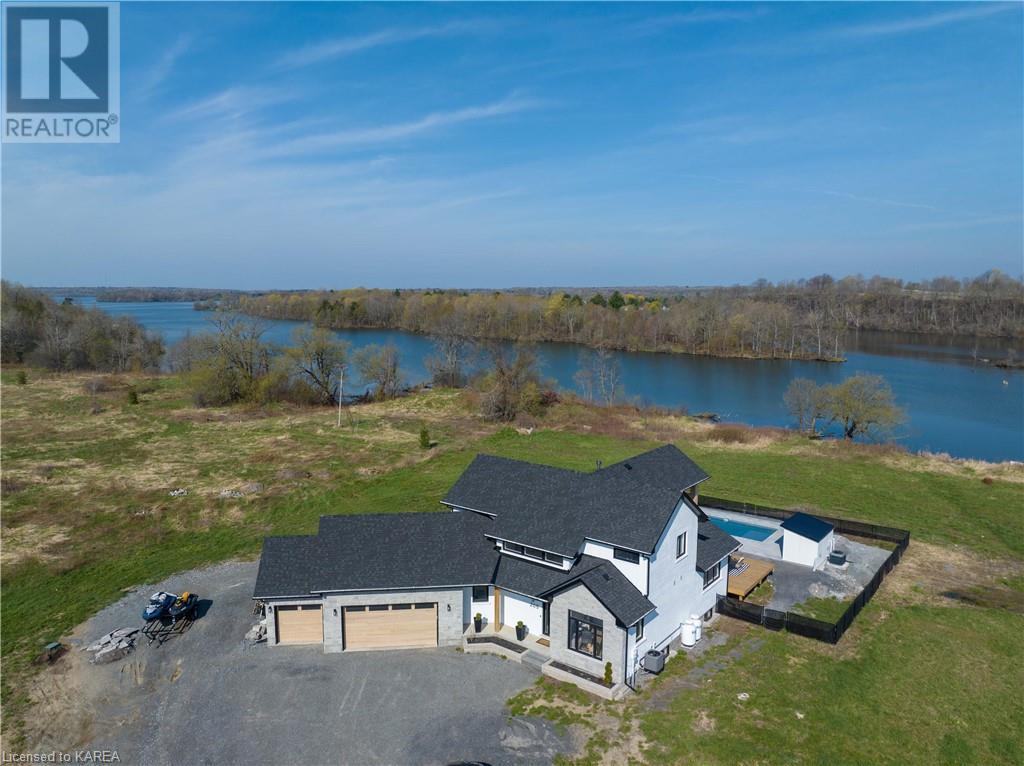 Welcome home to Gibraltar Estates! Quality custom build by renowned local builder Creative Homes by MacAdam. Rideau System waterfront living just 5 minutes north of the 401 within City of Kingston limits, and an easy 15 minute drive to downtown. Situated on 2.5 acres within a cul de sac, boasting 244ft of shoreline, this 3 bedroom 3.5 bathroom home truly defines elegance. The stately Scandinavian vibe carries both modern and timeless style throughout this 2500 square foot home. Open concept kitchen with a number of upgrades, dining area, and living room that is open to above with 20ft ceiling. The natural light will rival that in anything you have ever seen – there are 3 four panel patio doors across the backside of this home all stepping out onto the 18’x48’ covered deck with grand 20ft pillars. Fibreglass heated salt water pool with colour changing lights, deck jets, and 15’x30’ tanning ledge surrounded by patio pavers and retaining walls overlooking waterfront. Other features include 3 car garage with separated 1 bay single car, main floor office, all bedrooms have their own ensuites and walk in closets, spray foamed and drywalled basement with rough in, and hot tub. A few hundred words cannot capture the amount of detail, class, or upgrade list that this home possesses – you have to see it to experience such (id:22211)