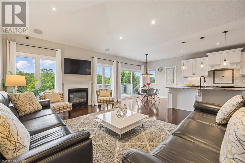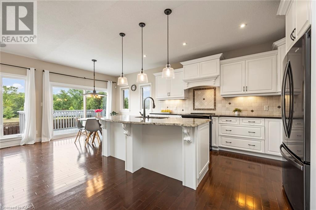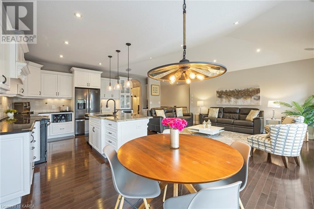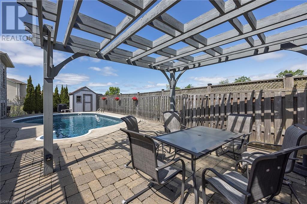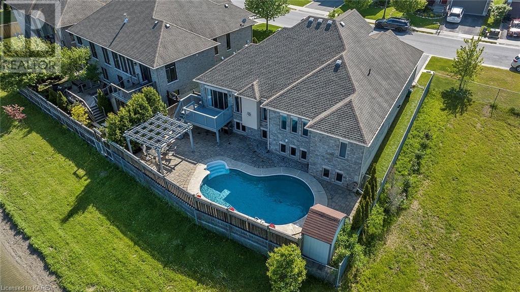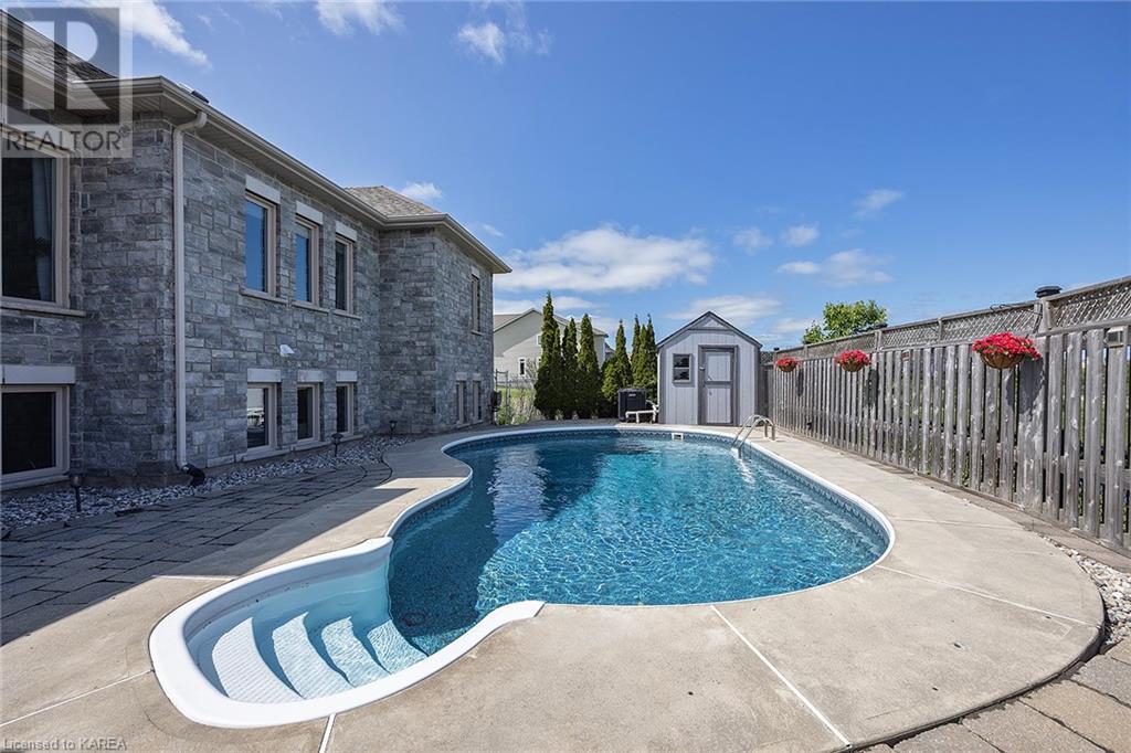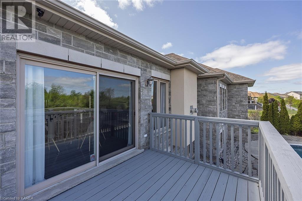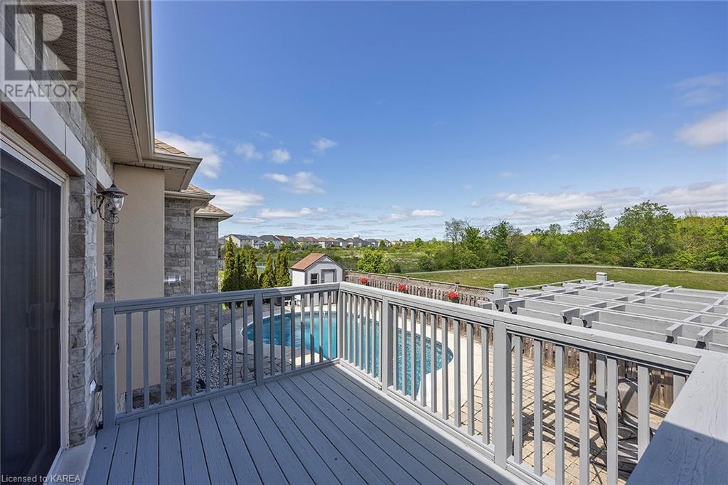 This spectacular 3+2 bedroom executive custom built bungalow offers magnificent sightlines where you need them, and privacy where to want it the most. With a wonderfully refreshed kitchen, and set on a premium lot backing onto conservation lands, and immediate neighbours only on one side, this amazing home checks off all of the boxes. Entering through the grand foyer, you will love the openness of the floorplan, with the gourmet kitchen with stone counters and large island looking out over the large living area with vaulted ceilings and lovely gas fireplace. The breakfast nook provides outside access to a great bbq deck, and a few steps down to your fully fenced backyard oasis with heated in-ground salt water pool. Main floor also has a large formal dining room where everyone can gather for family events, as well as a generous office with new California shutters. The bedrooms are all a great size, and the primary bedroom with trayed ceiling features lovely wood floors, a large walk-in closet and spa-like ensuite. Downstairs are two more bedrooms, and a large rec room, each of which have large bright windows. Lots of storage space as well. This home is ideally situated close to CFB Kingston and provides easy access to all parts of the city and Highway 401. Don’t miss this beautiful home! (id:22211)