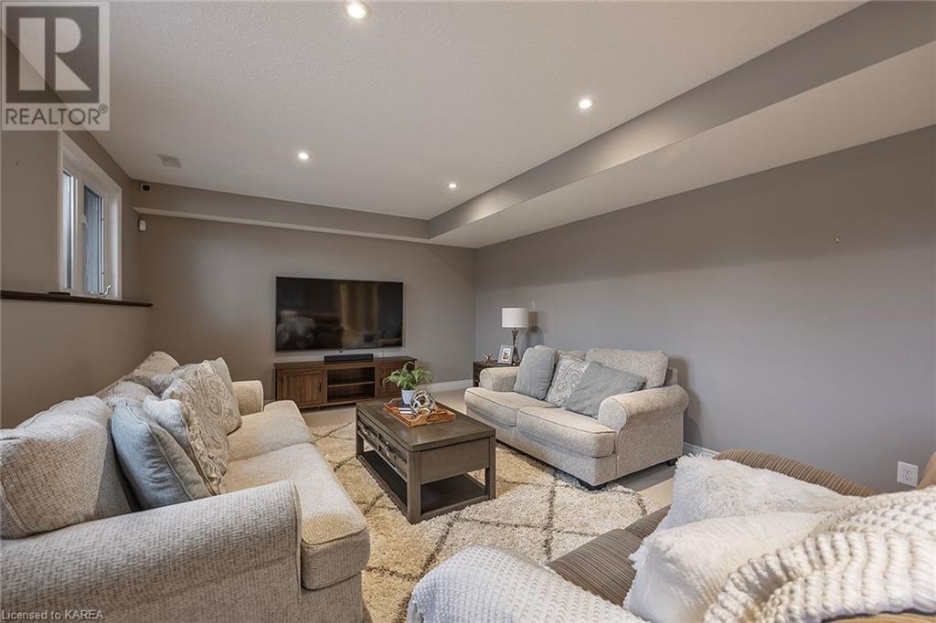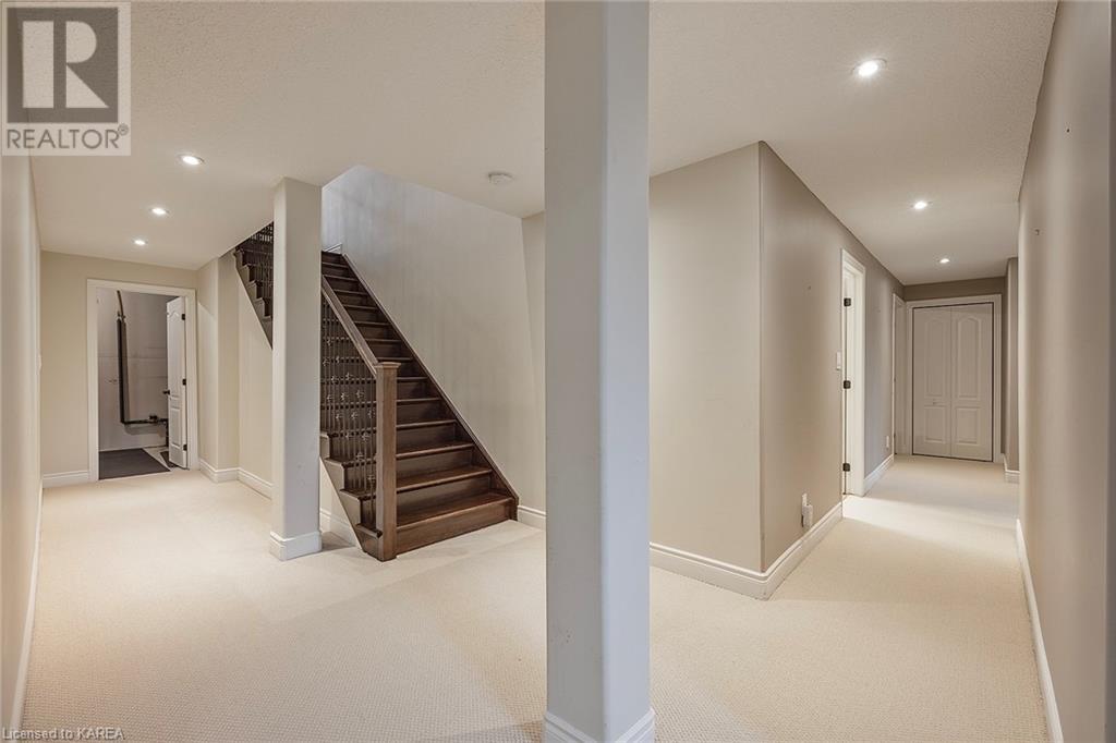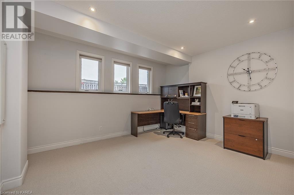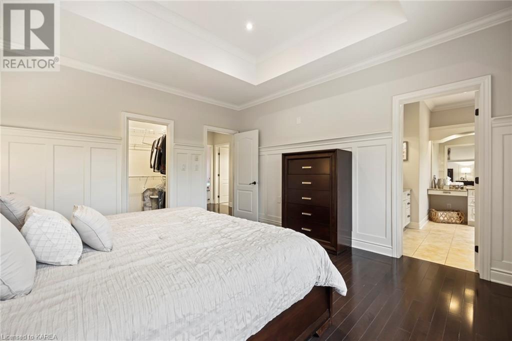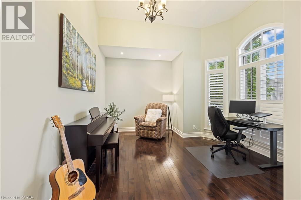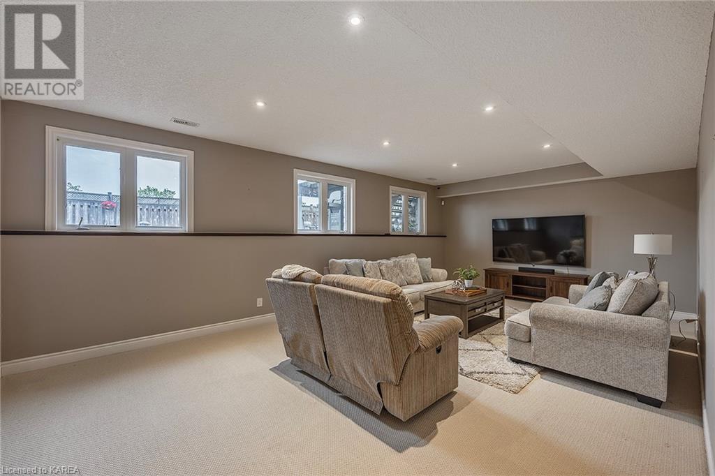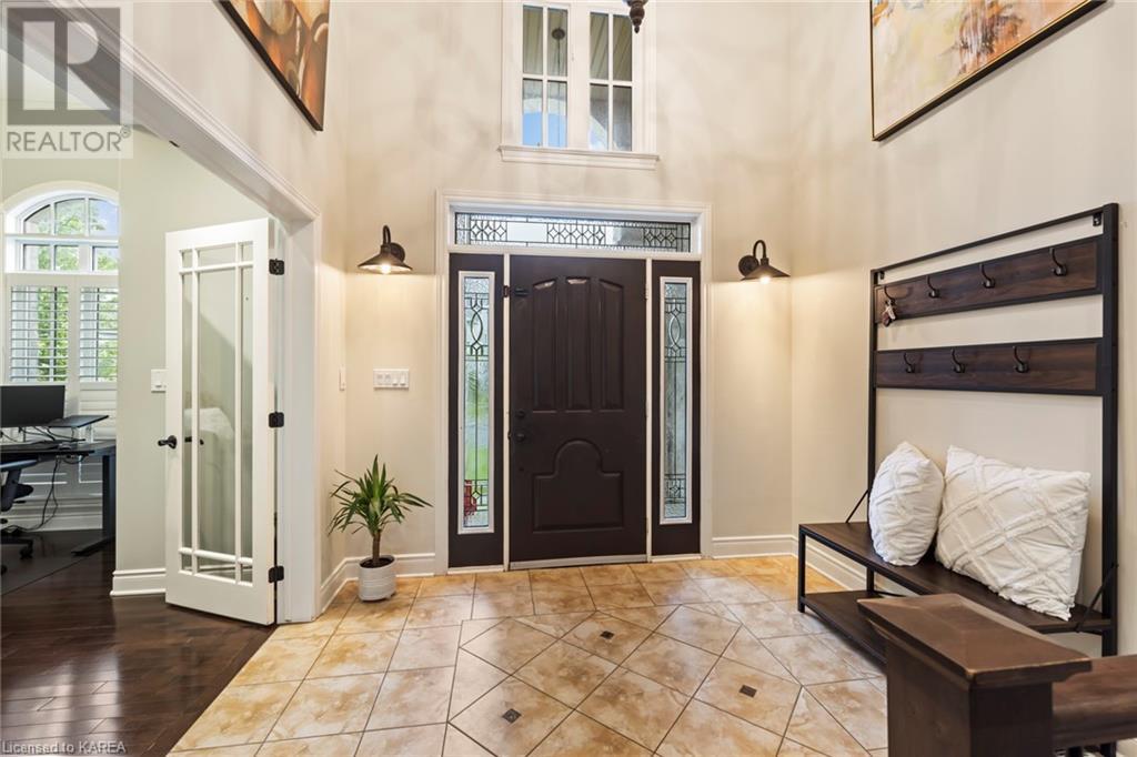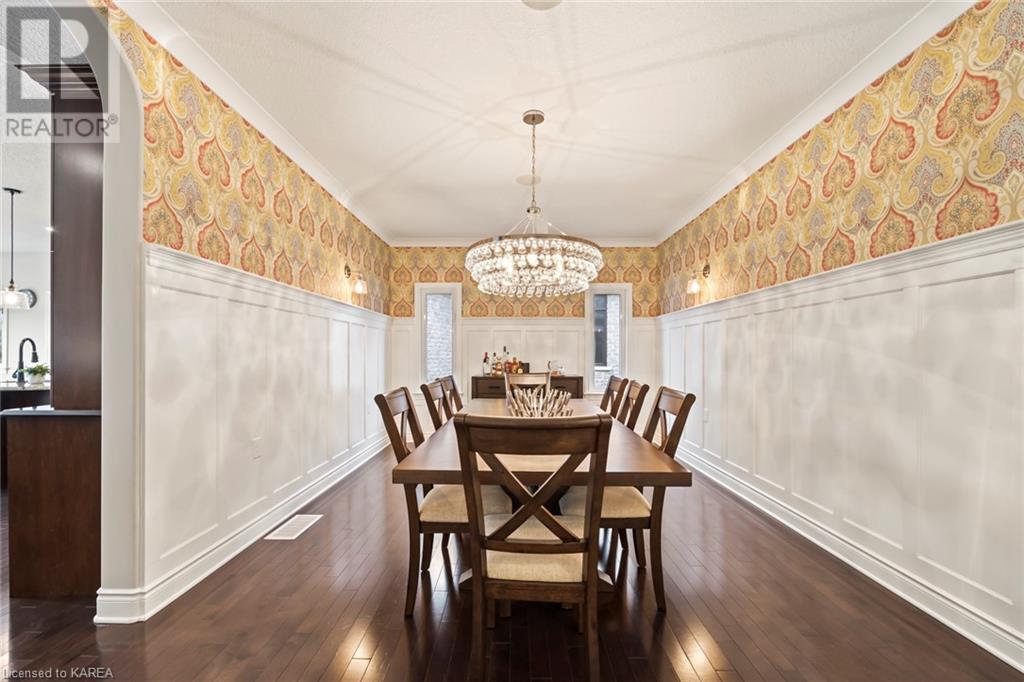 This spectacular 3+2 bedroom executive custom built bungalow offers magnificent sightlines where you need them, and privacy where to want it the most. With a wonderfully refreshed kitchen, and set on a premium lot backing onto conservation lands, and immediate neighbours only on one side, this amazing home checks off all of the boxes. Entering through the grand foyer, you will love the openness of the floorplan, with the gourmet kitchen with stone counters and large island looking out over the large living area with vaulted ceilings and lovely gas fireplace. The breakfast nook provides outside access to a great bbq deck, and a few steps down to your fully fenced backyard oasis with heated in-ground salt water pool. Main floor also has a large formal dining room where everyone can gather for family events, as well as a generous office with new California shutters. The bedrooms are all a great size, and the primary bedroom with trayed ceiling features lovely wood floors, a large walk-in closet and spa-like ensuite. Downstairs are two more bedrooms, and a large rec room, each of which have large bright windows. Lots of storage space as well. This home is ideally situated close to CFB Kingston and provides easy access to all parts of the city and Highway 401. Don’t miss this beautiful home! (id:22211)