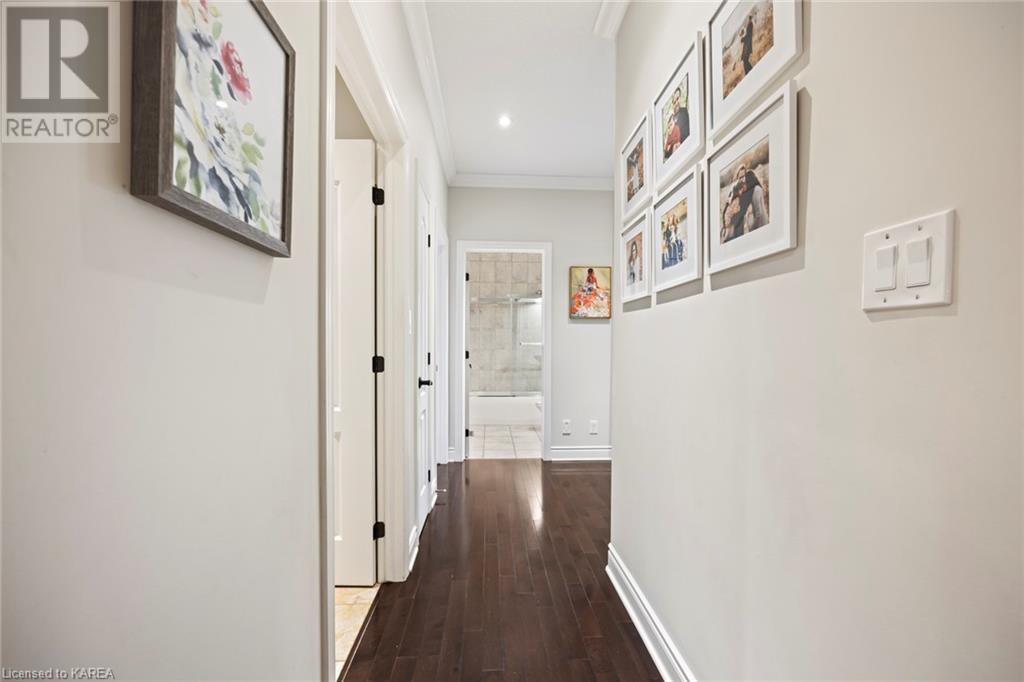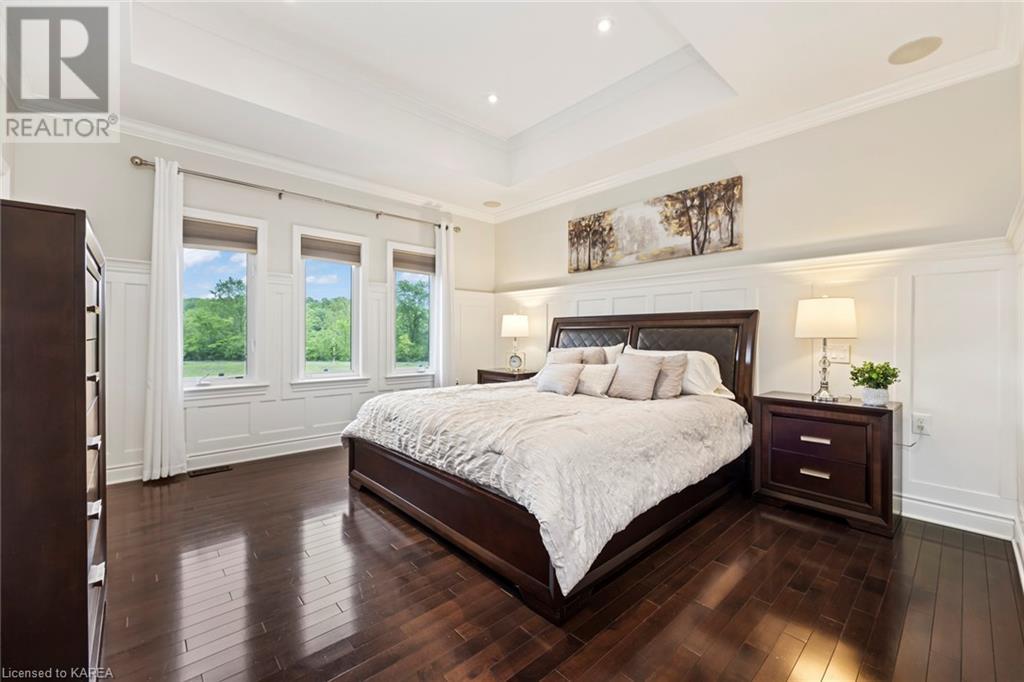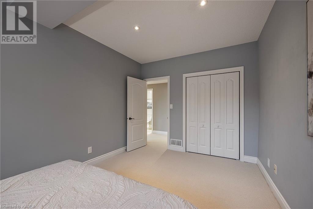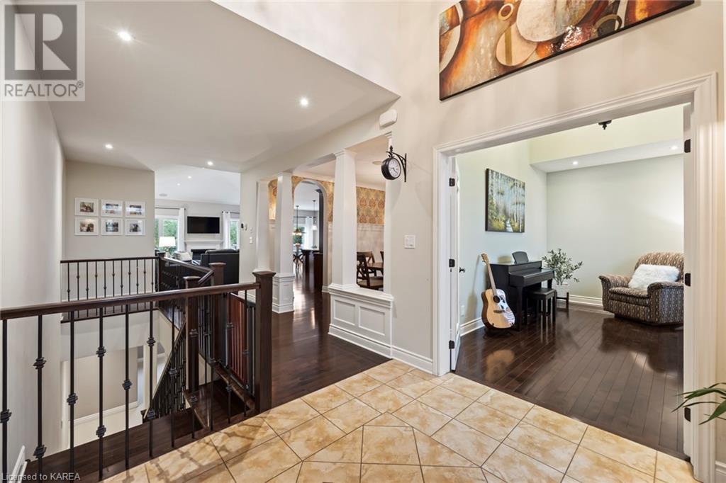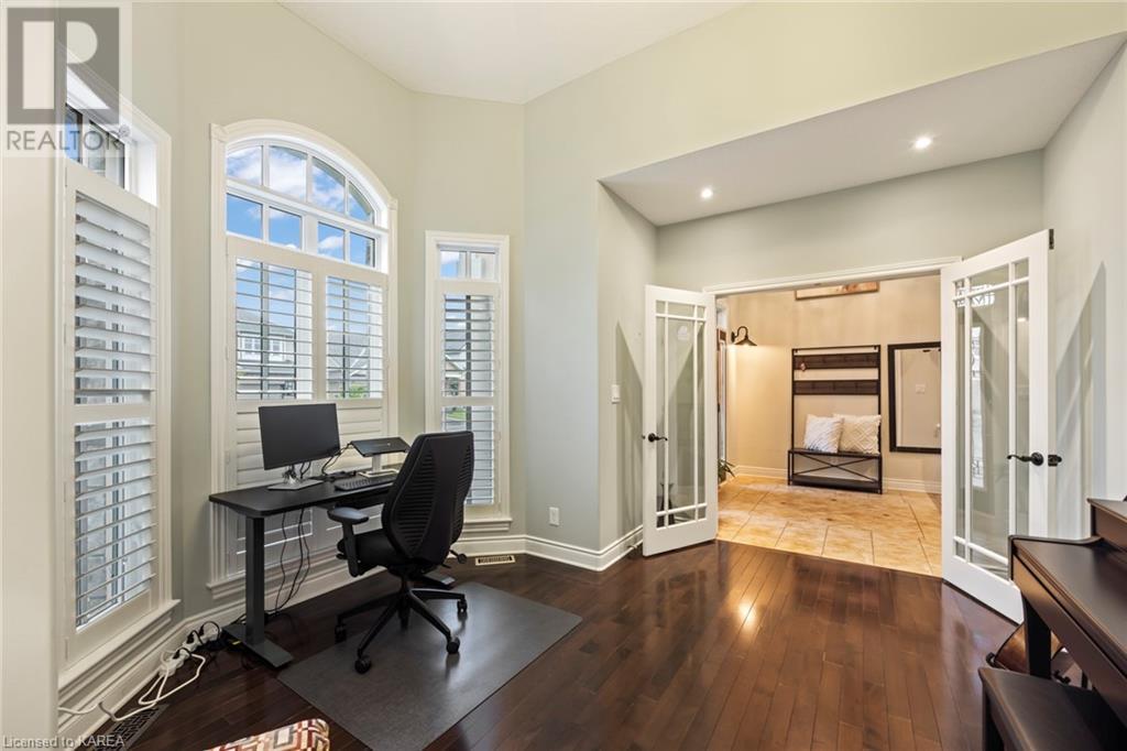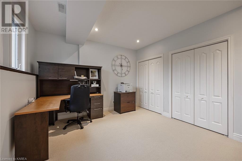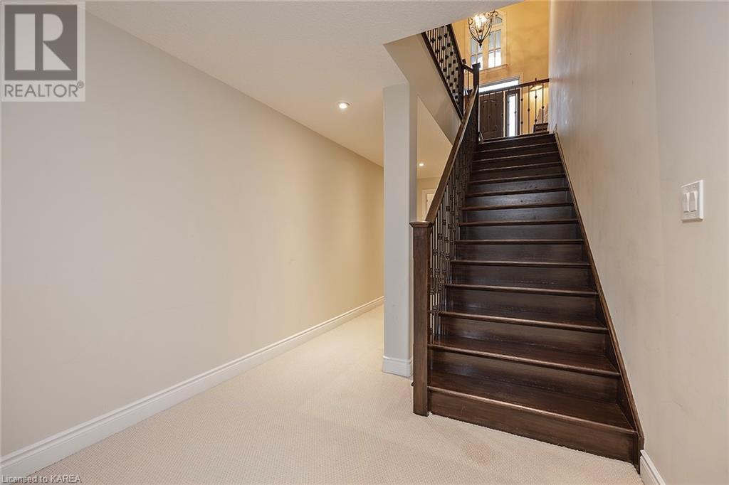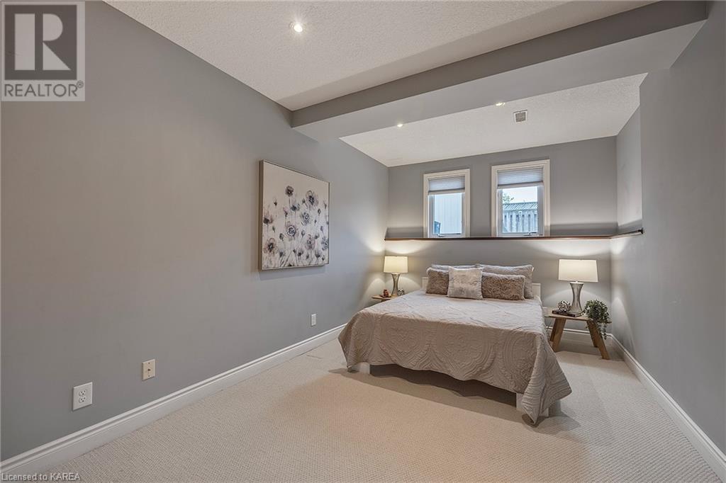 This spectacular 3+2 bedroom executive custom built bungalow offers magnificent sightlines where you need them, and privacy where to want it the most. With a wonderfully refreshed kitchen, and set on a premium lot backing onto conservation lands, and immediate neighbours only on one side, this amazing home checks off all of the boxes. Entering through the grand foyer, you will love the openness of the floorplan, with the gourmet kitchen with stone counters and large island looking out over the large living area with vaulted ceilings and lovely gas fireplace. The breakfast nook provides outside access to a great bbq deck, and a few steps down to your fully fenced backyard oasis with heated in-ground salt water pool. Main floor also has a large formal dining room where everyone can gather for family events, as well as a generous office with new California shutters. The bedrooms are all a great size, and the primary bedroom with trayed ceiling features lovely wood floors, a large walk-in closet and spa-like ensuite. Downstairs are two more bedrooms, and a large rec room, each of which have large bright windows. Lots of storage space as well. This home is ideally situated close to CFB Kingston and provides easy access to all parts of the city and Highway 401. Don’t miss this beautiful home! (id:22211)
