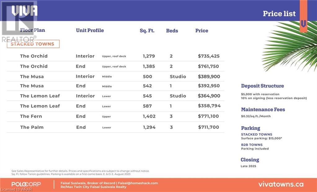 VIVA–THE BRIGHTEST ADDITION TO DOWNTOWN KITCHENER. In this exclusive community located on Mill Street near downtown Kitchener, life at Viva offers residents the perfect blend of nature, neighbourhood & nightlife. Step outside your doors at Viva and hit the Iron Horse Trail. Walk, run, bike, and stroll through connections to parks and open spaces, on and off-road cycling routes, the iON LRT systems, downtown Kitchener and several neighbourhoods. Victoria Park is also just steps away, with scenic surroundings, play and exercise equipment, a splash pad, and winter skating. Nestled in a professionally landscaped exterior, these modern stacked townhomes are finely crafted with unique layouts. The Orchid interior model boasts an open-concept main floor layout – ideal for entertaining including the kitchen with a breakfast bar, quartz countertops, ceramic and luxury vinyl plank flooring throughout, stainless steel appliances, and more. Offering 1279 sqft including 2 bedrooms, 2.5 bathrooms, a balcony, and a roof top deck. Thrive in the heart of Kitchener where you can easily grab your favourite latte Uptown, catch up on errands, or head to your yoga class in the park. Relish in the best of both worlds with a bright and vibrant lifestyle in downtown Kitchener, while enjoying the quiet and calm of a mature neighbourhood. ONLY 10% DEPOSIT. CLOSING DECEMBER 2025. (id:22211)