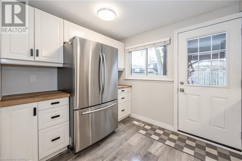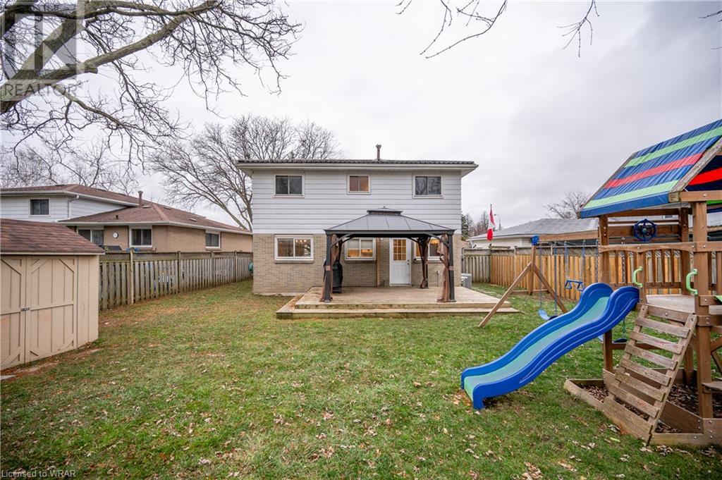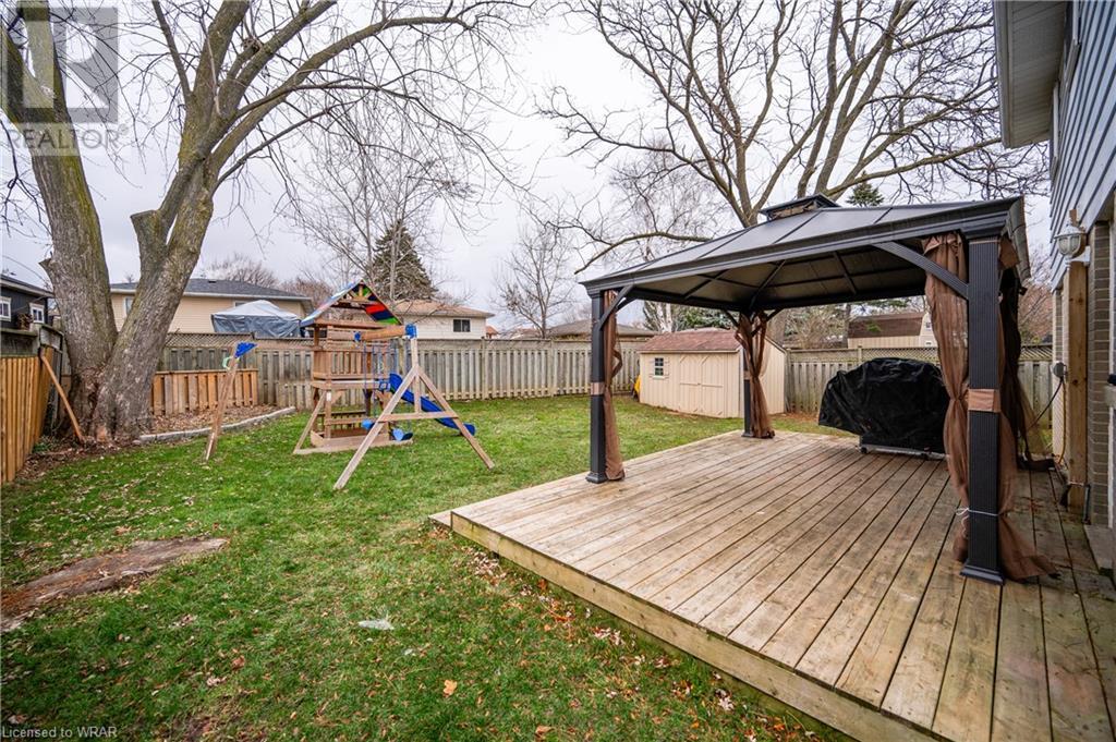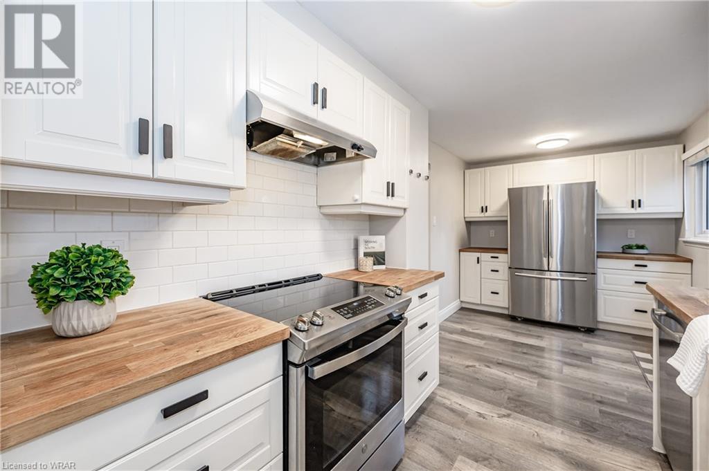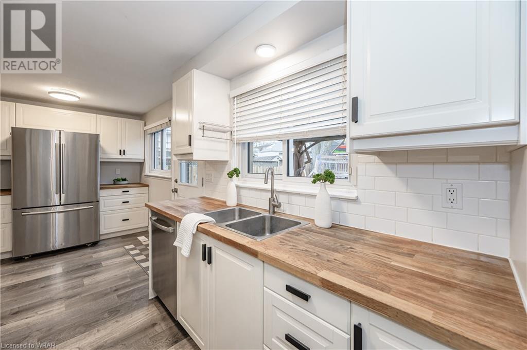 WELCOME to 56 Markwood Drive, a beautiful and well-maintained family home nestled in a quiet and desirable neighbourhood in Kitchener. Step into a warm and inviting living space featuring 4 bedrooms and 2 bathrooms. The updated kitchen is equipped with newer appliances, newly finished butcher block counter tops, and stylish cabinetry. Enjoy your private oasis in the backyard, complete with a deck with a GAS BBQ, gazebo, and garden shed. It's an ideal space for summer barbecues, family gatherings, or simply unwinding after a long day. 56 Markwood Drive is conveniently located near schools, parks, shopping centers, and HWY access to make commuting a breeze. Pride of ownership is evident throughout. The property has been meticulously maintained, ensuring a move-in-ready experience for the new owners. This is a GREAT OPPORTUNITY for first time homebuyers with ALL furniture being negotiable. Don't miss the opportunity to make this house your home. Reach out to schedule a private viewing! Furnace/AC(2019) Steel Roof(2021) Appliances(2021) Water Softener NEW (id:22211)