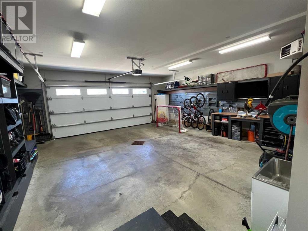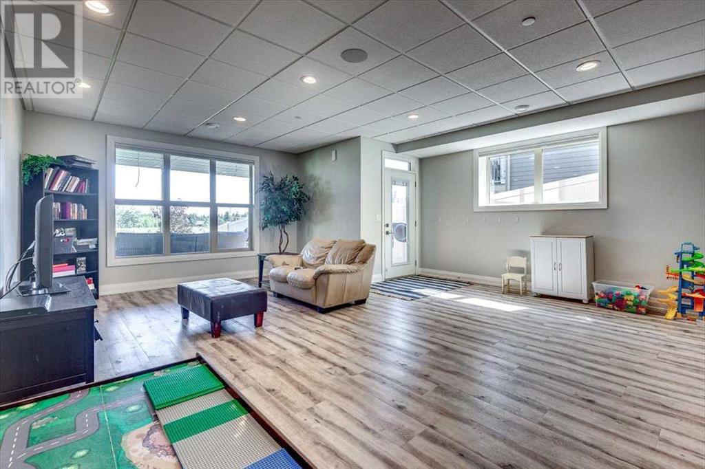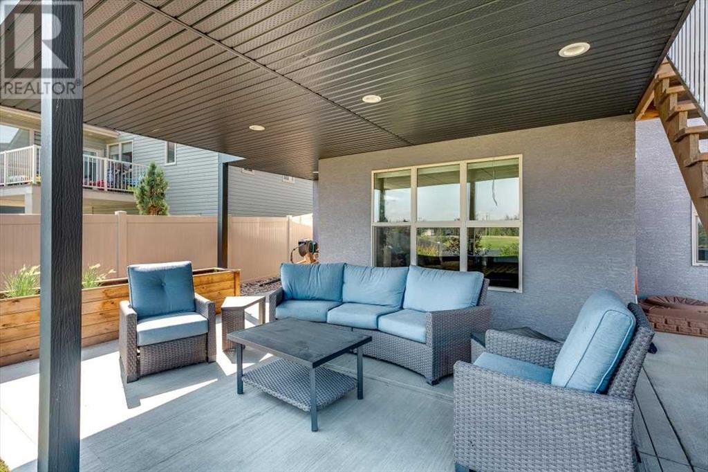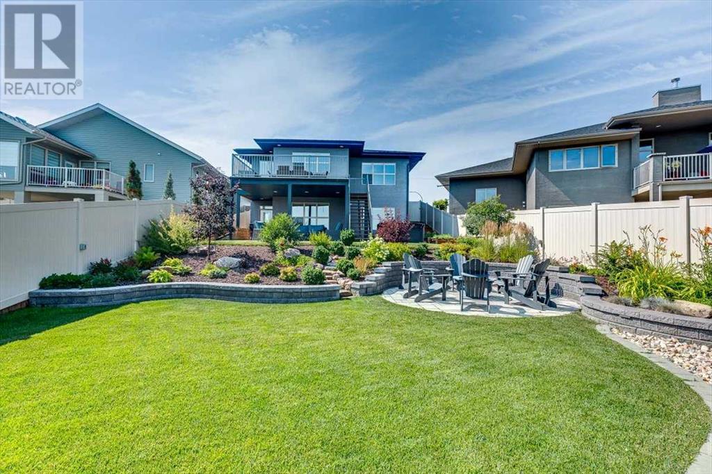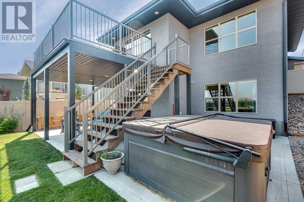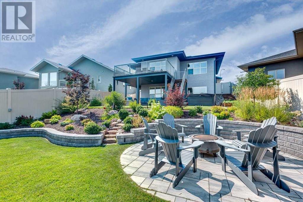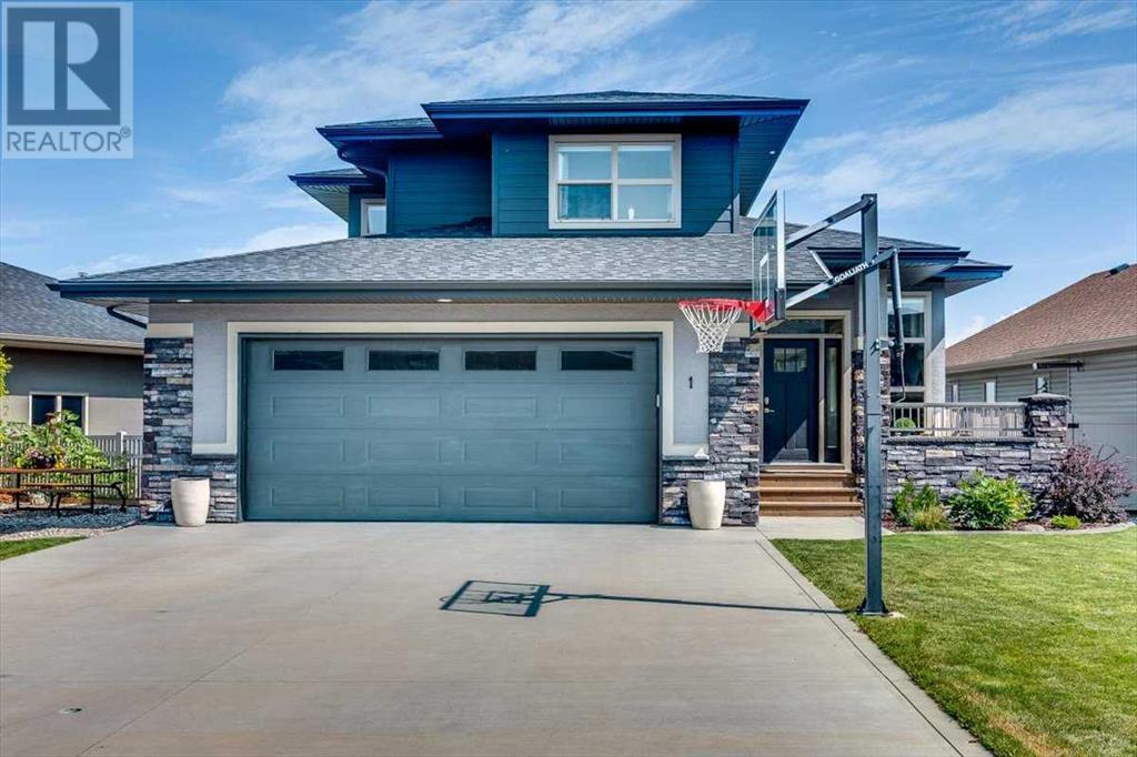 As you approach 1 Meadow Close, you'll notice a manicured front yard, large driveway with a permanent basketball hoop, and an extended ultra-organized garage! It includes a custom woodworking area, tv, sink, and exemplary storage for all of your sporting goods. From the garage you'll be able to enter a convenient mudroom/laundry room with 6 lockers with shelving below, two storage closets, and laundry basket shelving and hanging racks. The main entrance leads into a spacious foyer and an expansive main floor. You'll be welcomed into this home with cathedral ceilings and inviting great room with a floor to ceiling, stone, gas fireplace. The kitchen boasts a large island, top of the line stainless steel appliances, beautiful quartz countertops, a pot filler, a full-lite door leading to the upper no-maintenance deck, and a massive window overlooking green space and offering gorgeous sunrise views all year around. The main floor also features the primary bedroom suite with a large walk-in closet, dual sink vanity, double headed tile shower, and more than enough floor space for a king sized bed and a sitting area. The main floor also features a comfortable guest half bath. An open railing staircase leads to an upper floor with a spacious landing that overlooks the main floor, two storage closets, two spacious bedrooms, and a double vanity 4 piece bath. Downstairs you'll find a bright open area fit for a large entertainment unit and gaming area that's equipped with a wet bar. The open family space features a door out to the lower covered patio area and hot tub, where you can enjoy starry skies as you soak in the warmth. Three bedrooms and a third full bath round out the basement. In addition to the incredible interior of this home, the backyard is both practical and pristine. Quality built wooden stairs provide easy access along the house towards the front of the property. Aside from the large covered concrete patio and open area with the hot tub, there are several attractive garden boxes, an upper grassy area, immaculate perennial gardens with natural stone steps leading to the yard's lower tier, retaining wall and a large fire pit and sitting area. The luscious grass is perfect to play on and a low-maintenance space for your trampoline. The backyard is enclosed with vinyl fencing that leads out to the open grassy area where you can access the community garden and Essex Park's baseball diamond and playground. This is easily one of the nicest properties available in Lacombe! (id:22211)