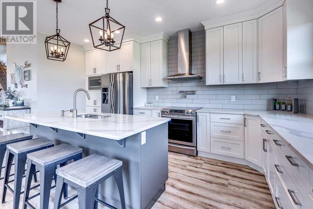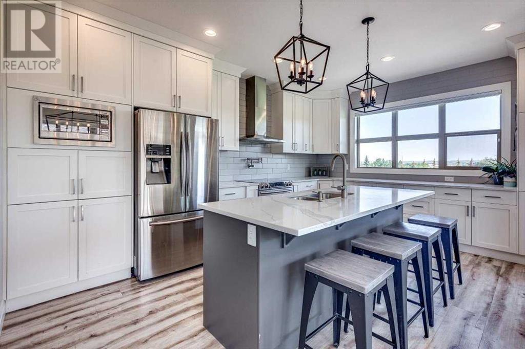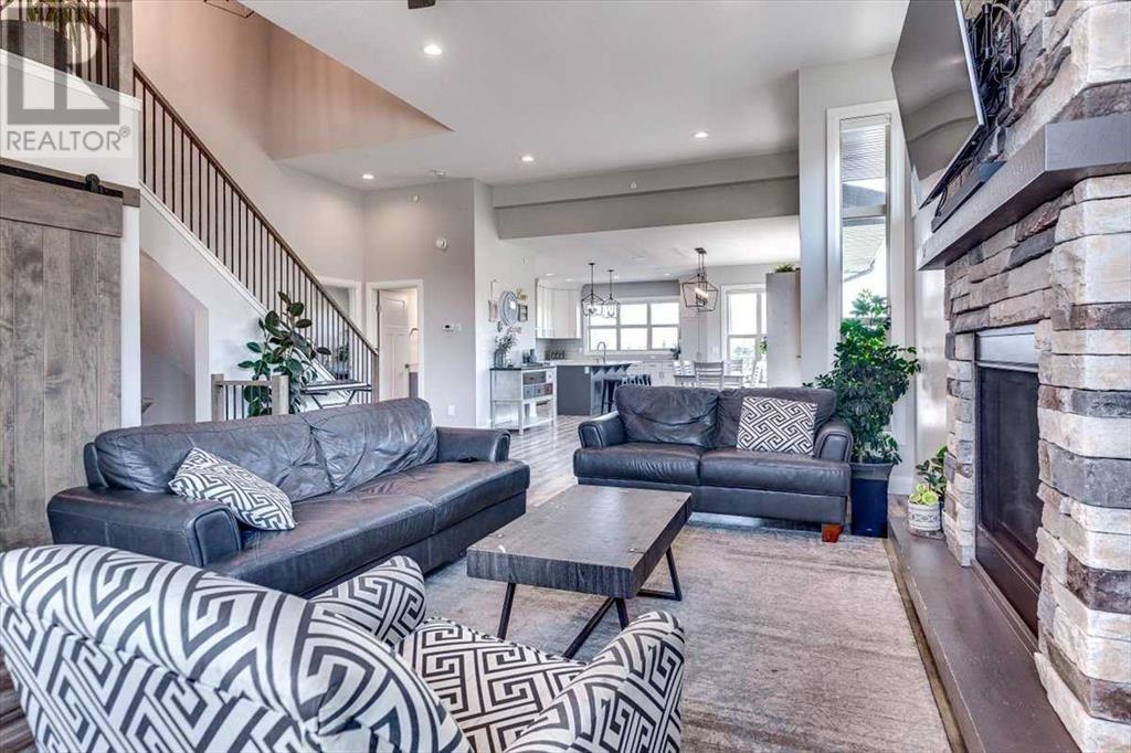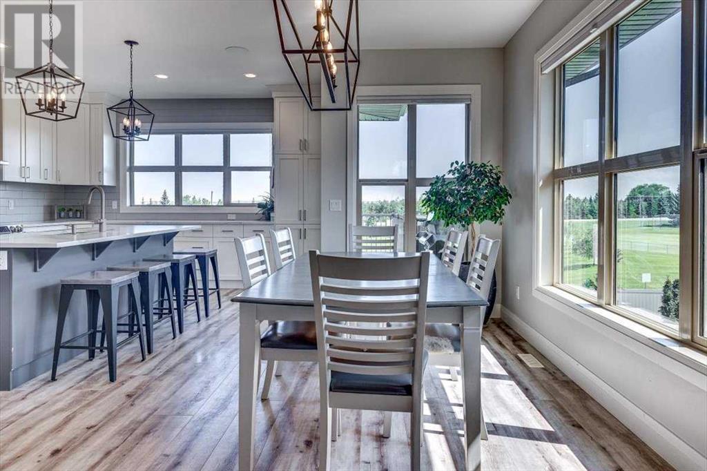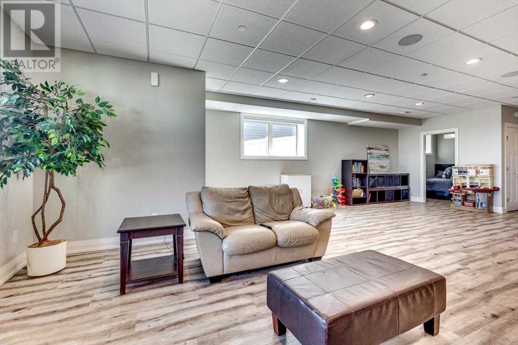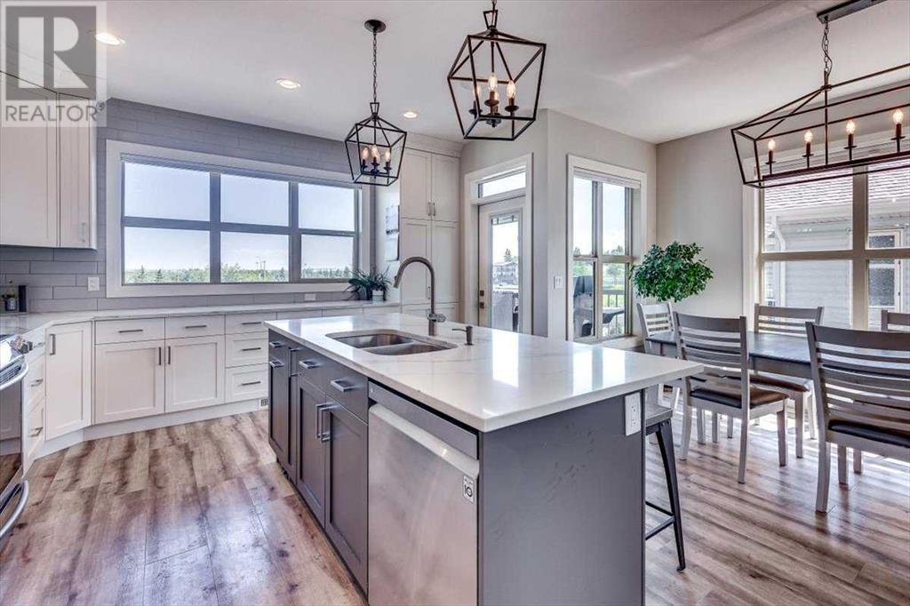 As you approach 1 Meadow Close, you'll notice a manicured front yard, large driveway with a permanent basketball hoop, and an extended ultra-organized garage! It includes a custom woodworking area, tv, sink, and exemplary storage for all of your sporting goods. From the garage you'll be able to enter a convenient mudroom/laundry room with 6 lockers with shelving below, two storage closets, and laundry basket shelving and hanging racks. The main entrance leads into a spacious foyer and an expansive main floor. You'll be welcomed into this home with cathedral ceilings and inviting great room with a floor to ceiling, stone, gas fireplace. The kitchen boasts a large island, top of the line stainless steel appliances, beautiful quartz countertops, a pot filler, a full-lite door leading to the upper no-maintenance deck, and a massive window overlooking green space and offering gorgeous sunrise views all year around. The main floor also features the primary bedroom suite with a large walk-in closet, dual sink vanity, double headed tile shower, and more than enough floor space for a king sized bed and a sitting area. The main floor also features a comfortable guest half bath. An open railing staircase leads to an upper floor with a spacious landing that overlooks the main floor, two storage closets, two spacious bedrooms, and a double vanity 4 piece bath. Downstairs you'll find a bright open area fit for a large entertainment unit and gaming area that's equipped with a wet bar. The open family space features a door out to the lower covered patio area and hot tub, where you can enjoy starry skies as you soak in the warmth. Three bedrooms and a third full bath round out the basement. In addition to the incredible interior of this home, the backyard is both practical and pristine. Quality built wooden stairs provide easy access along the house towards the front of the property. Aside from the large covered concrete patio and open area with the hot tub, there are several attractive garden boxes, an upper grassy area, immaculate perennial gardens with natural stone steps leading to the yard's lower tier, retaining wall and a large fire pit and sitting area. The luscious grass is perfect to play on and a low-maintenance space for your trampoline. The backyard is enclosed with vinyl fencing that leads out to the open grassy area where you can access the community garden and Essex Park's baseball diamond and playground. This is easily one of the nicest properties available in Lacombe! (id:22211)