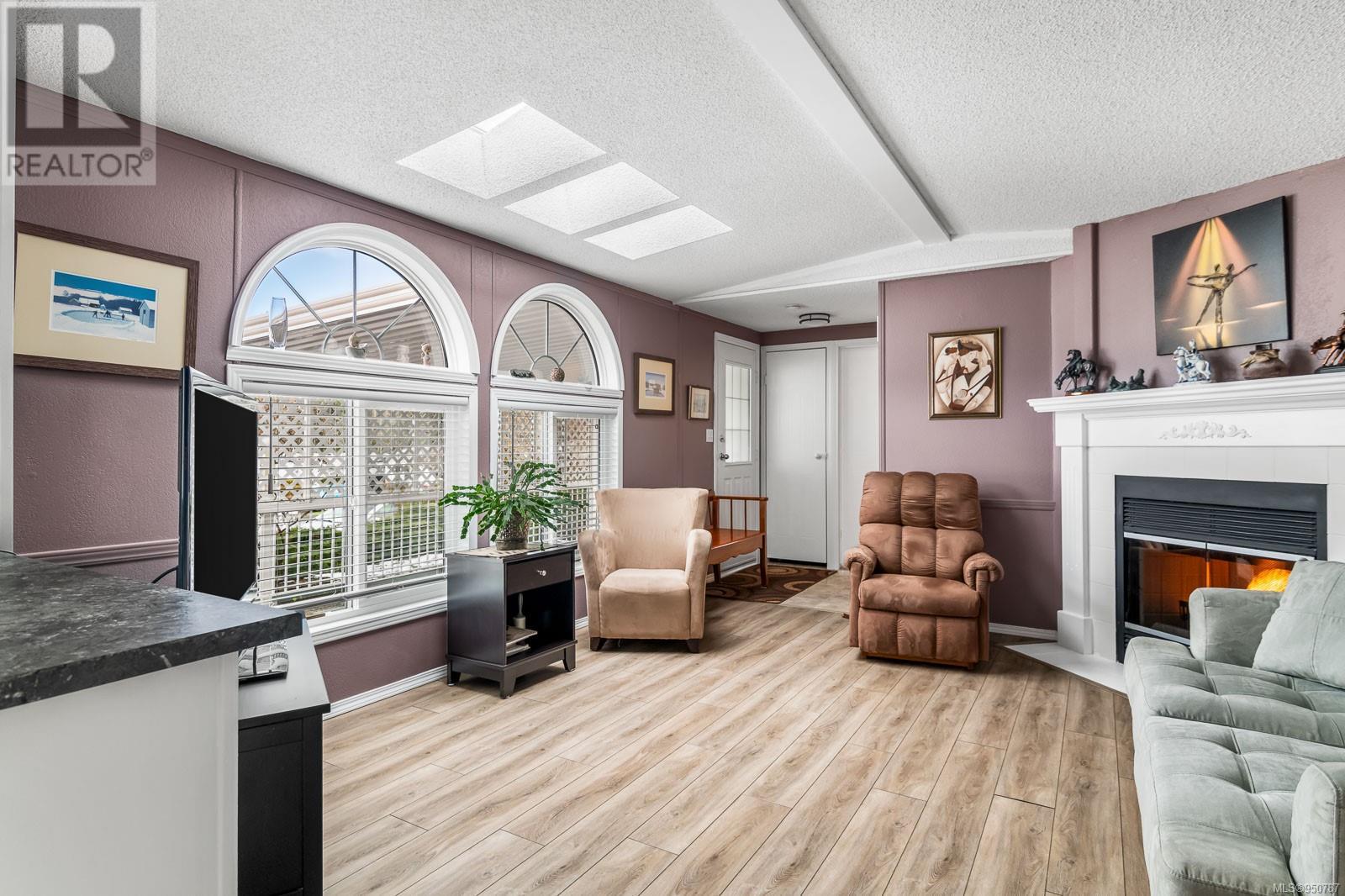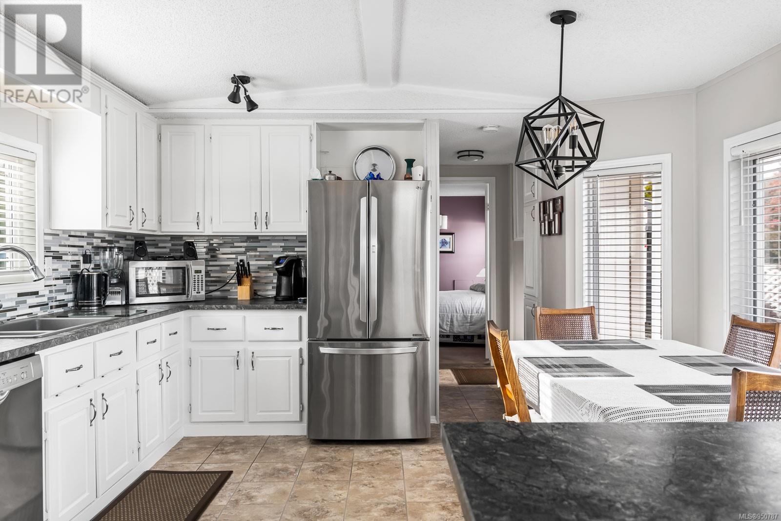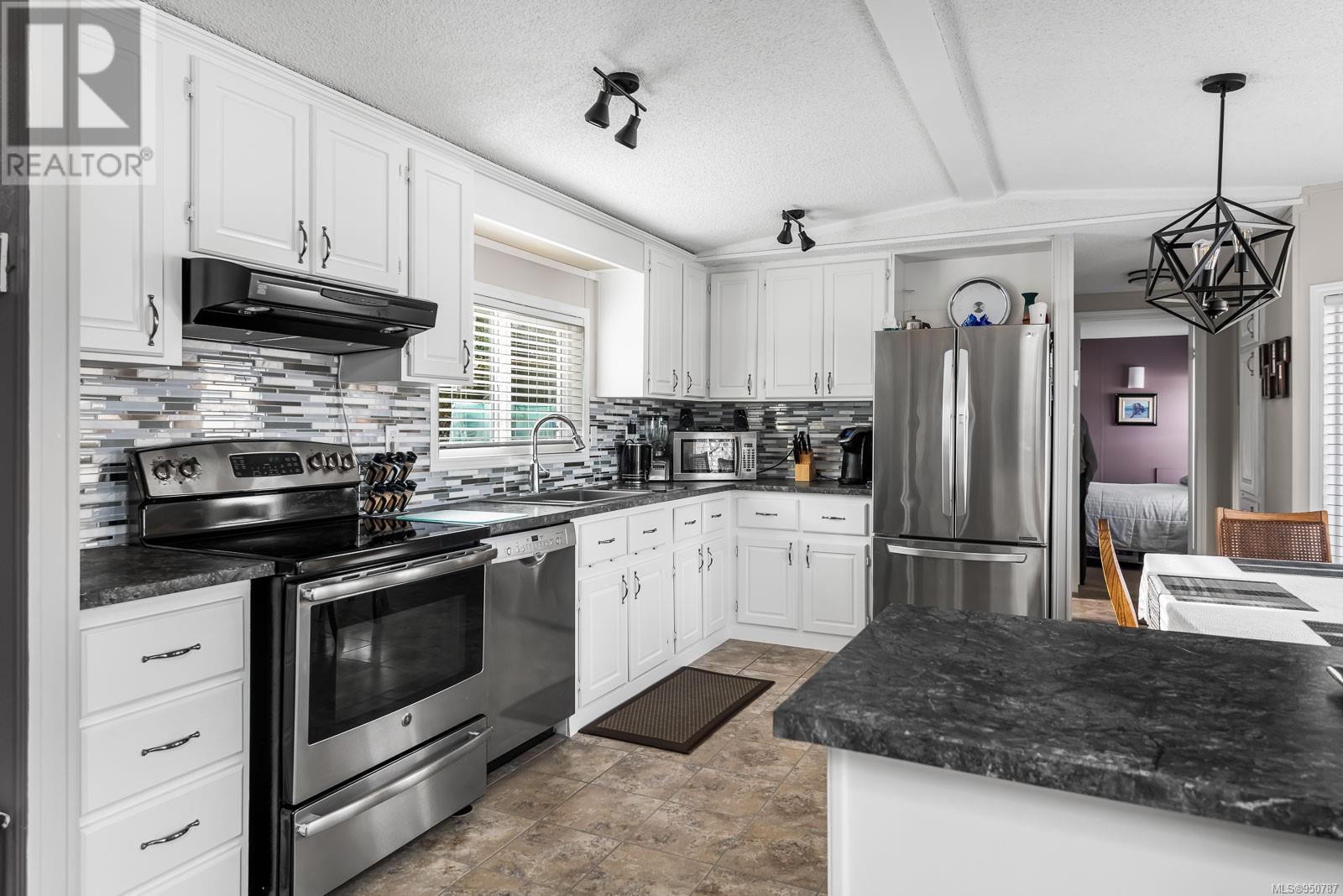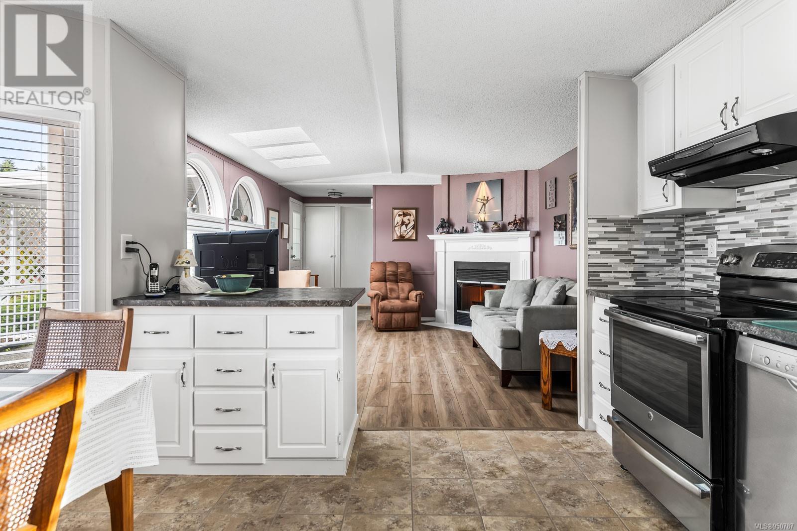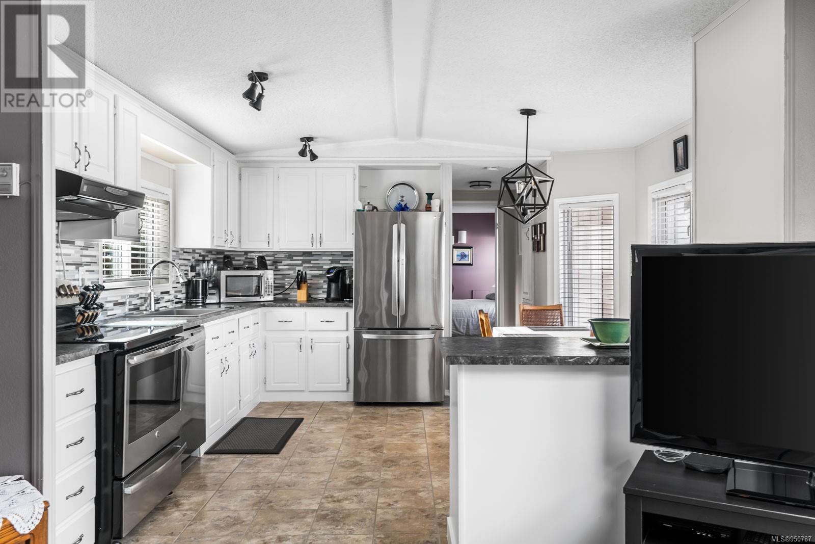 Easy living awaits you in this immaculate 2-bed, 2-bath home! This modern feel, open-concept design home floods the interior w/ natural light. Primary bedroom is very private, & features large closets, & a 5-pc ensuite. Spacious kitchen & dining area is open to the bright living room. Gas fireplace & furnace makes for low cost, economical utilities. Second bedroom is located opposite end to the primary, ensuring total privacy. The laundry room is conveniently located next to the kitchen, w/ an ample pantry & storage. Step outside to discover a well-maintained, low-maintenance yard featuring paved patio w/ awning for those sunny evening gatherings, covered carport, & detached shed for extra storage! This home truly is the complete package for comfortable, modern living in Ladysmith. One dog (15kg or less) allowed w/ park approval. 2 cats may be permitted unless there is also a dog, in which case only one cat may be allowed. (Cats must be indoor only). Don't miss out on your ideal home! (id:22211)