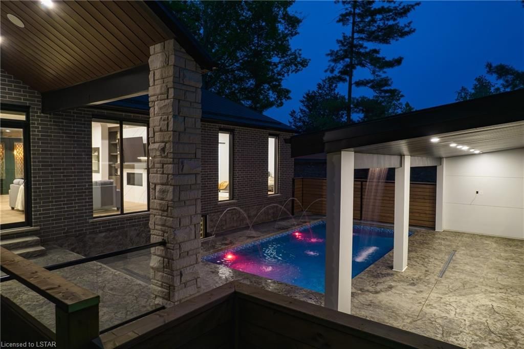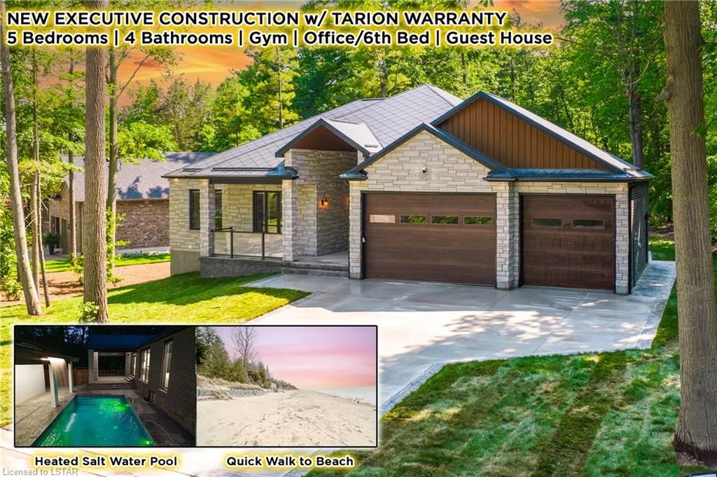 NEW CONSTRUCTION IN GRAND BEND MATCHELSS & STUNNING BEYOND COMPARE EXECUTIVE LEVEL LUXURY UNPARALLELED FEATURES & QUALITY HEATED SALT WATER POOL W/WATERFALL GUES HOUSE 6 BEDROOMS,4 BATHROOMS,GYM,2 BARS,3 CAR GARAGE-THE HIT LIST IS ENDLESS!IN TERMS OF NEW CONSTRUCTION BY THE BEACH IN GRAND BEND,THIS SUPRASSES AS GOOD AS IT GETS.THIS EXCEPTIONAL CUSTOM MASTERPIECE COURTESY OF RENOWNED BUILDERS GOLD ROCK HOMES IS A DEFINITIVE EXAMPLE OF THE PHARASE "NEXT LEVEL:.AS A ONE OF A KIND FAMILY HOME OR PREMIUM COTTAGE,THIS IS A HOSUE THAT MUST BE SEEN TO GAIN AN UNDERSTANDING OF THE TRUL REMARKABLE STYLE & SUPERIOR CONSTRUCTION & FINISHING.THE ATTENTIVE & CREATIVE EXPERT BUILDER DIND'T MISS A THING!THIS BRAND NEW HOME COMES COMPLETE W/A PREMIUM APPLIANCE PACKAGE,MOVIE THEATRE SEATING & HIFI PACKAGE,& A 7YEAR TARION NEW HOME WARRANTY AMONG MANY OTHER EXTRAS.FROM THE SECOND YOU PULL INTO THE PROPERTY,YOU'LL NOTICE A PLETHORA OF COMPLIMENTS UNIQUE TO THIS HOME & GERALLY UNFOUND INTHE GRAND BEND RESMARKETPLACE,THE EXCELLENT COMINATION OF BRICK & NATURAL STONE SURROUNDS THE ENTIRE HOUSE,A FINISH THAT IS FLAWLESSLY ACCENTED BY THE 100% CUSTOM STEEL WORK IN ALL OF THE GABLES & SOFFITS