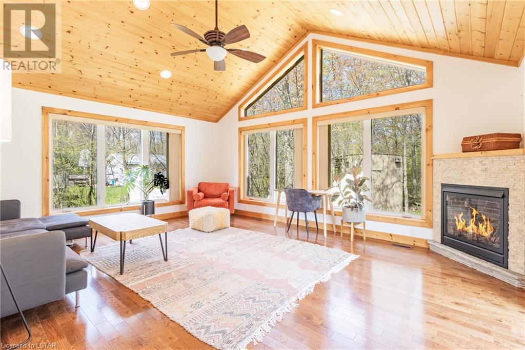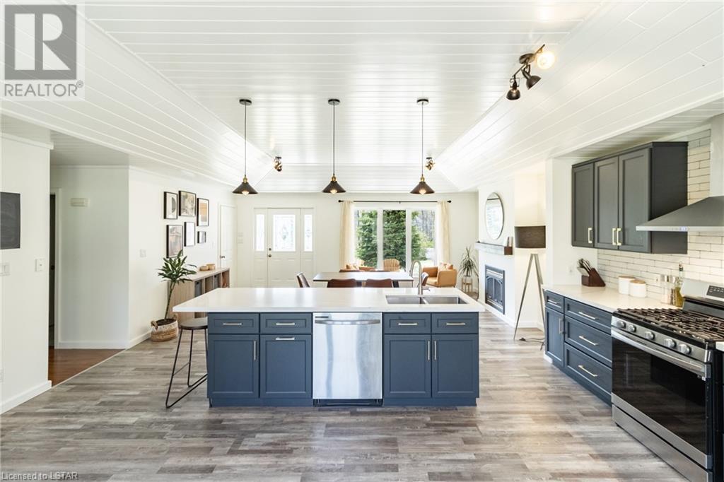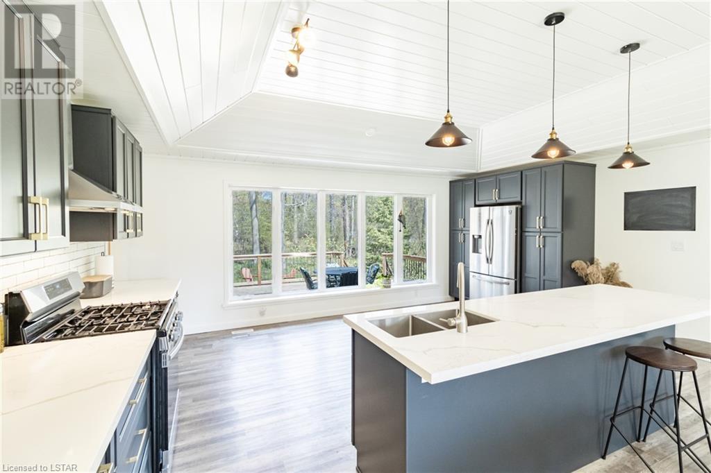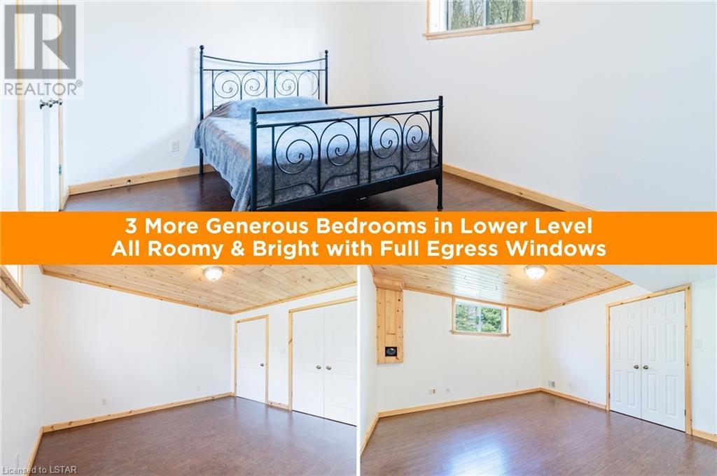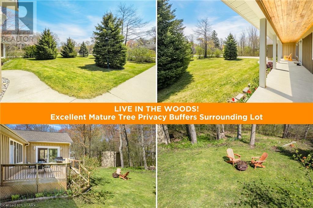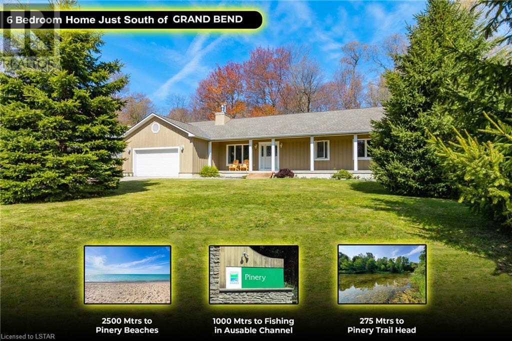 GRAND BEND AREA 6 BEDROOM DAZZLER | YOUNGER HOME COMPLETELY RENOVATED FROM TOP TO BOTTOM | NEARLY 3500 SQ FT OF EPIC LIVING SPACE ON A SECLUDED 1/2 ACRE LOT STEPS TO PINERY TRAILS & SANDY BEACHES: The amazing spaces & large principal rooms in this well-built ranch style bungalow will blow your mind! Let's start with the BRAND NEW custom kitchen & the included updated appliances intelligently laid out for maximum cabinet space in a vast open-concept room. This airy kitchen/dining/living area frames in panoramic views of mature woods on both ends w/ the dual-sided wall to wall windows. This show-stopping space also features a vaulted tray ceiling finished w/ shiplap & a gas fireplace, which is 1 of 3 fireplaces in this sprawling ranch. The 3 large main level bedrooms & 2 updated bathrooms, including a master with ensuite bath, are flooded w/ natural glistening off the hardwood flooring on the daily. The gorgeous knotty pine chalet style sunroom, w/ it's vaulted ceilings over hardwood floors & 2nd main level gas fireplace, walks out to a fantastic sun deck w/ black spindled railings leading to your extremely private backyard. The large laundry/mud room over tile flooring w/ inside entry from the double-deep 2 car insulated garage completes a very impressive main level package. The lower level provides another 3 roomy bedrooms, a 3rd full bath w/ a stellar tile shower, a massive family room w/ a wood fireplace (firewood included) + loads of storage. The 3436 sq ft of impeccably finished living space is peppered w/ new light & plumbing fixtures, loads of updated flooring & a fresh paint job w/ a total of 3715 sq ft of floor space counting the oversized cold room (ideal wine cellar/tasting room). All of this amazing space is in phenomenal condition below a 2021 roof & serviced by a full-house gas generator. The massive concrete driveway provides loads of parking for all the toys. Steps to sandy beaches in the Pinery & just south of everything you need in Grand Bend! (id:22211)