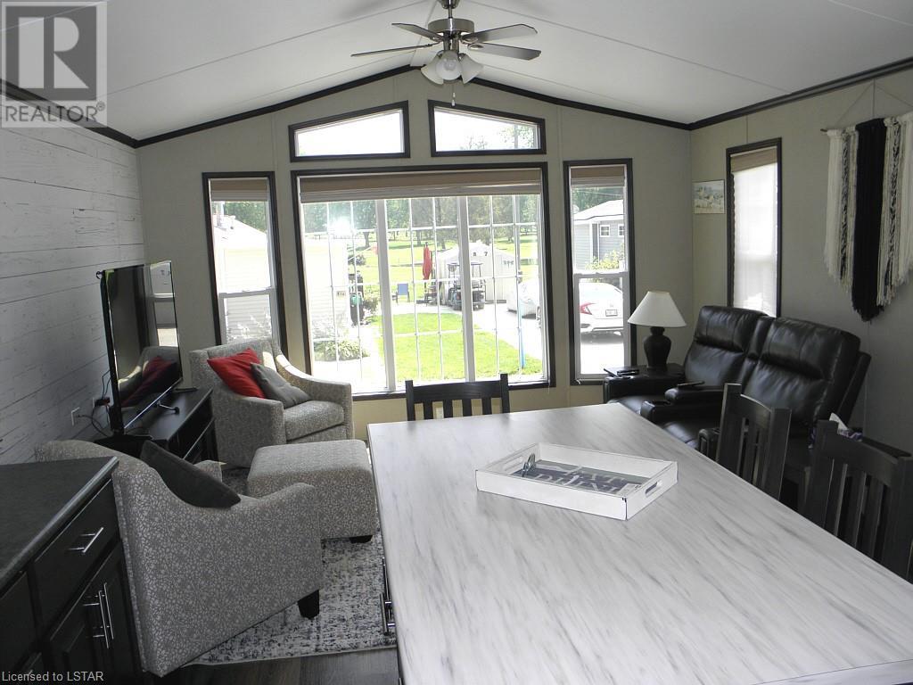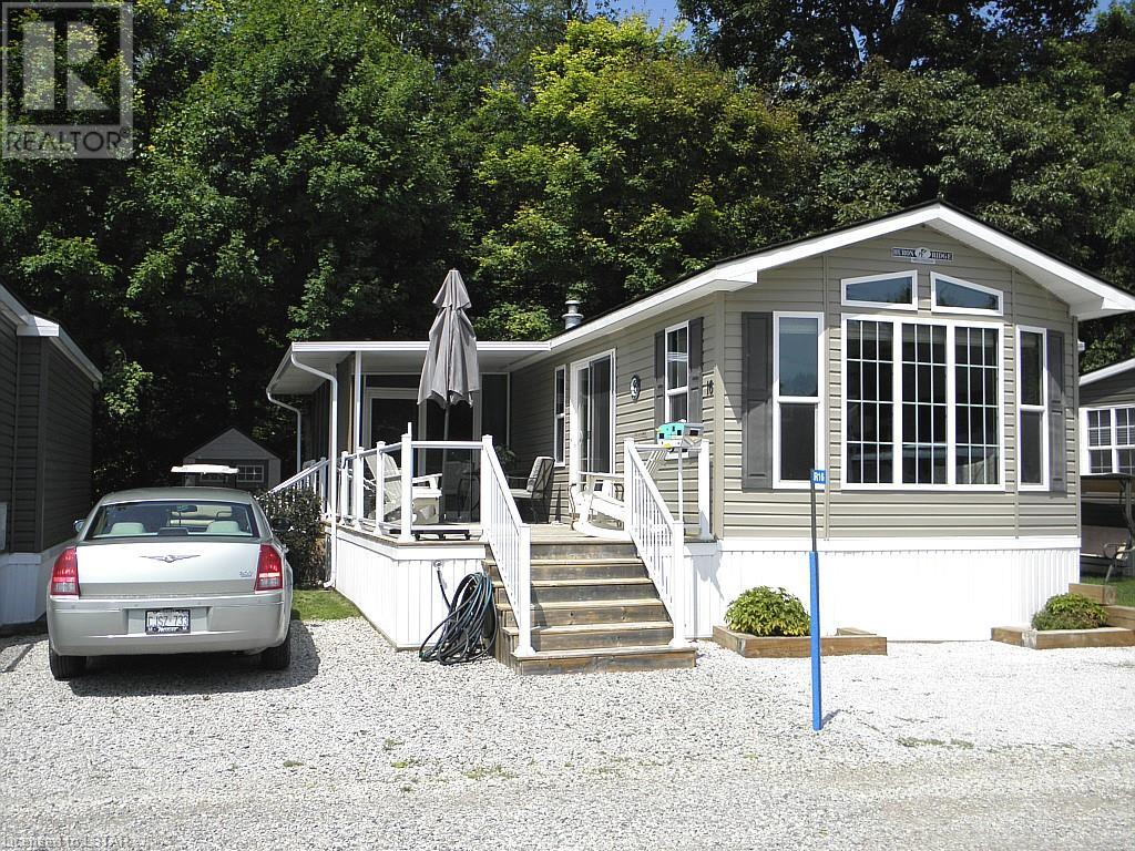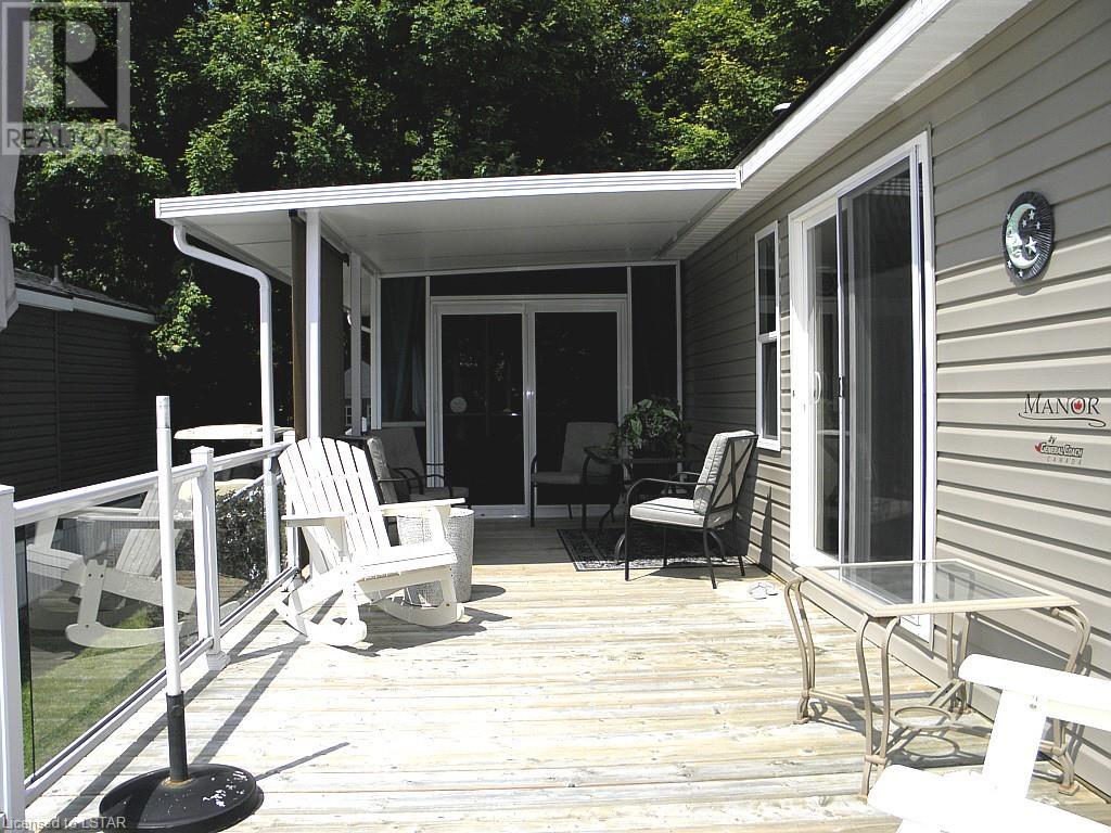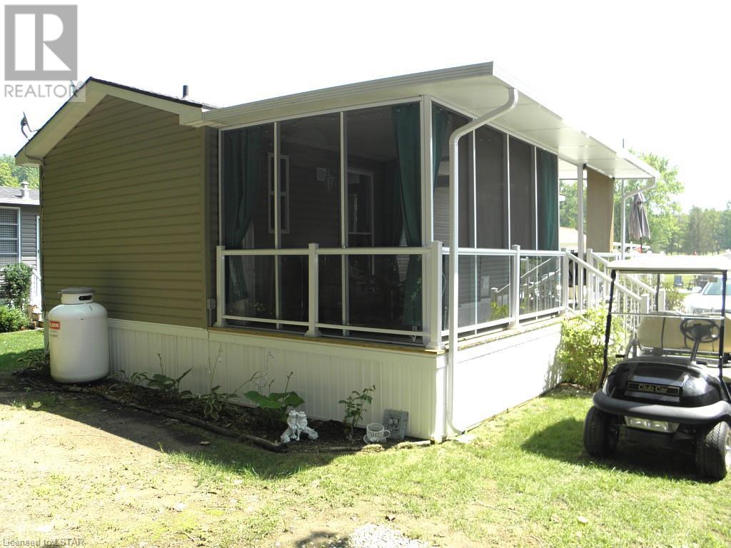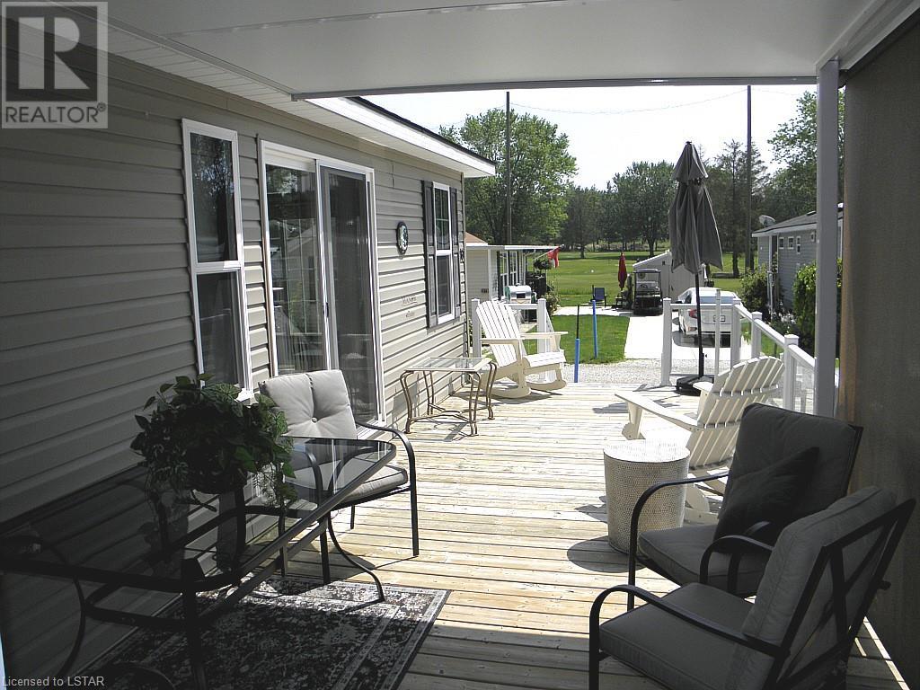 Top of the line 14 x 40 foot Huron Ridge Manor Melrose Model built 2017 modular home located in the back of Our Ponderosa Cottage & RV Park 1 mile from Ipperwash Beach. The 45' x 100' lot is landscaped & backs to treed nature area. Open concept Living Room/Kitchen with a view of the golf course. Vaulted ceiling in kitchen and living room, 2 bedrooms, master has queen size bed, second bedroom has built-in bunk beds, 4 piece main bath with tub. Lots of cabinets and island in the kitchen with propane stove, stainless steel fridge, built-in microwave. Sliding doors from kitchen to covered deck plus an open deck area all view golf course across the road, Screen room off the covered deck views the wooded area at the rear. Laminate floors thru out, forced air heating with central air, hot water heater is owned. The decks all have plexiglass panels. Covered deck is 10' x 9' 7, open deck is 16' x 9' 7. There is a vinyl shed at the rear and private sitting area with a fire pit. Our Ponderosa Cottage & RV Park offers so many amenities including a 9 hole golf course, horseshoe pits, adult outdoor fitness equipment, adult swimming pool, hot tub, kids swimming pool with water slide. Note no extra charge for guests, park fee of $4,800 per season plus HST is for 6 months includes water and golf. Our Ponderosa Resort has something for everyone, from swimming to golfing and is just a few minutes from the beach, activities include: Heated family pool with 78' water slide for all ages. (id:22211)