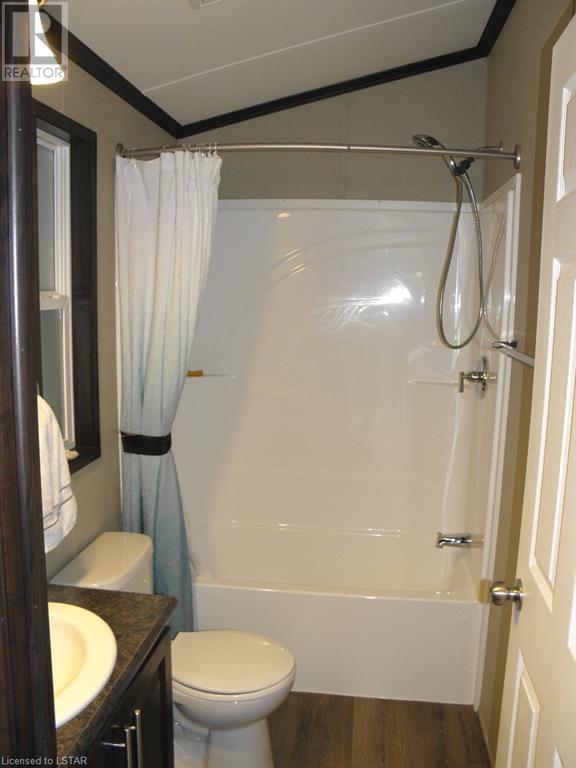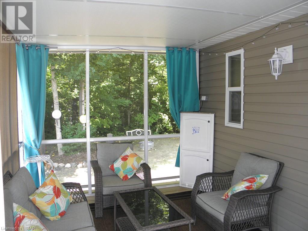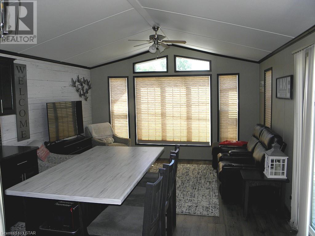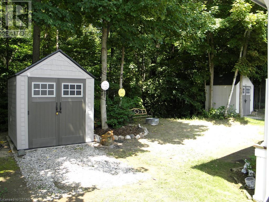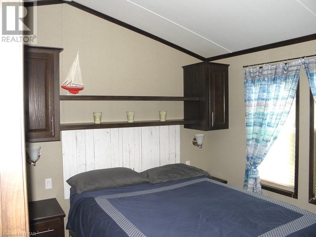 Top of the line 14 x 40 foot Huron Ridge Manor Melrose Model built 2017 modular home located in the back of Our Ponderosa Cottage & RV Park 1 mile from Ipperwash Beach. The 45' x 100' lot is landscaped & backs to treed nature area. Open concept Living Room/Kitchen with a view of the golf course. Vaulted ceiling in kitchen and living room, 2 bedrooms, master has queen size bed, second bedroom has built-in bunk beds, 4 piece main bath with tub. Lots of cabinets and island in the kitchen with propane stove, stainless steel fridge, built-in microwave. Sliding doors from kitchen to covered deck plus an open deck area all view golf course across the road, Screen room off the covered deck views the wooded area at the rear. Laminate floors thru out, forced air heating with central air, hot water heater is owned. The decks all have plexiglass panels. Covered deck is 10' x 9' 7, open deck is 16' x 9' 7. There is a vinyl shed at the rear and private sitting area with a fire pit. Our Ponderosa Cottage & RV Park offers so many amenities including a 9 hole golf course, horseshoe pits, adult outdoor fitness equipment, adult swimming pool, hot tub, kids swimming pool with water slide. Note no extra charge for guests, park fee of $4,800 per season plus HST is for 6 months includes water and golf. Our Ponderosa Resort has something for everyone, from swimming to golfing and is just a few minutes from the beach, activities include: Heated family pool with 78' water slide for all ages. (id:22211)
