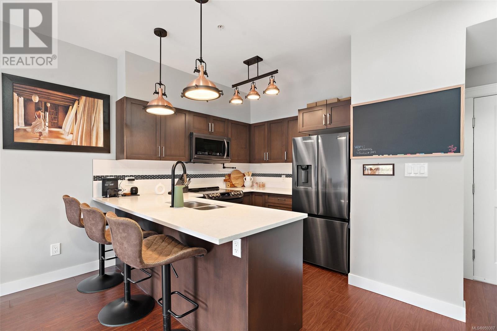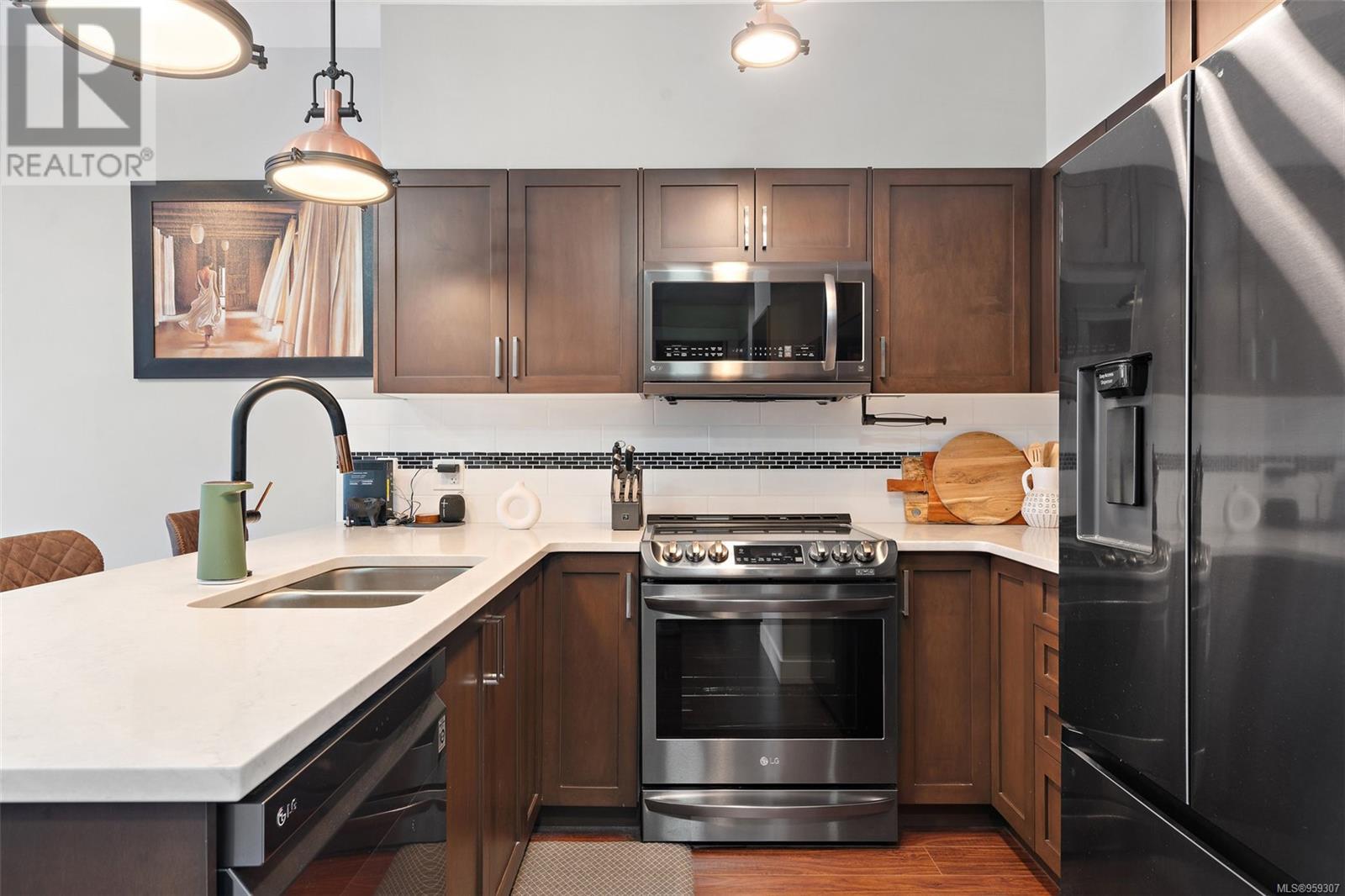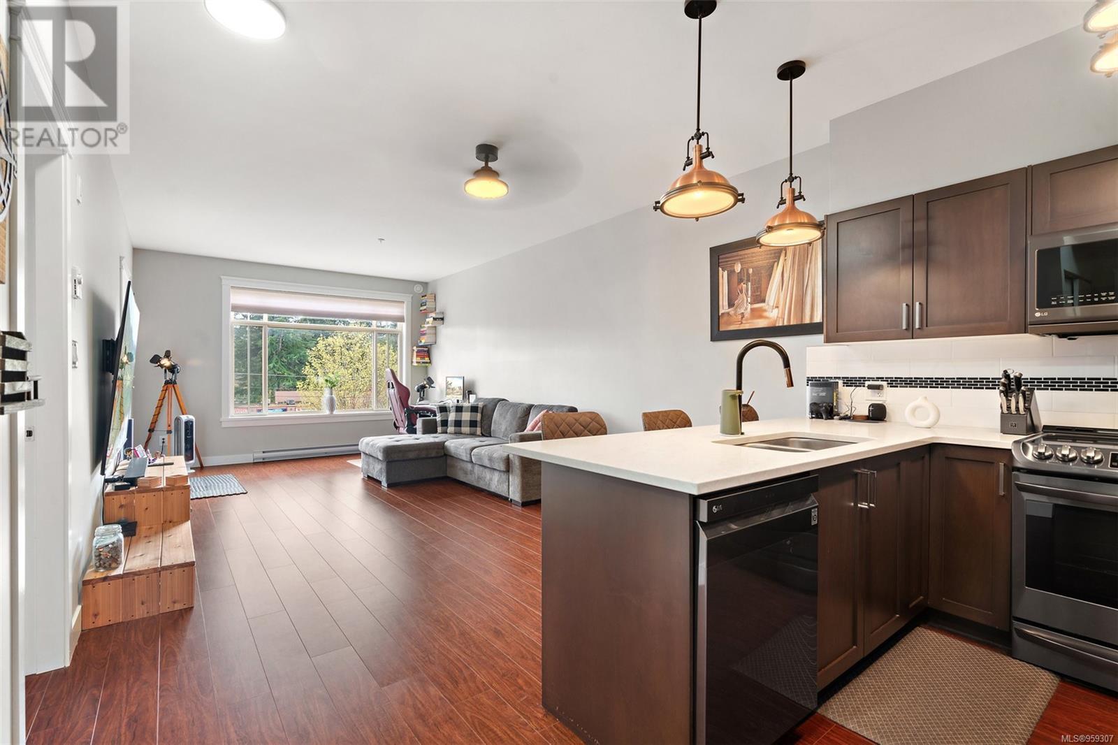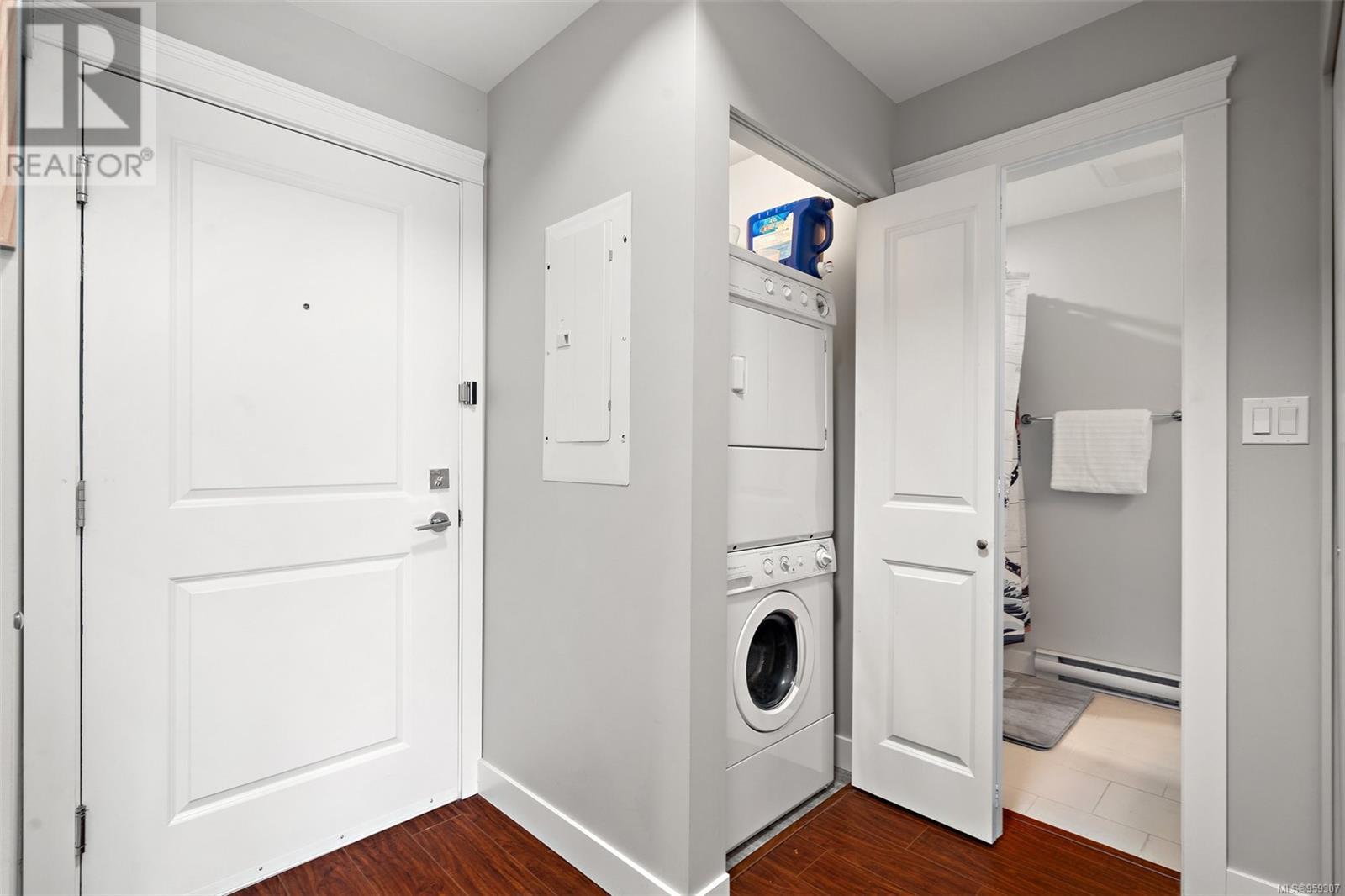 Welcome to the convenience and comfort of this beautiful 1 bedroom condo. Located in the heart of Langford, near your choice of dining, shopping, transit and soon to be University.... This location truly has it all! Enjoy the updated 1 bedroom 1 bathroom condo with its open concept Kitchen-Living-Dining space with 9 foot ceilings and stylish black stainless steel appliances. Savour sipping your morning coffee out on your own private balcony overlooking Goldstream avenue and your take advantage of your own in suite laundry to ensure all the conveniences are covered. Unit comes with a covered, secured parking stall below the building. This is your opportunity to take advantage of the central convenient location, the modern finishes of the condo and the amazing price of our offering! Call your Realtor today! (id:22211)