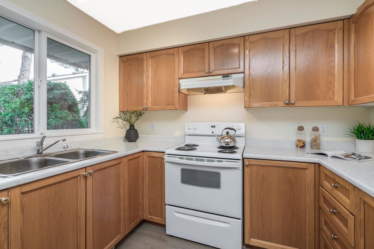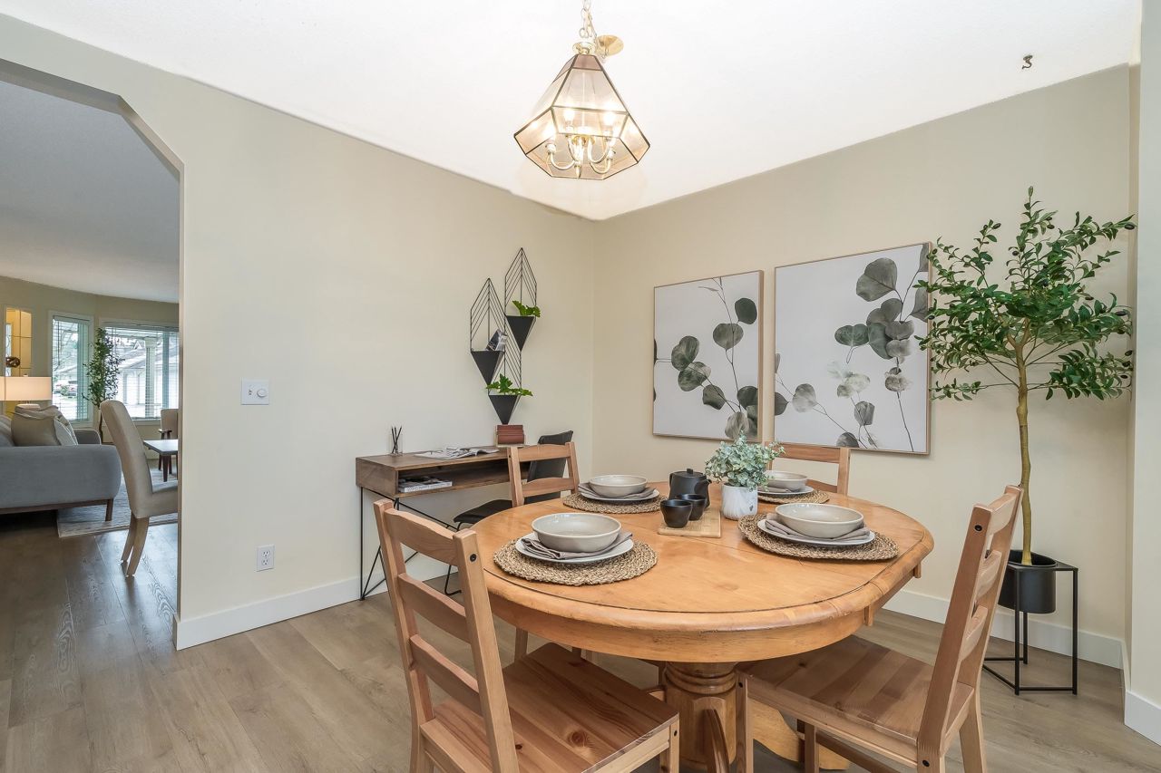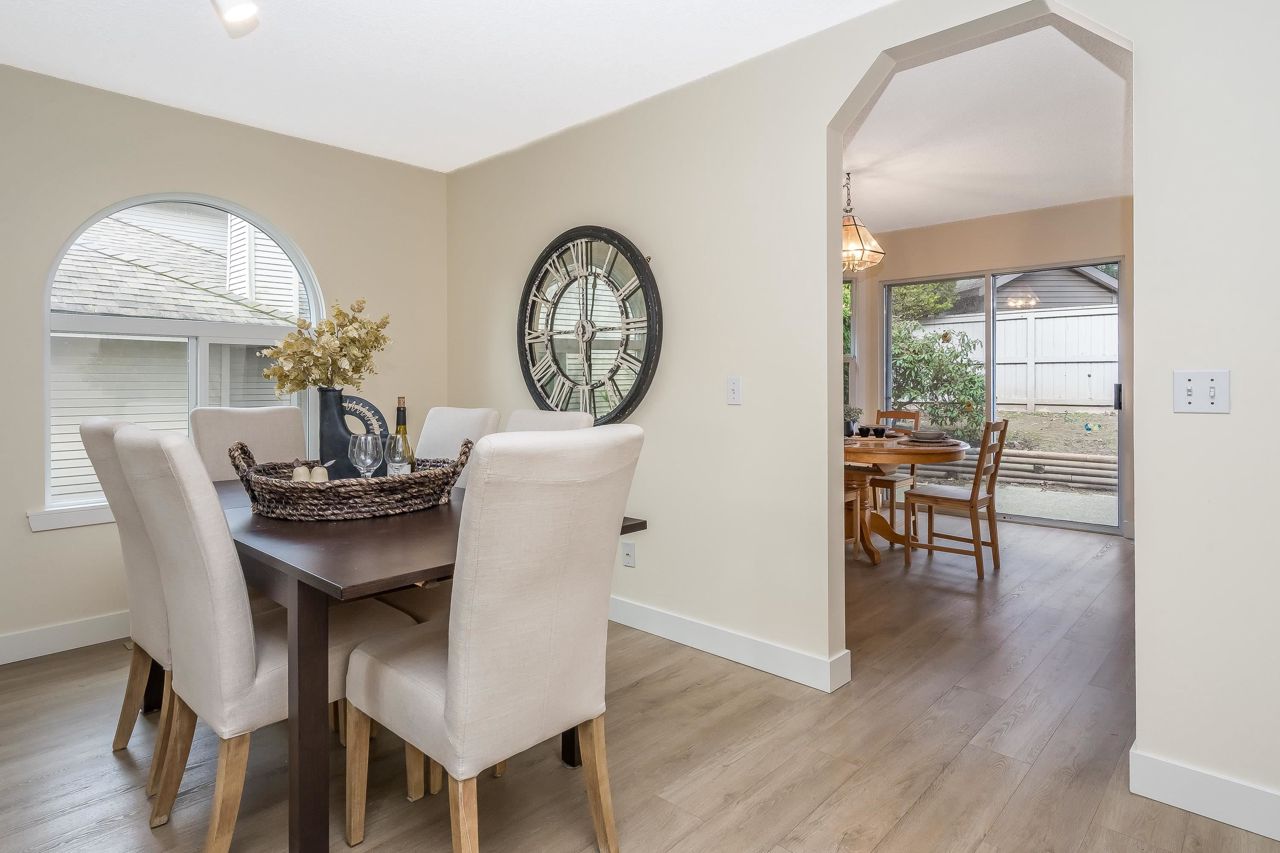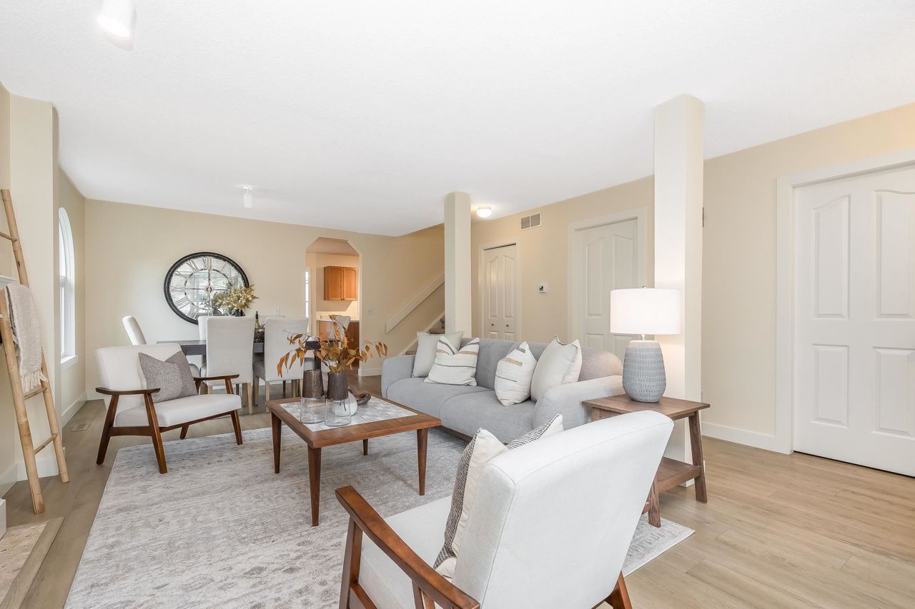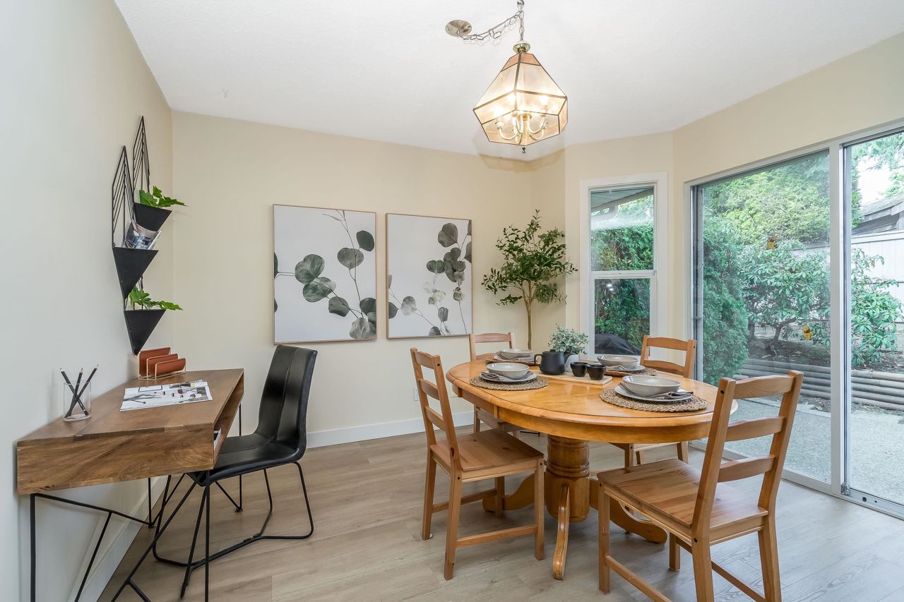 FANTASTIC 2 STORY END UNIT! This 3 Bed, 2.5 Bath, 1,599 sqft home is tucked away at the back of the complex for the ultimate peace & quiet. Enjoy your peaceful & sunny yard with direct access from the kitchen! UPDATES: Laminate floors & underlay on the main, fresh paint throughout, New furnace 2023, New windows, sills, casings & blinds, H/W Tank 2020, some fixtures, & a new front door and back sliders are being installed. Your sunny kitchen has an updated laminate countertop, large eating area, & a window over the sink. 3 spacious bedrooms up, with a partial mountain view from your Primary Suite. Loads of storage, bonus crawlspace, plus parking for 2 vehicles with a single garage & 2nd space. Walk to transit, schools, groceries, restaurants, pool, library, athletic park, gym & more!