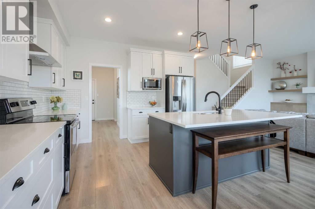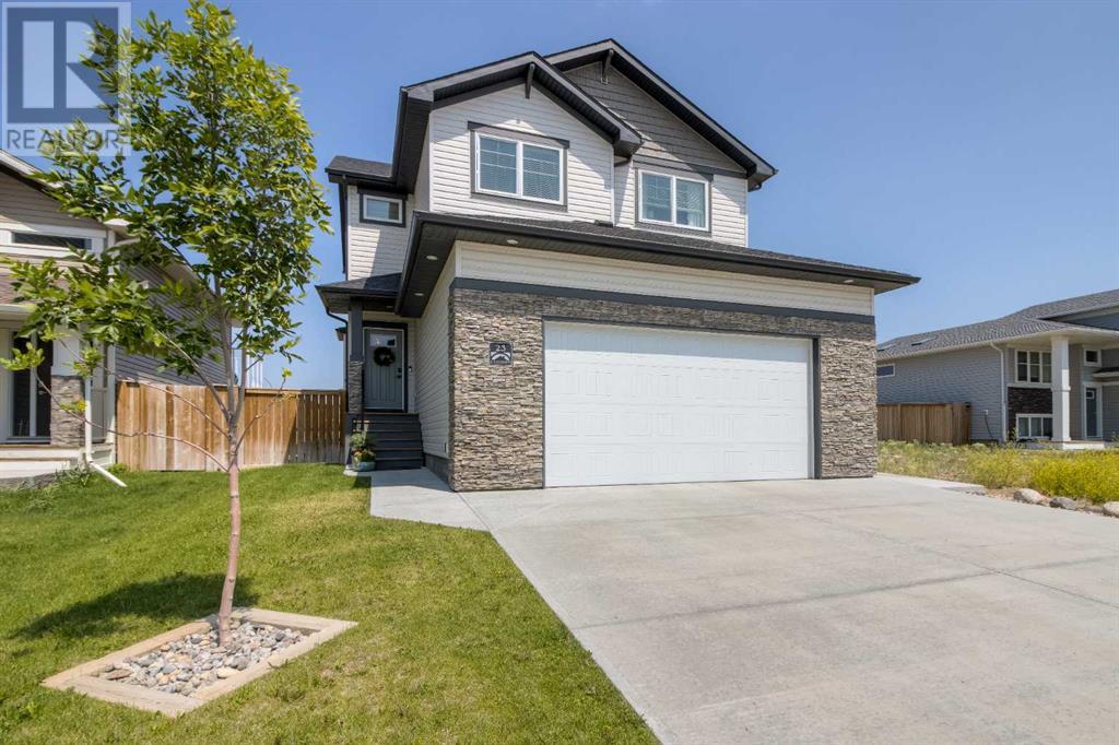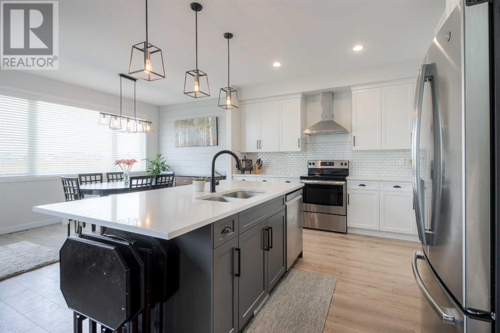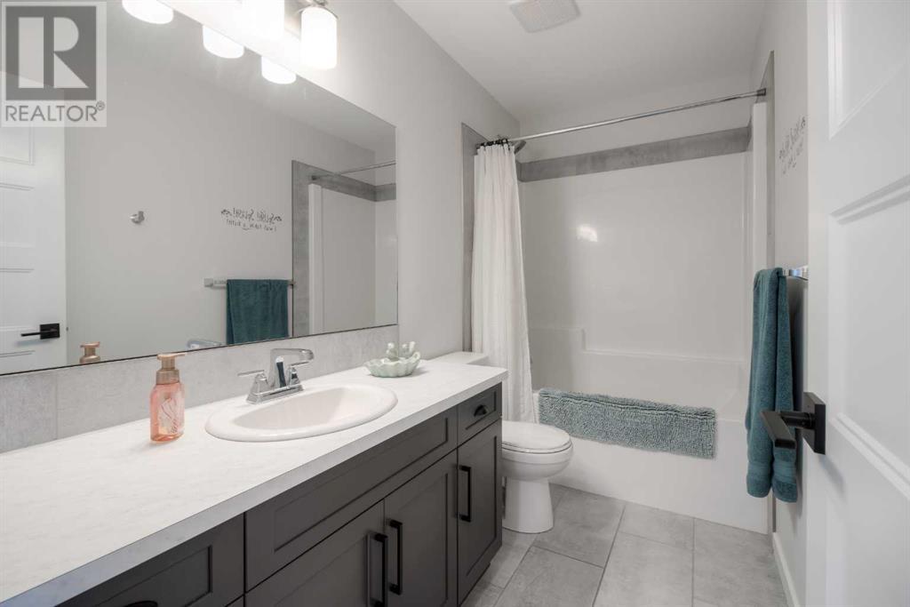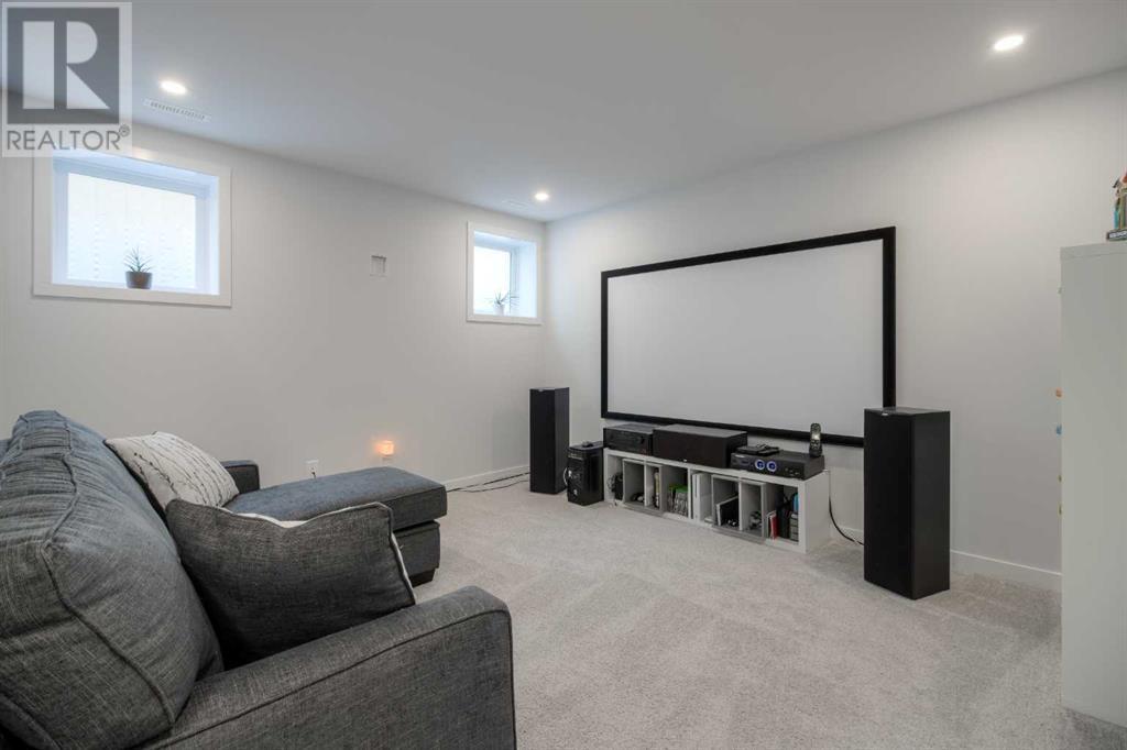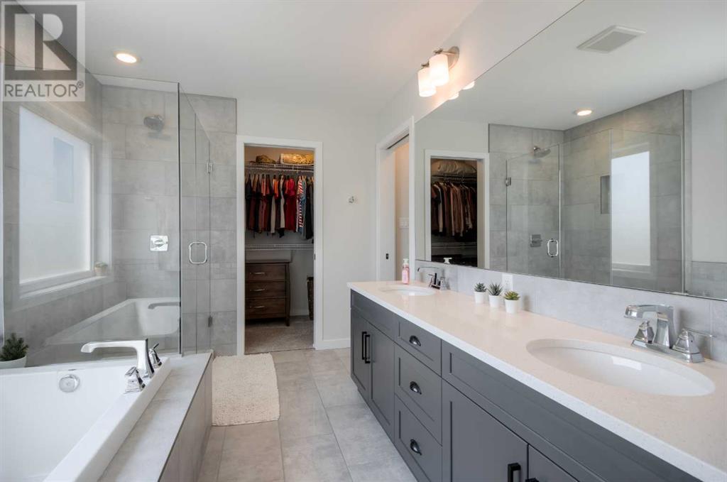 Simply stunning is one way to describe this former Galko show home in RiverStone! Located steps away from the dog park and quick jaunt to coulee walking trails, this beautifully maintained and scrupulously clean home definitely stands out. Being a former show home, there are lots of thoughtful upgrades and features complete with high-end, workmanship and contemporary finishings. As soon as you walk into the spacious foyer, you will notice the thoughtful design of this home: a walk-through closet that connects the front foyer to garage entry, 9' ceilings, abundance of natural light through oversized windows and Hunter Douglas blinds. This home features a kitchen that even the most discerning chef would appreciate! Complete with ample amount of counterspace, quartz counters, and soft-close drawers and doors. The walk-through butler's pantry to garage make grocery unloading a breeze. Upstairs boasts a large primary suite with generous sized walk-in closet and spa-like ensuite that includes dual sinks, deep soaker tub, and custom glass shower. Completing the upper lever are two additional large bedrooms, bonus living room, and conveniently located laundry room. Downstairs you will find a theatre room, two more generous sized bedrooms and full bathroom with large shower. Outside is landscaped and outfitted with a multi-zone underground sprinkler system. The oversized, finished garage is heated and includes epoxy coated floor. Enjoy the summer evenings sitting on your deck or have some fun on your personal basketball court, complete with adjustable Goliath net. There is simply nothing left for you do other than move in and enjoy! (id:22211)