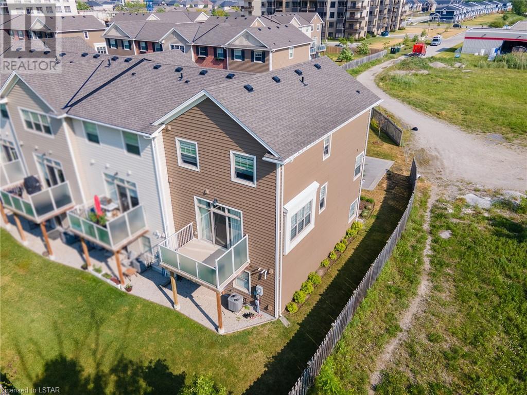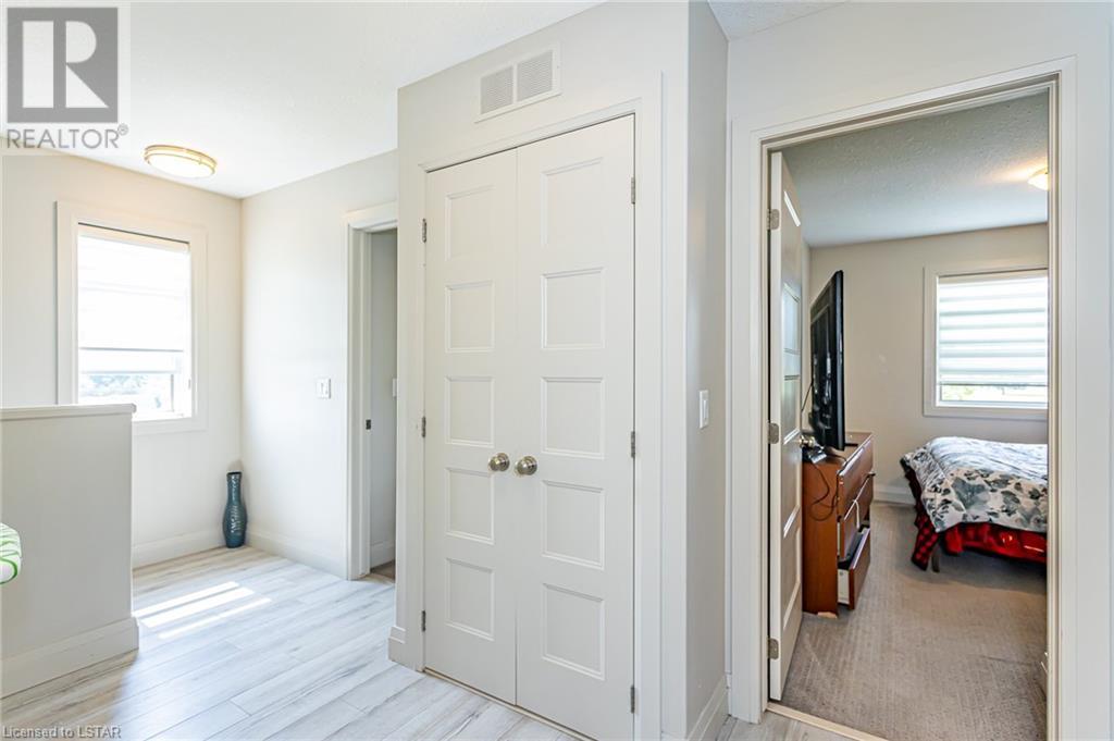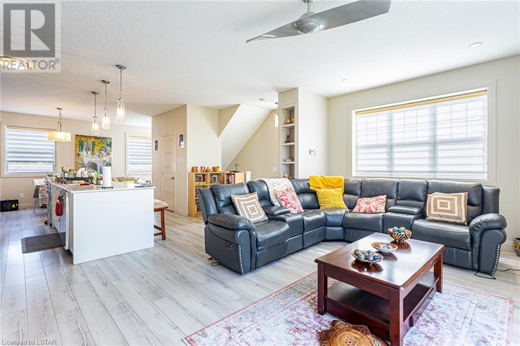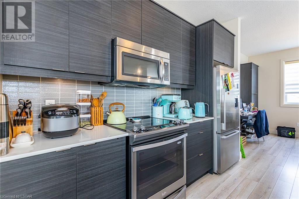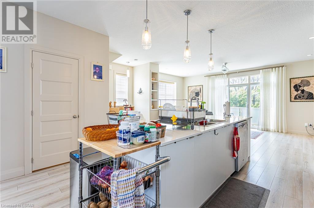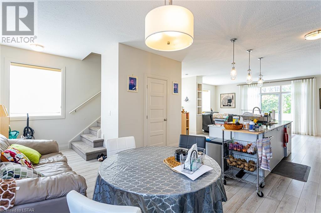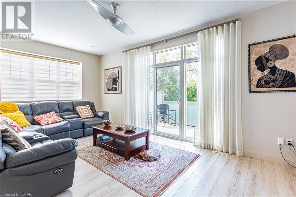 2 CAR TANDEM GARAGE END UNIT! This Luxurious 3 Bed, 2.5 Bath Townhouse is located in one of the most sought after areas of North London. With over 1800sqft of total space, this 3-storey modern home with 9ft ceilings throughout has been dressed to the nines. Walk directly into your heated tiled floor foyer from your 2 car garage and head upstairs to your open concept living and dining area. Walk-out to your balcony and enjoy entertaining friends with your Gas BBQ while overlooking green space directly behind. The living room features a built-in entertainment storage unit which creates a nice back drop for your flat-screen TV. A powder room and Upgraded storage shelves in the wall located above the stairs completes this space. With high-end laminate, Quartz countertops, and tons of windows throughout, this end unit is by far one of the best in the complex. Let the natural light pour into the gourmet Kitchen while you make your morning coffee. Featuring a glass backsplash, centre island, breakfast bar, and tons of storage, this kitchen is perfect for convenient family living. Upgraded built-in office space on the main floor gives the opportunity for you to work from home without needing to convert a bedroom into a Den. The third level is the designated R&R floor with 3 large bedrooms, 2 full bathrooms, laundry, and storage. The Primary bedroom features a walk-in closet and heated floors in the ensuite. Located close to Western, University Hospital, parks, trails, and a major shopping centre. (id:22211)
