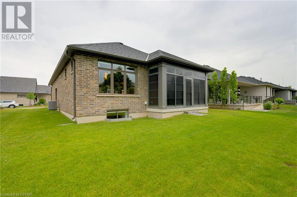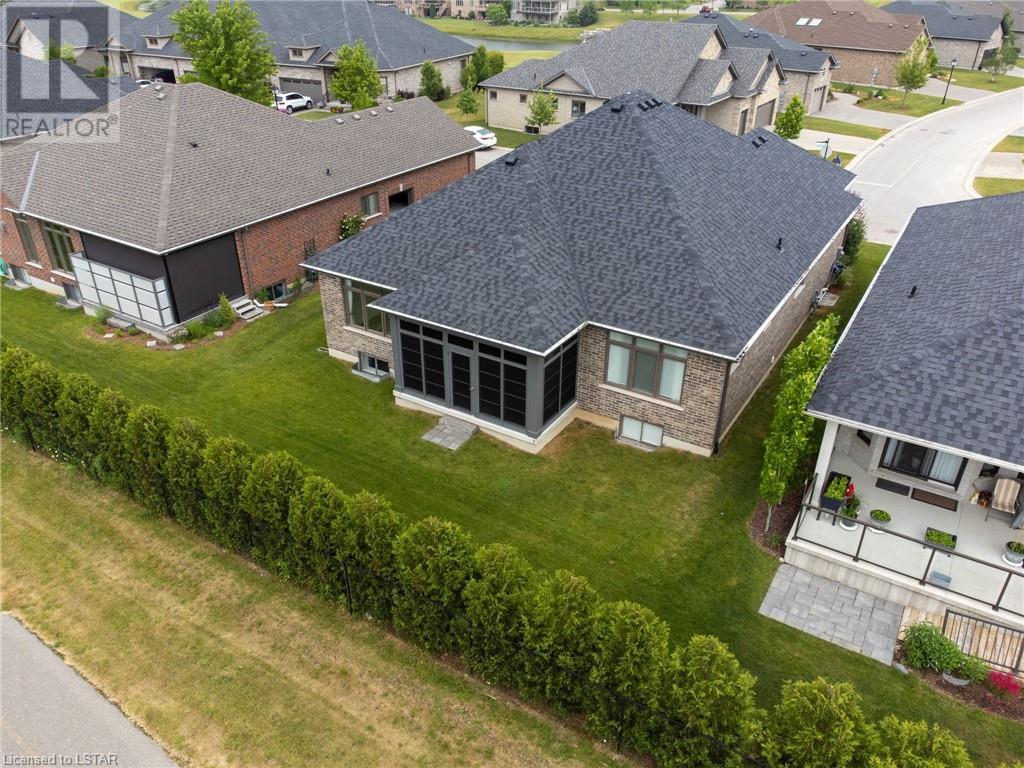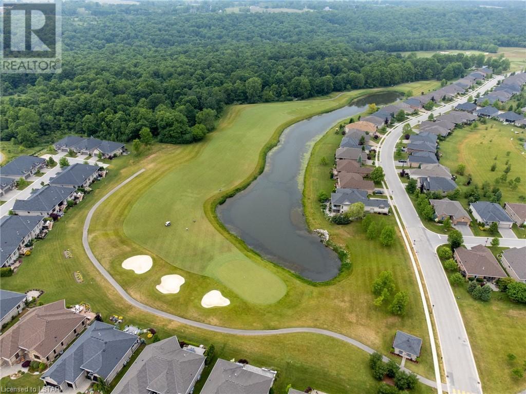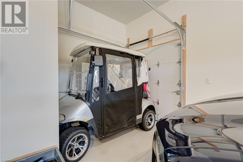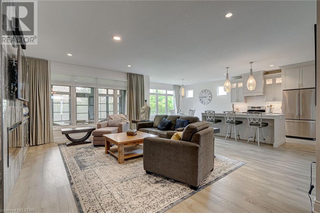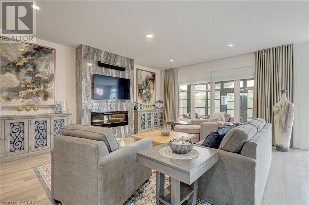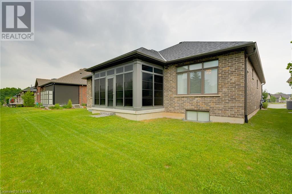 Resort living right here at home in exclusive 50 plus gated Riverbend Golf Community! Residents enjoy year round access to an incredible 28,000 sqft Clubhouse with 2 restaurants, exercise facility, indoor heated pool, lounges, party room and more. 5 year old, popular Inverness model backing onto Kains Woods Trail with loads of upgrades! 1807 sq. ft. one floor plan PLUS an additional 1400 sq.ft. of finished basement area. 2+1 bedrooms & 3 full baths. Spacious foyer leads to great room with 10 ft. ceilings and a gas fireplace with marble tile surround. The eat-in kitchen features quartz countertops, stainless steel appliances, a butler's pantry and a large island. Enjoy a generous 15’2x8’7 rear sunroom with vinyl enclosure located just off of the main living area. The Master Bedroom offers a tray ceiling, a walk-in-closet and a 4 piece ensuite with a custom tiled shower. Second bedroom with cheater ensuite access to the main bathroom. Convenient main floor laundry along with indoor parking for 2 vehicles plus golf cart. Partially finished basement with two large recreation rooms, a bedroom and a full bathroom. Monthly land lease $840.64; 2023 monthly maintenance $585.54 includes concierge at gate 24/7, lawn maintenance, snow removal, inground sprinkler system and clubhouse privileges. NO LAND TRANSFER TAX PAYABLE (id:22211)