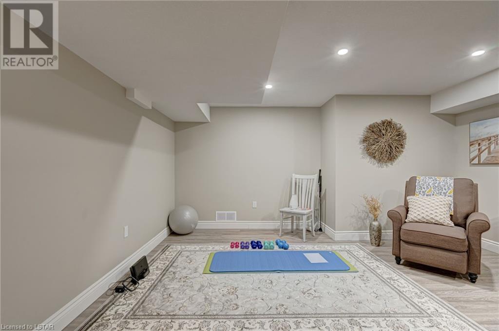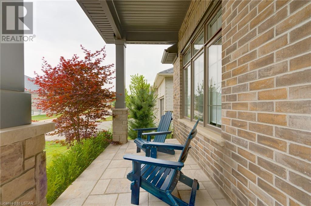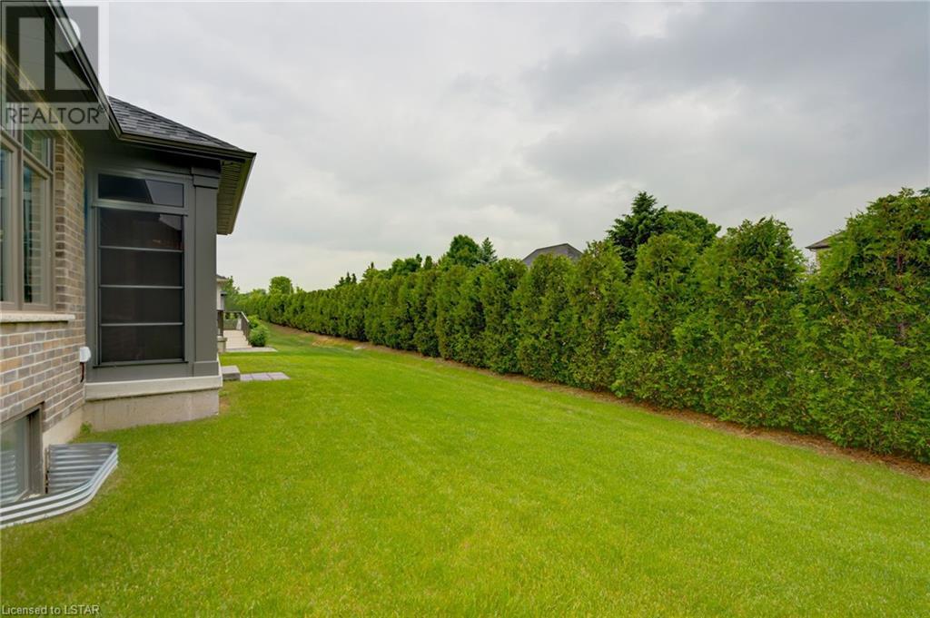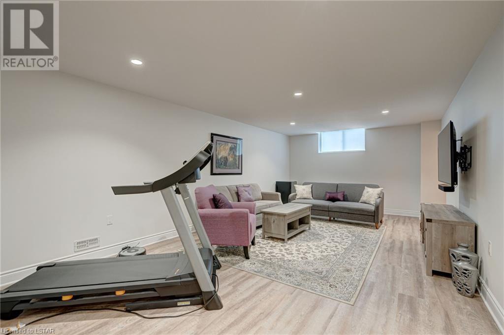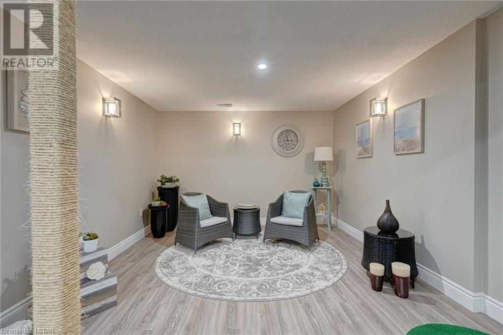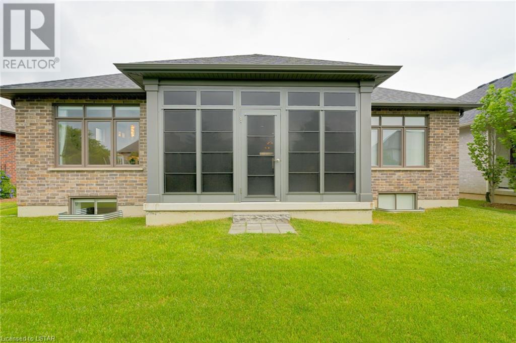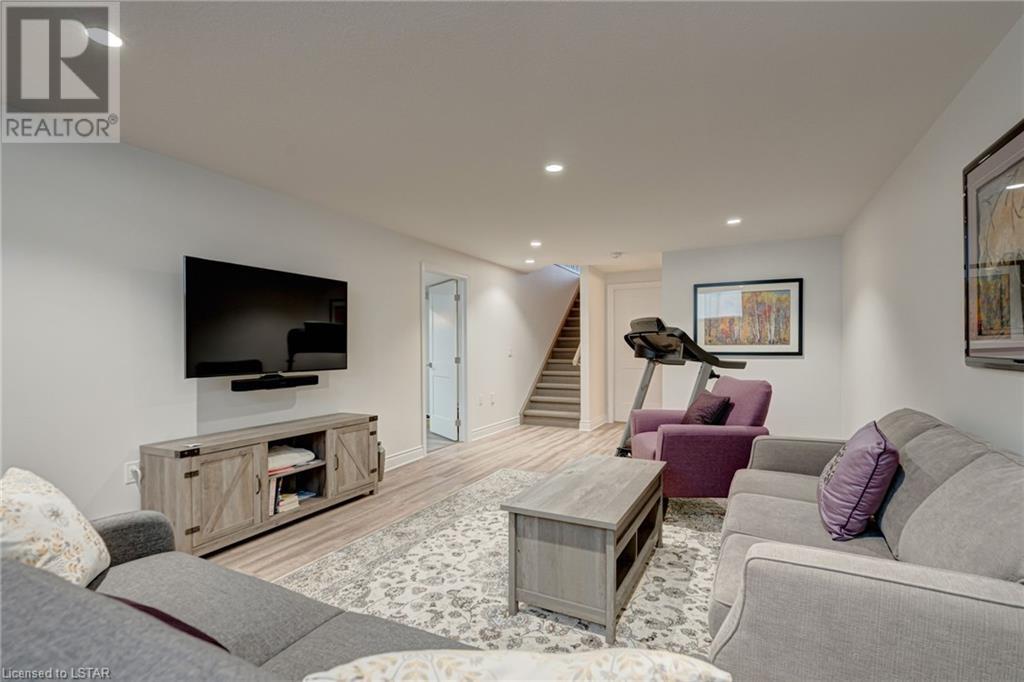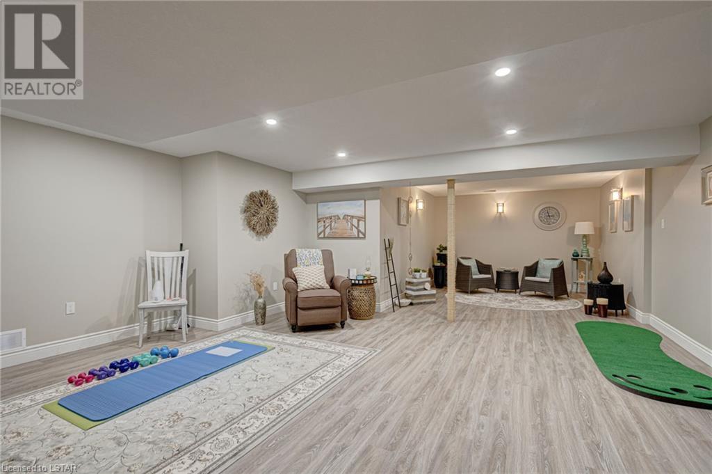 Resort living right here at home in exclusive 50 plus gated Riverbend Golf Community! Residents enjoy year round access to an incredible 28,000 sqft Clubhouse with 2 restaurants, exercise facility, indoor heated pool, lounges, party room and more. 5 year old, popular Inverness model backing onto Kains Woods Trail with loads of upgrades! 1807 sq. ft. one floor plan PLUS an additional 1400 sq.ft. of finished basement area. 2+1 bedrooms & 3 full baths. Spacious foyer leads to great room with 10 ft. ceilings and a gas fireplace with marble tile surround. The eat-in kitchen features quartz countertops, stainless steel appliances, a butler's pantry and a large island. Enjoy a generous 15’2x8’7 rear sunroom with vinyl enclosure located just off of the main living area. The Master Bedroom offers a tray ceiling, a walk-in-closet and a 4 piece ensuite with a custom tiled shower. Second bedroom with cheater ensuite access to the main bathroom. Convenient main floor laundry along with indoor parking for 2 vehicles plus golf cart. Partially finished basement with two large recreation rooms, a bedroom and a full bathroom. Monthly land lease $840.64; 2023 monthly maintenance $585.54 includes concierge at gate 24/7, lawn maintenance, snow removal, inground sprinkler system and clubhouse privileges. NO LAND TRANSFER TAX PAYABLE (id:22211)