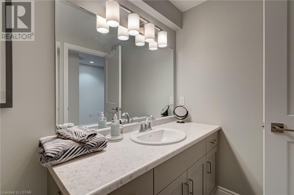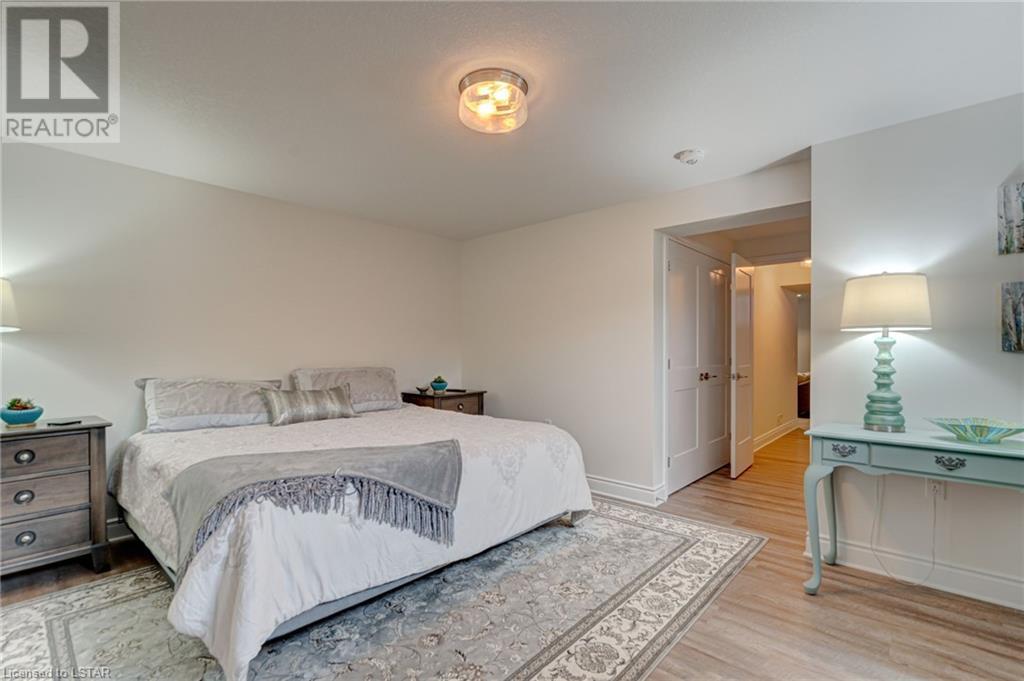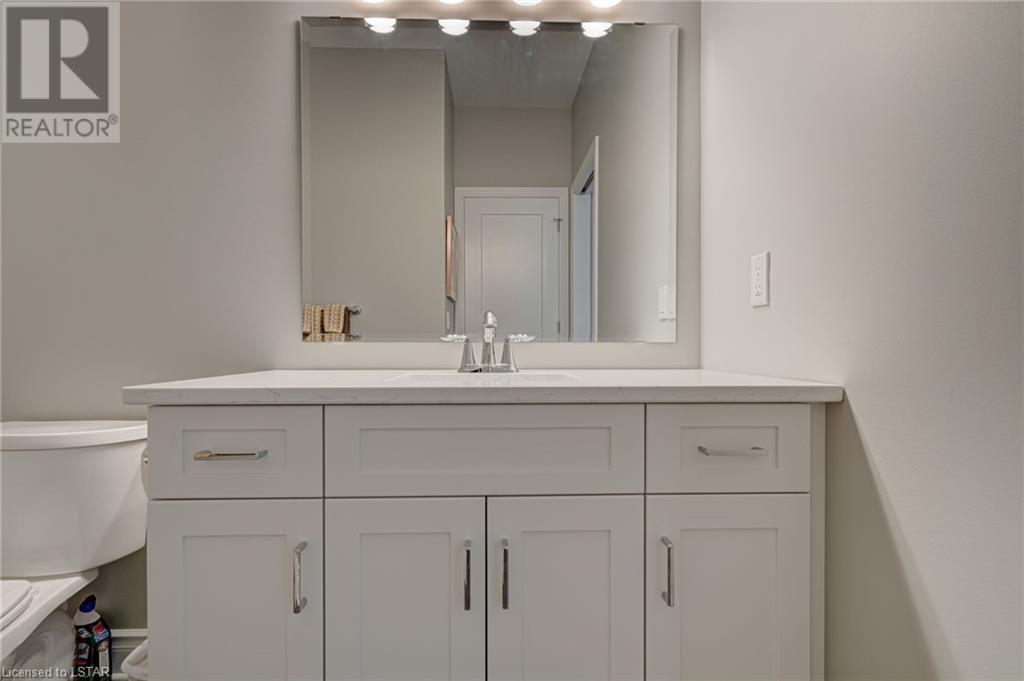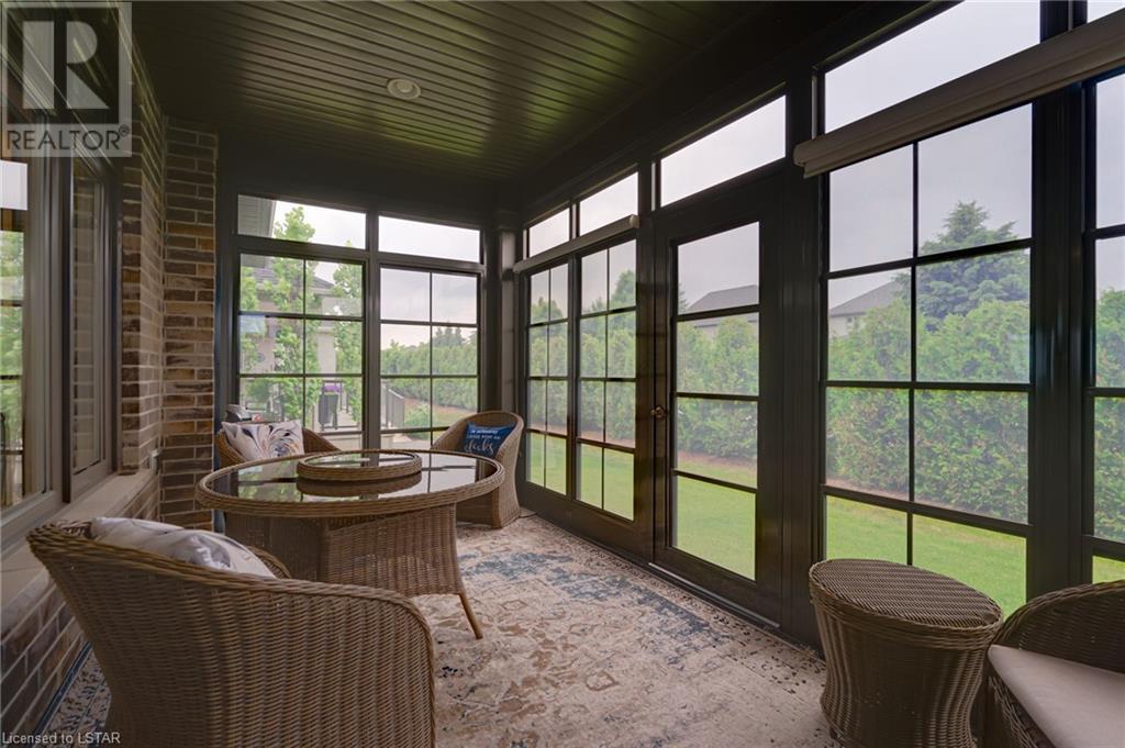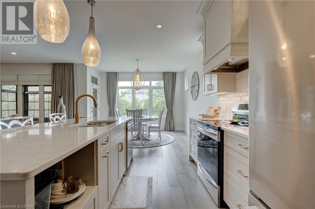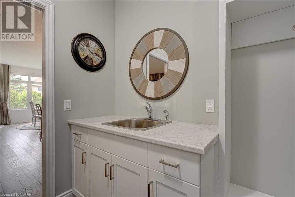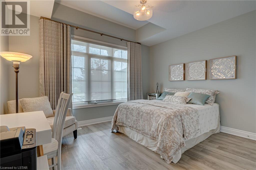Resort living right here at home in exclusive 50 plus gated Riverbend Golf Community! Residents enjoy year round access to an incredible 28,000 sqft Clubhouse with 2 restaurants, exercise facility, indoor heated pool, lounges, party room and more. 5 year old, popular Inverness model backing onto Kains Woods Trail with loads of upgrades! 1807 sq. ft. one floor plan PLUS an additional 1400 sq.ft. of finished basement area. 2+1 bedrooms & 3 full baths. Spacious foyer leads to great room with 10 ft. ceilings and a gas fireplace with marble tile surround. The eat-in kitchen features quartz countertops, stainless steel appliances, a butler's pantry and a large island. Enjoy a generous 15’2x8’7 rear sunroom with vinyl enclosure located just off of the main living area. The Master Bedroom offers a tray ceiling, a walk-in-closet and a 4 piece ensuite with a custom tiled shower. Second bedroom with cheater ensuite access to the main bathroom. Convenient main floor laundry along with indoor parking for 2 vehicles plus golf cart. Partially finished basement with two large recreation rooms, a bedroom and a full bathroom. Monthly land lease $840.64; 2023 monthly maintenance $585.54 includes concierge at gate 24/7, lawn maintenance, snow removal, inground sprinkler system and clubhouse privileges. NO LAND TRANSFER TAX PAYABLE (id:22211)