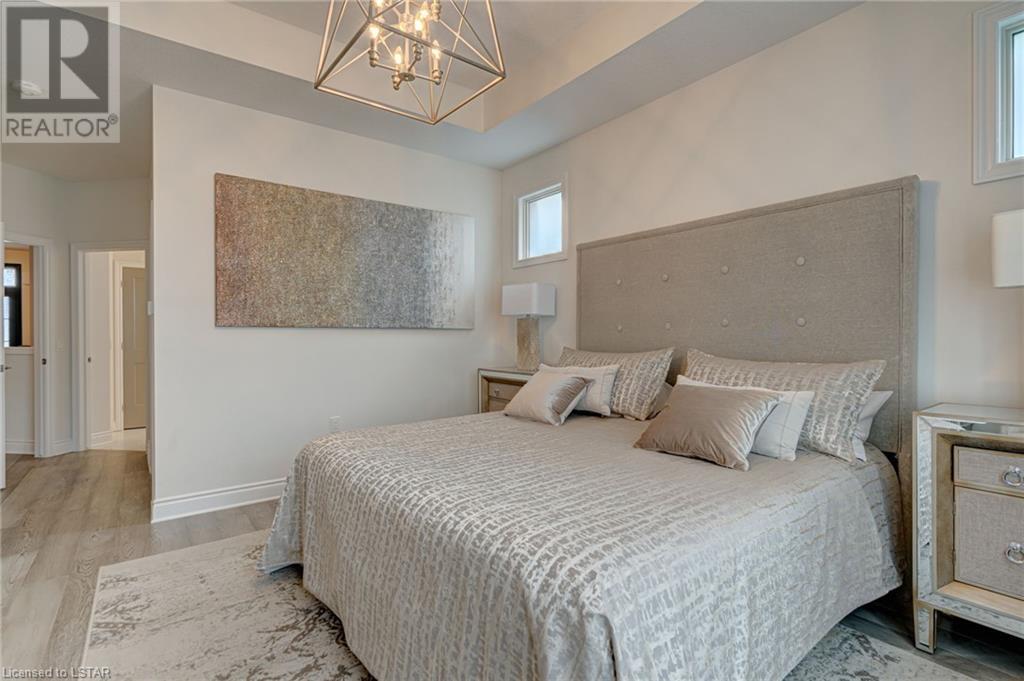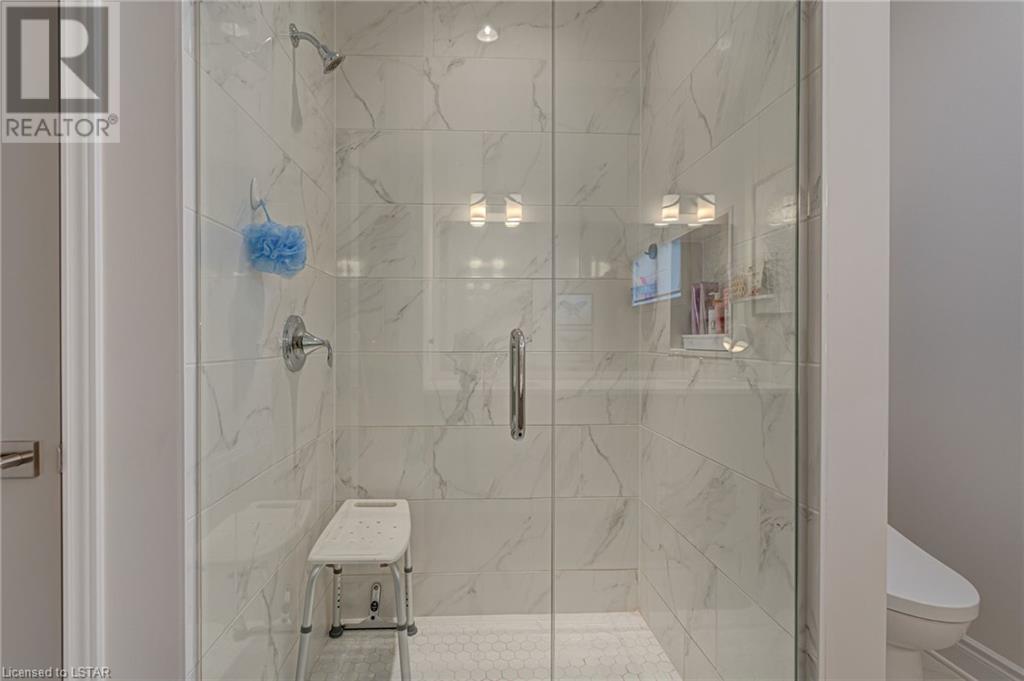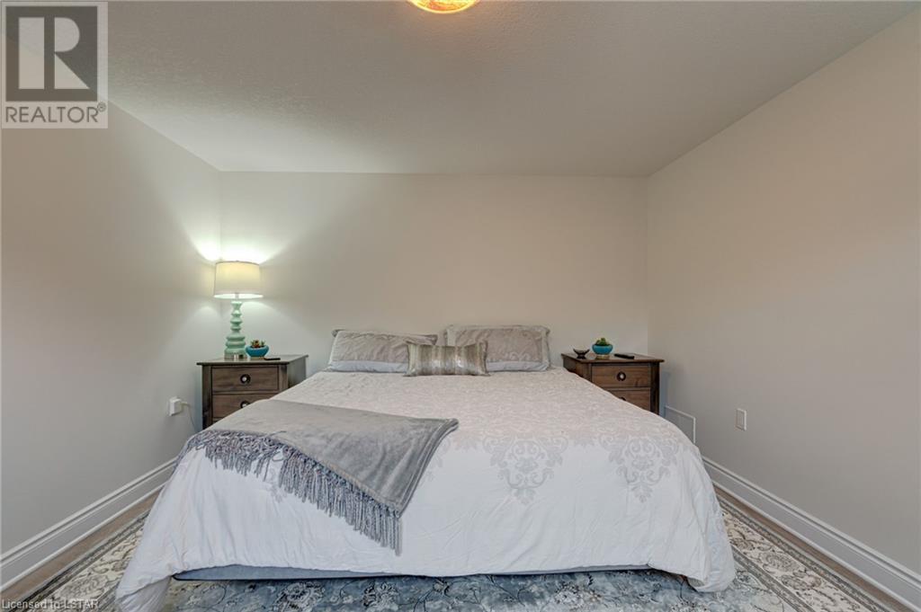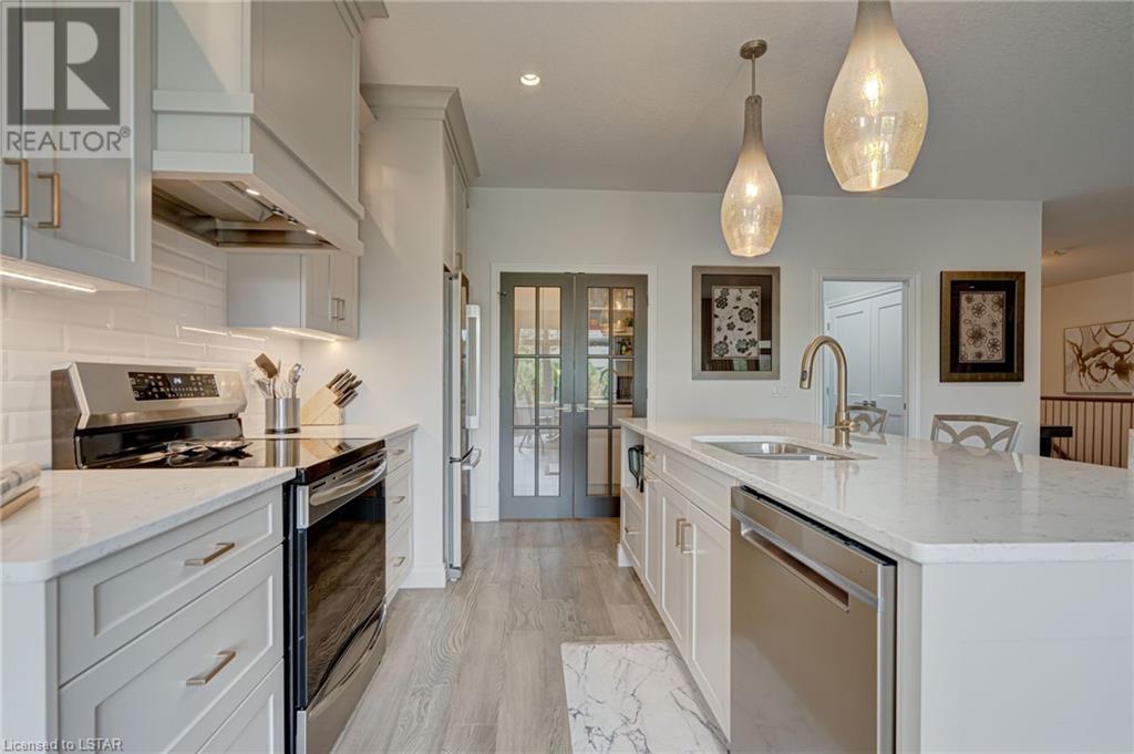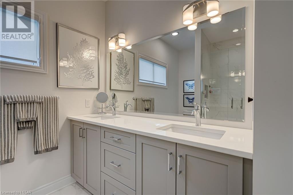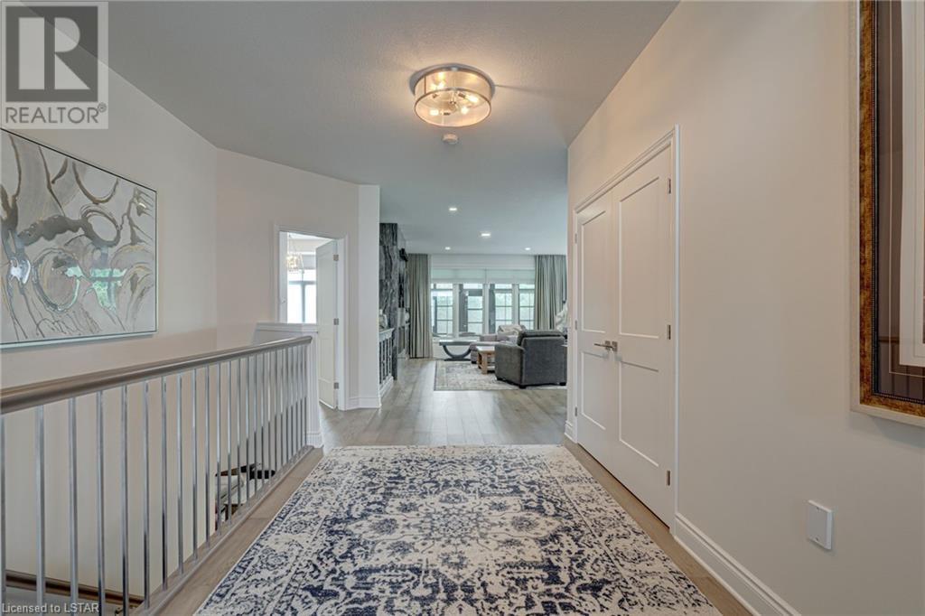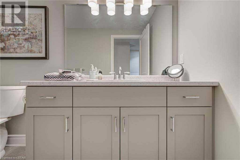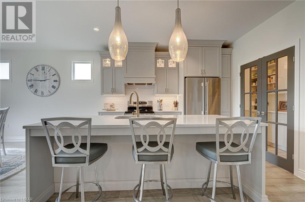 Resort living right here at home in exclusive 50 plus gated Riverbend Golf Community! Residents enjoy year round access to an incredible 28,000 sqft Clubhouse with 2 restaurants, exercise facility, indoor heated pool, lounges, party room and more. 5 year old, popular Inverness model backing onto Kains Woods Trail with loads of upgrades! 1807 sq. ft. one floor plan PLUS an additional 1400 sq.ft. of finished basement area. 2+1 bedrooms & 3 full baths. Spacious foyer leads to great room with 10 ft. ceilings and a gas fireplace with marble tile surround. The eat-in kitchen features quartz countertops, stainless steel appliances, a butler's pantry and a large island. Enjoy a generous 15’2x8’7 rear sunroom with vinyl enclosure located just off of the main living area. The Master Bedroom offers a tray ceiling, a walk-in-closet and a 4 piece ensuite with a custom tiled shower. Second bedroom with cheater ensuite access to the main bathroom. Convenient main floor laundry along with indoor parking for 2 vehicles plus golf cart. Partially finished basement with two large recreation rooms, a bedroom and a full bathroom. Monthly land lease $840.64; 2023 monthly maintenance $585.54 includes concierge at gate 24/7, lawn maintenance, snow removal, inground sprinkler system and clubhouse privileges. NO LAND TRANSFER TAX PAYABLE (id:22211)