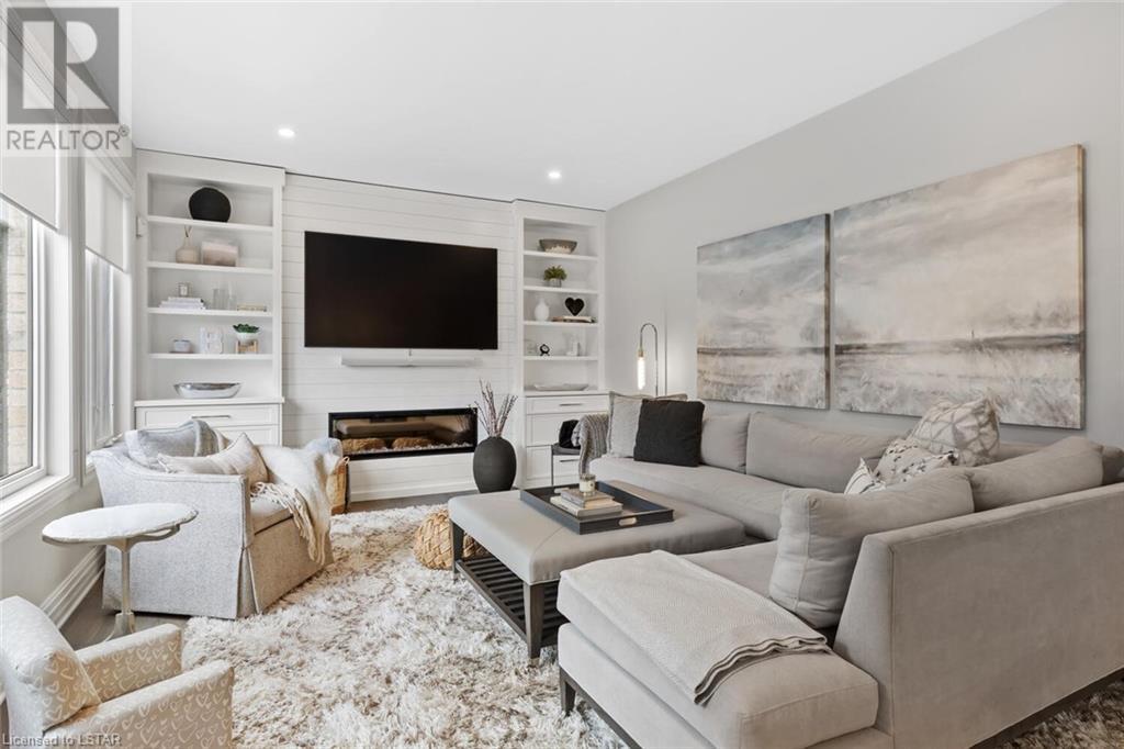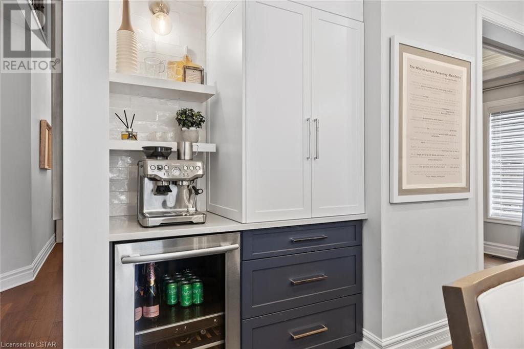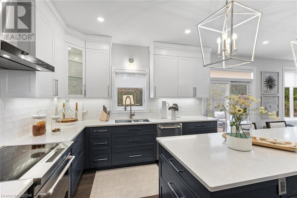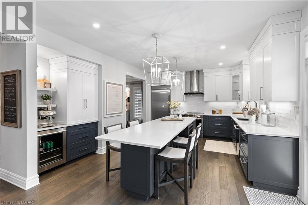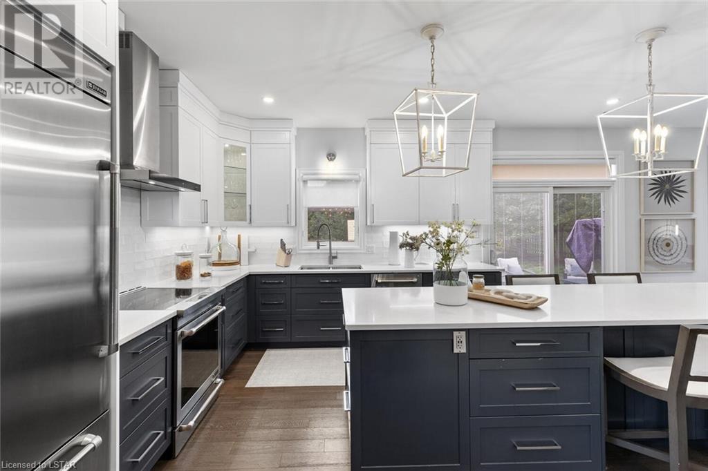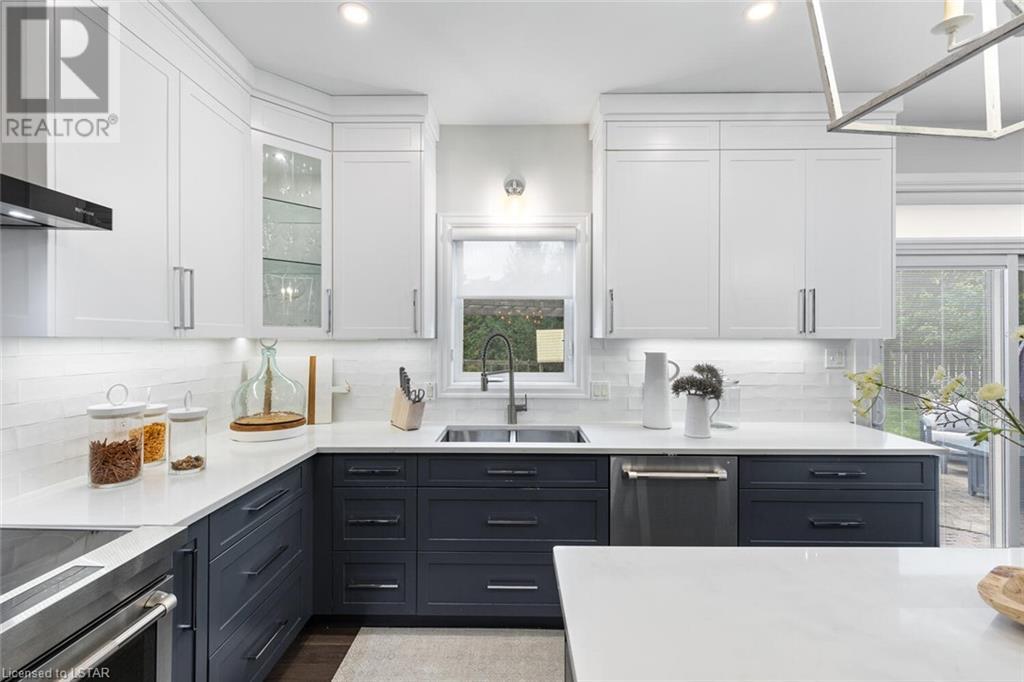 Beautifully updated home in desirable Warbler Woods. Enter through the front door into the spacious main level with hardwood flooring throughout featuring double height foyer; den/formal living room with vaulted ceilings; dining room with wainscoting; expertly designed custom kitchen with quartz countertops, wine fridge, open shelving, glass display cabinetry, generous island with breakfast bar and direct sliding door access to the backyard; Spacious open concept great room with cozy gas fireplace surrounded by custom built in shelving; mud room/laundry room with built in cabinetry and bench with cubbies; and convenient main floor two piece bathroom. The sprawling upper level boasts updated main bathroom and 4 generous bedrooms including primary suite with custom accent wall, walk in closet and generous 5-piece ensuite with double sinks, soaker tub and shower with glass surround. The fully finished lower level is perfect for family movie night or guests with gas fireplace, bar, 3-piece bathroom and bedroom. The landscaped rear garden has large interlock patio with pergola, hot tub, and plenty of grassy yard for the dog. Steps to new West Five featuring shopping, dining and more! Close to parks, trails and playground! (id:22211)