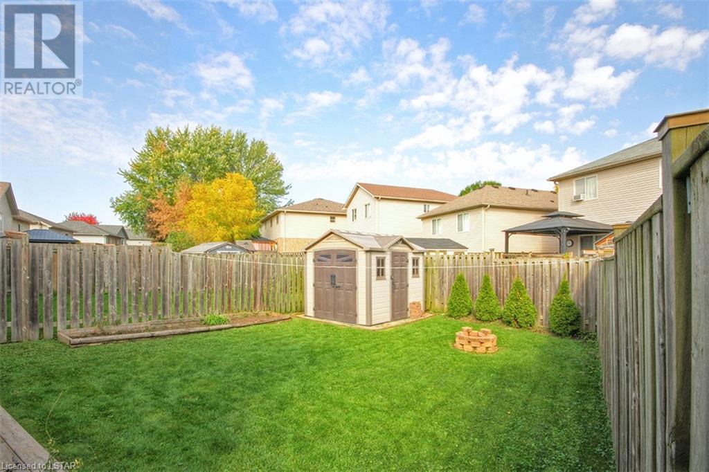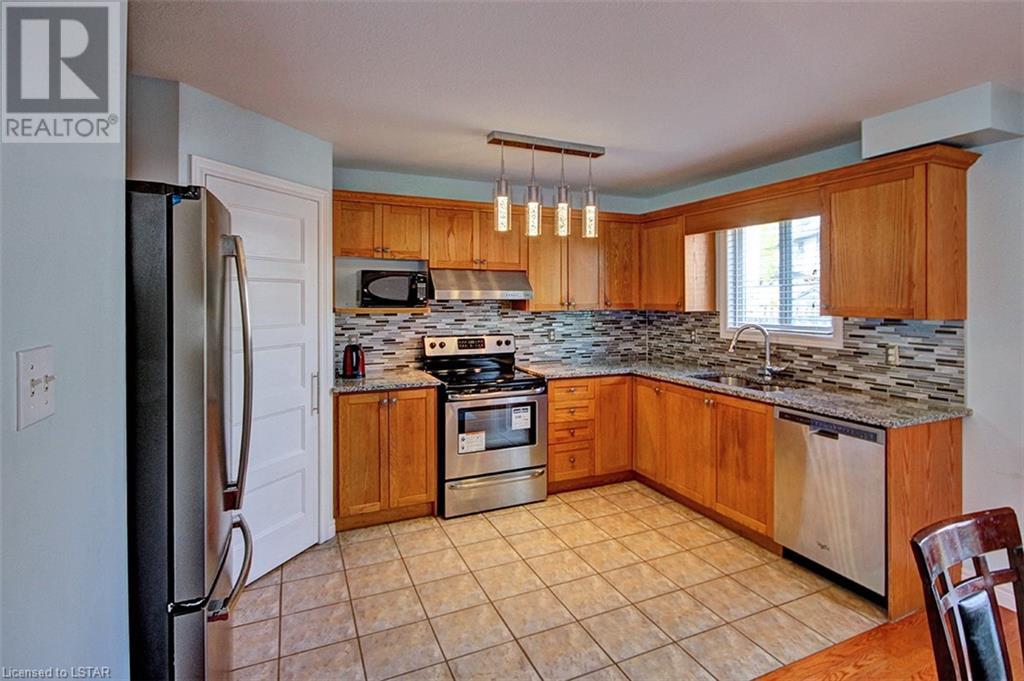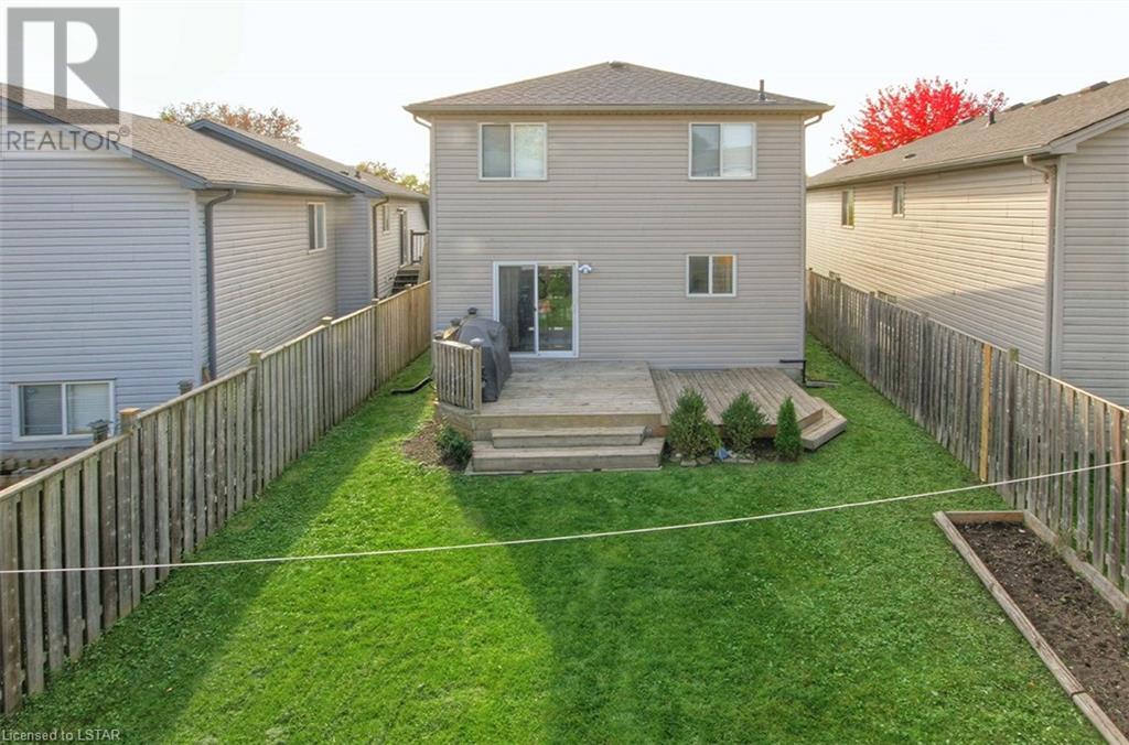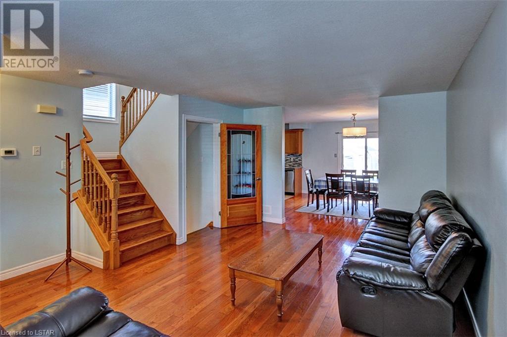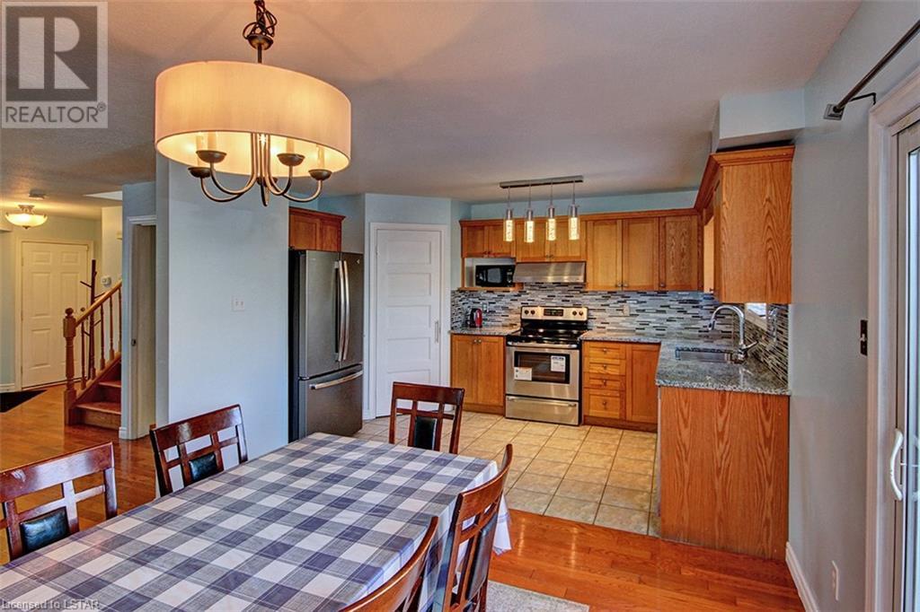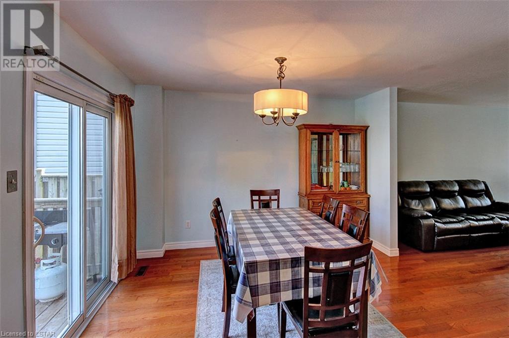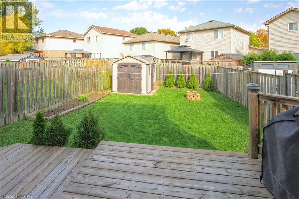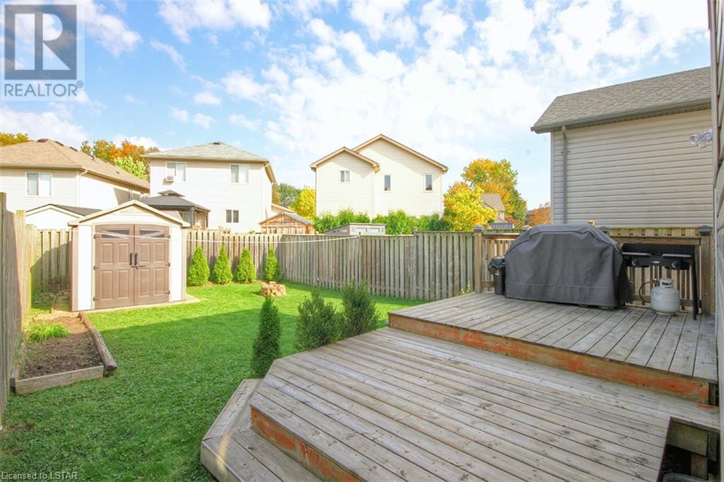 This stunning two-story home is situated in an appealing East end location which is close proximity to 401 access and amenities. Inside, the main level features an open concept design with gorgeous hardwood flooring throughout. The living room and dining room provides blinds and patio doors that lead to the deck creating a seamless indoor-outdoor flow. A French door leads to the lower level, adding a stylish element to the home. The kitchen is designed for convenience, with stainless steel appliances, granite countertops, a contemporary backsplash, and a well-placed corner pantry that maximizes storage space. The wooden stairs lead you to the upper level, where the primary bedroom boasts a spacious walk-in closet. Additionally, there are spacious closets throughout the home, offering ample storage solutions. The lower level is finished with large windows that allow natural light to flood the space. Recently completed, the lower level includes a 3-piece bathroom, adding functionality and value to the home. The attractive fenced-in backyard, two-tiered deck, and storage shed enhance the outdoors. (id:22211)