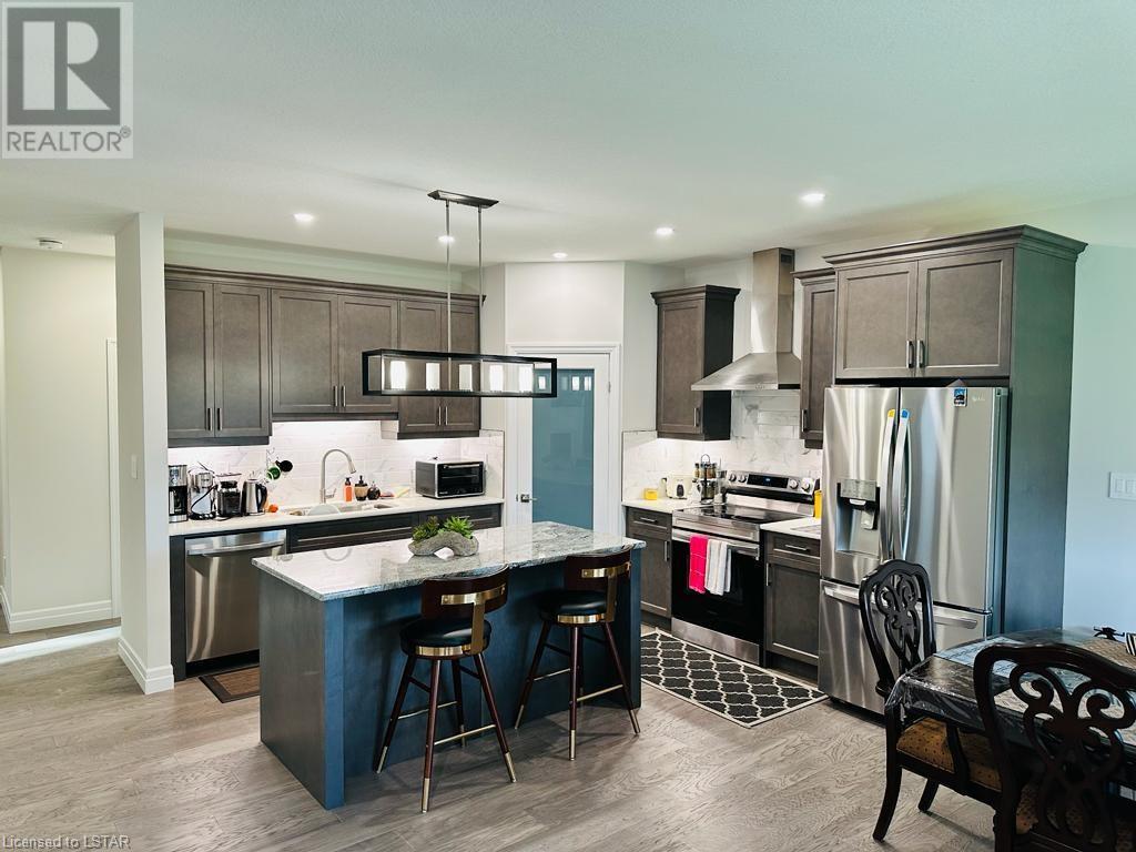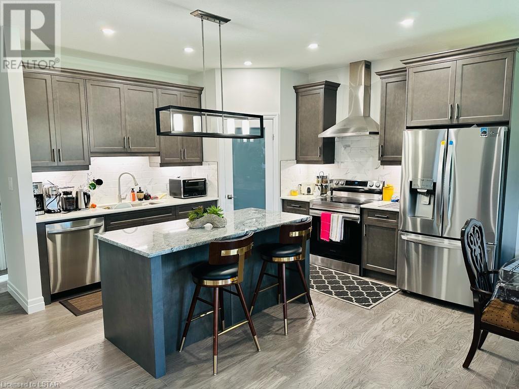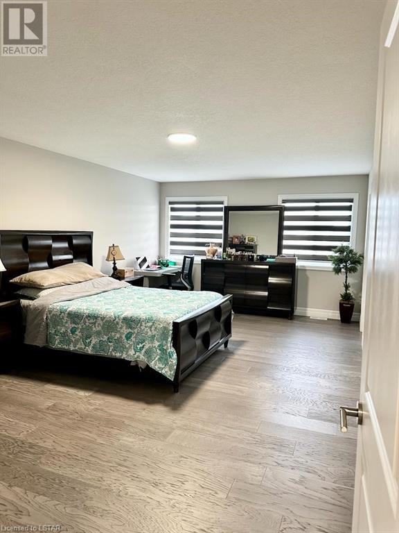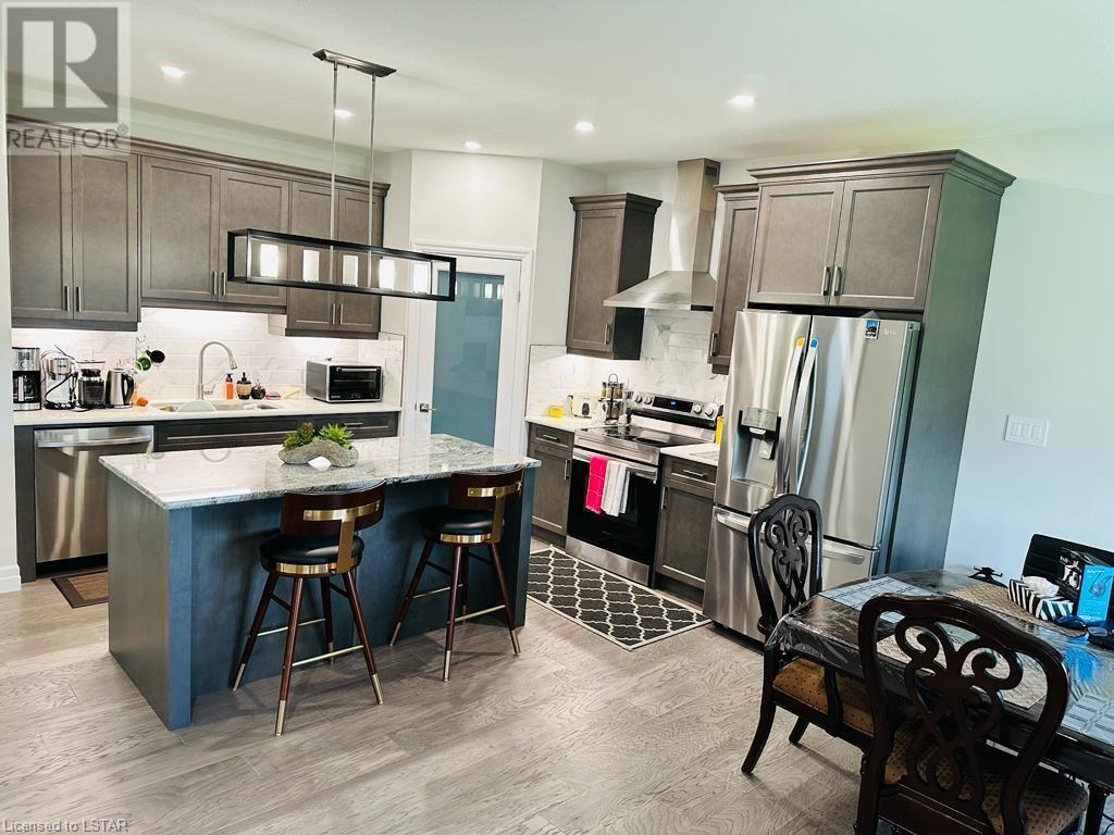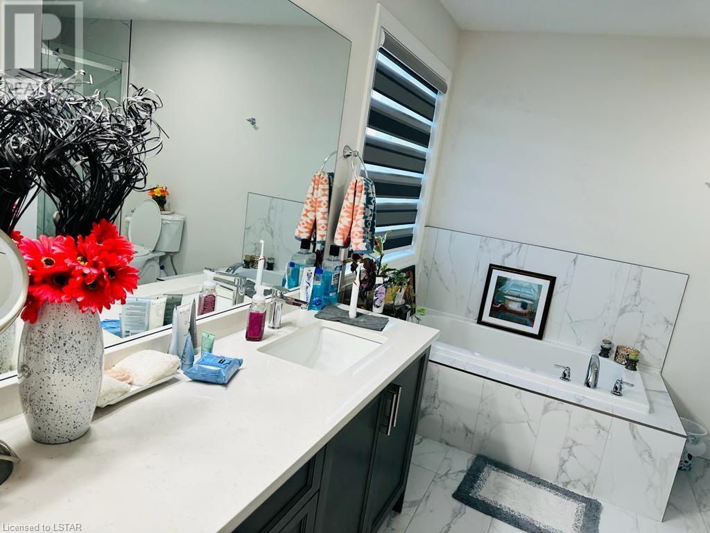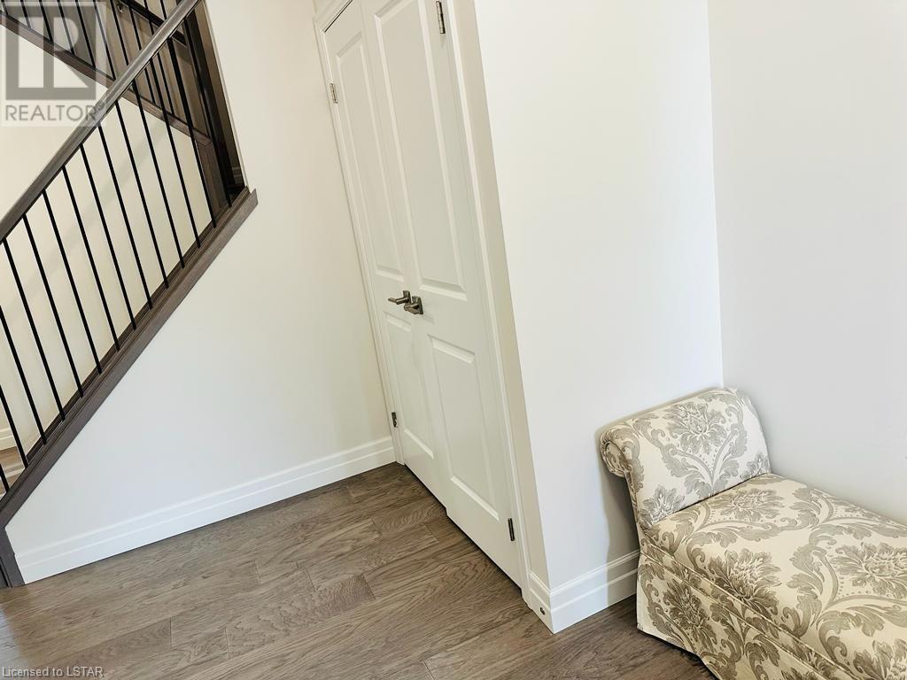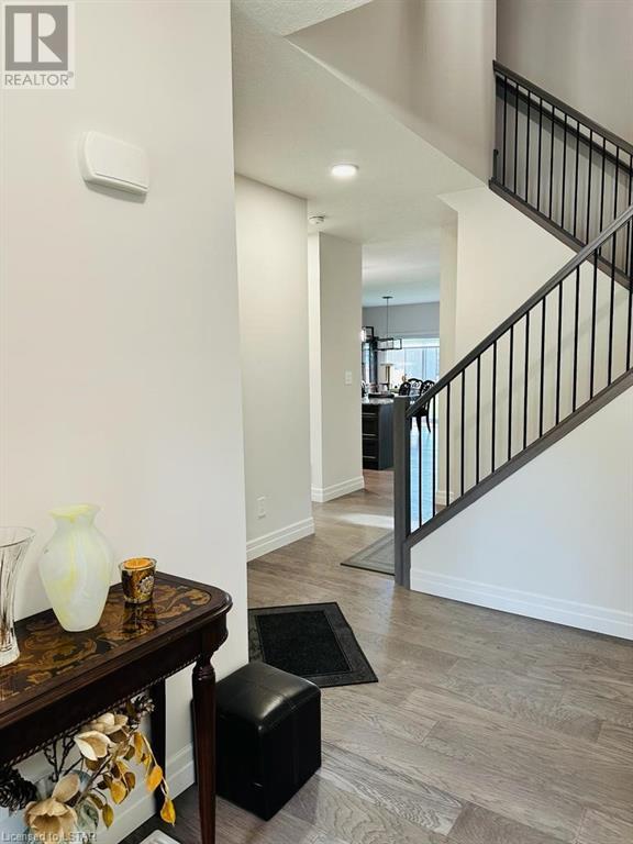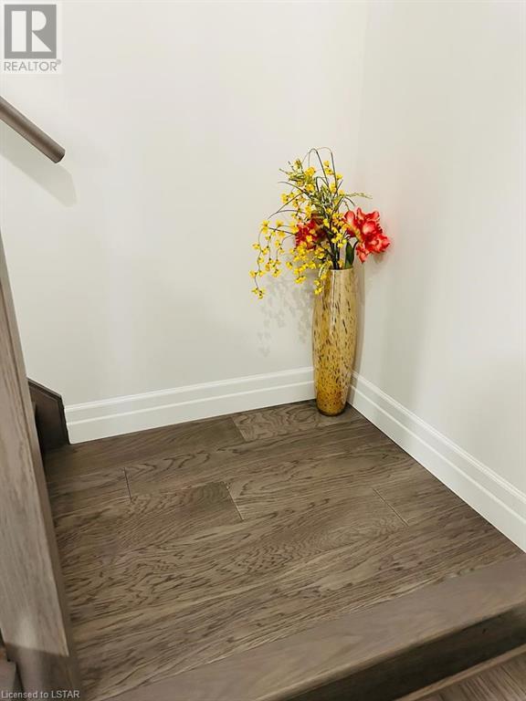 In desirable North London(Hydepark and Fanshawe), brand new custom designed home featuring 4 bedrooms with 4 washrooms including 9 ft ceilings on main floor, upgraded hardwood floor on all levels( no carpet in whole house), granite and quartz counters in the kitchen and upstairs vanity's, extra large window in family room, kitchen cabinets to the ceiling with valance trim, tiled wall in family room, with electric fireplace, wood stained stringers, metal spindles and stained poplar wood stairs, central A/C, tiled glass shower in the ensuite. Large kitchen island with quartz counters, includes kitchen appliances, and washer dryer, and all blinds. All Measurements are approximate. Walking distance to primary and secondary Schools, Wal-Mart, Costco, CanadianTire, Lowes, HomeDepo, Banks, Medical & more. (id:22211)