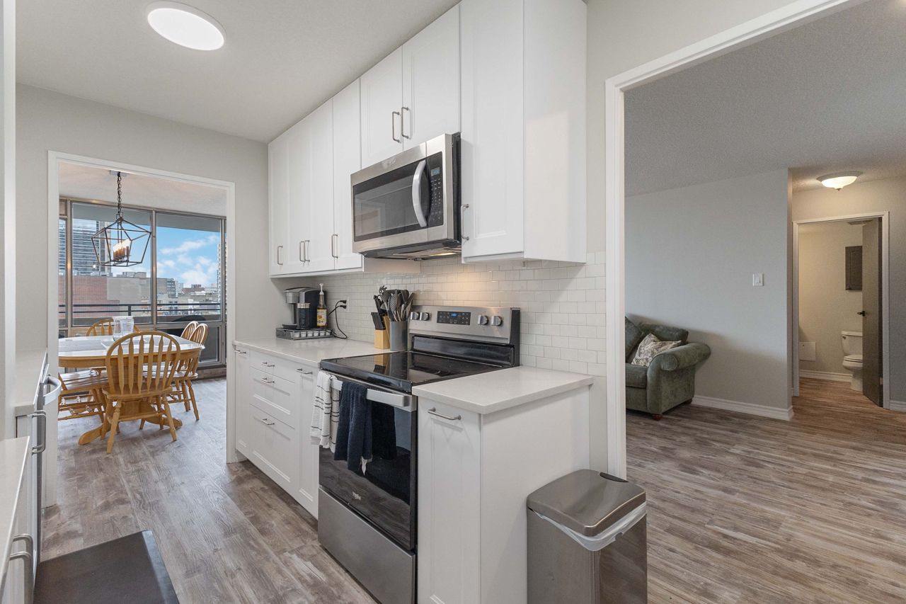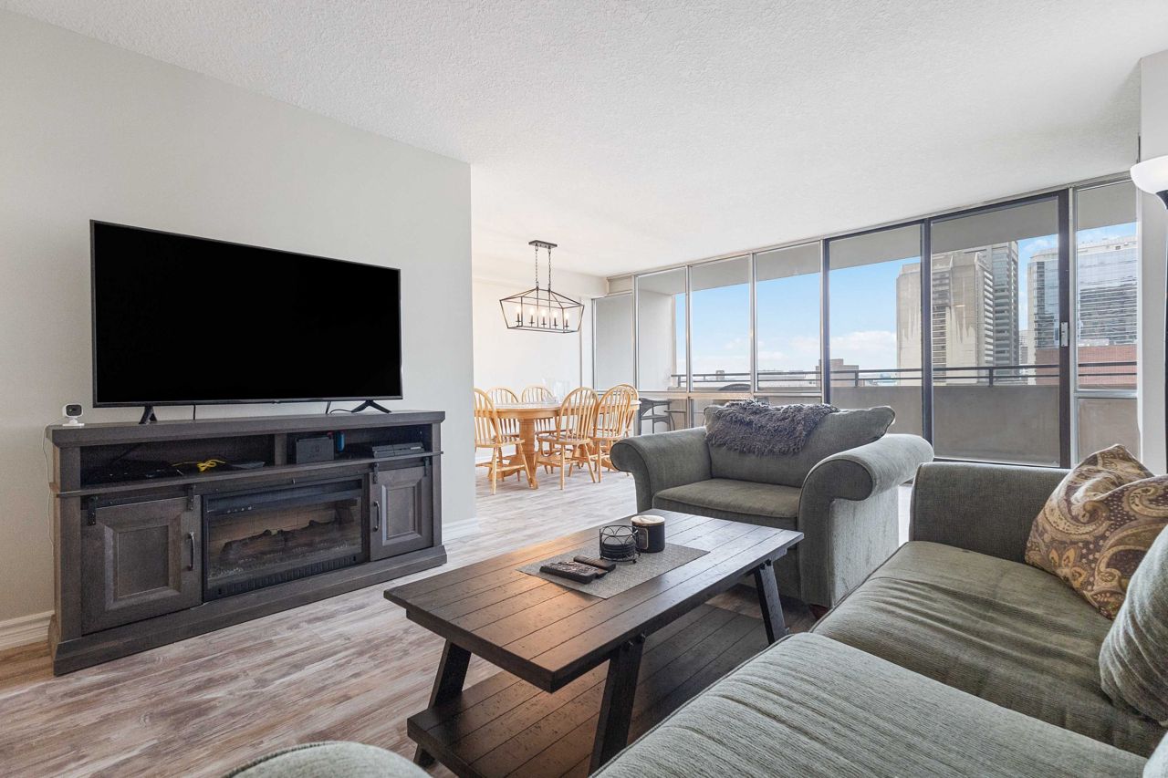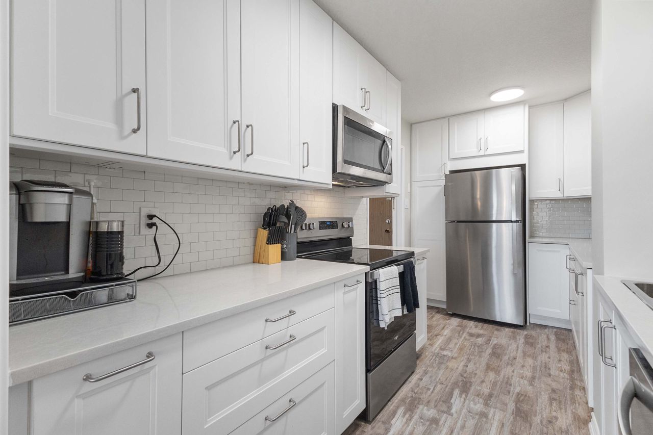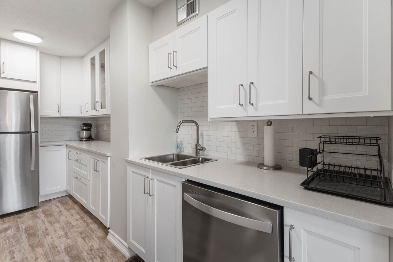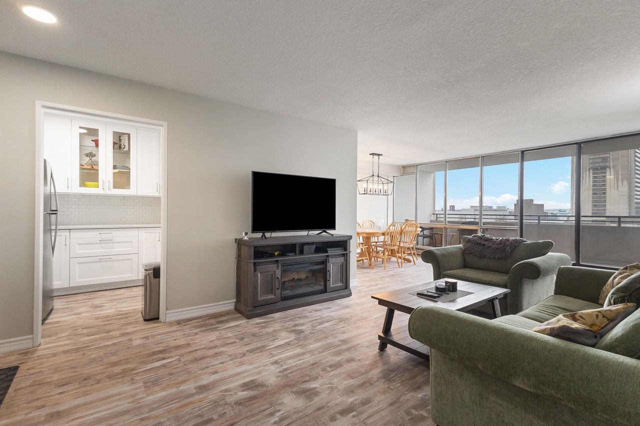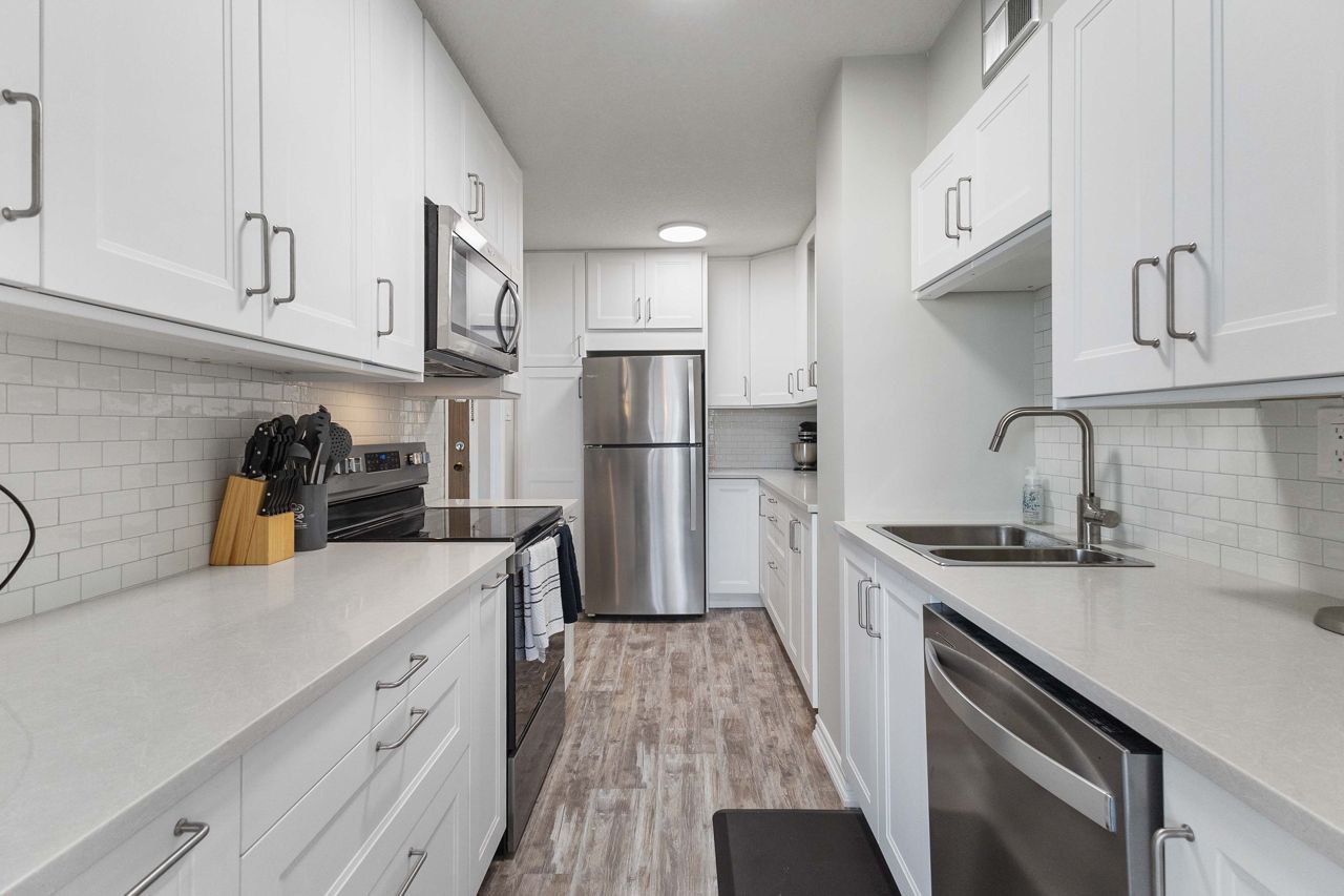 Fully renovated 1 BEDROOM PLUS OFFICE/DEN, beautiful new white kitchen with quartz countertops and subway tile backsplash, neutral vinyl floors (no carpet), bright and spacious unit with desirable west facing exposure overlooking downtown and sunsets! Fantastic downtown location and within walking distance to great restaurants, parks, trails, shopping, transit, summer festivals and more! This home offers spacious primary bedroom and small den/office, huge great room area and large eating area overlooking wall to wall windows with access to expansive balcony. 1 underground parking spot included. NOTE: Condo fee includes: heat, hydro, water, internet, cable tv, central air as well as extensive amenities including indoor pool, party room, workout room, convenience store on main level, party room and secure entry. 4 appliances included.