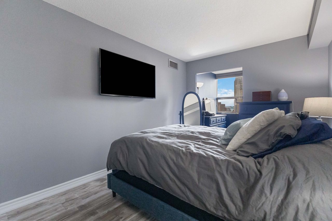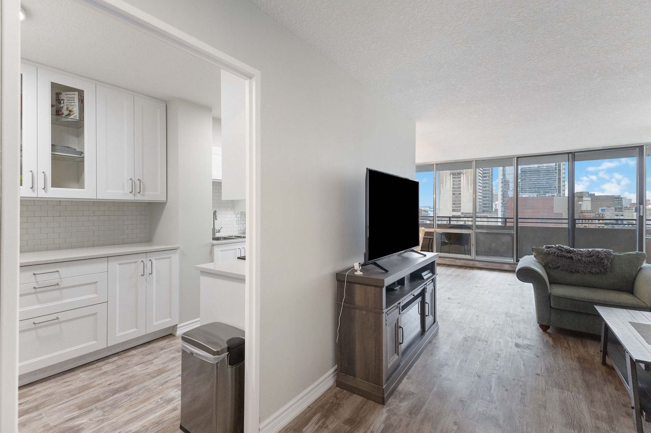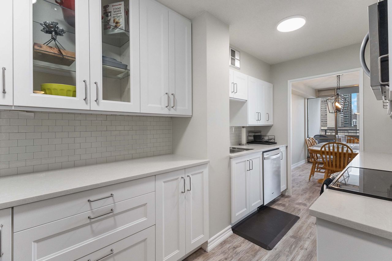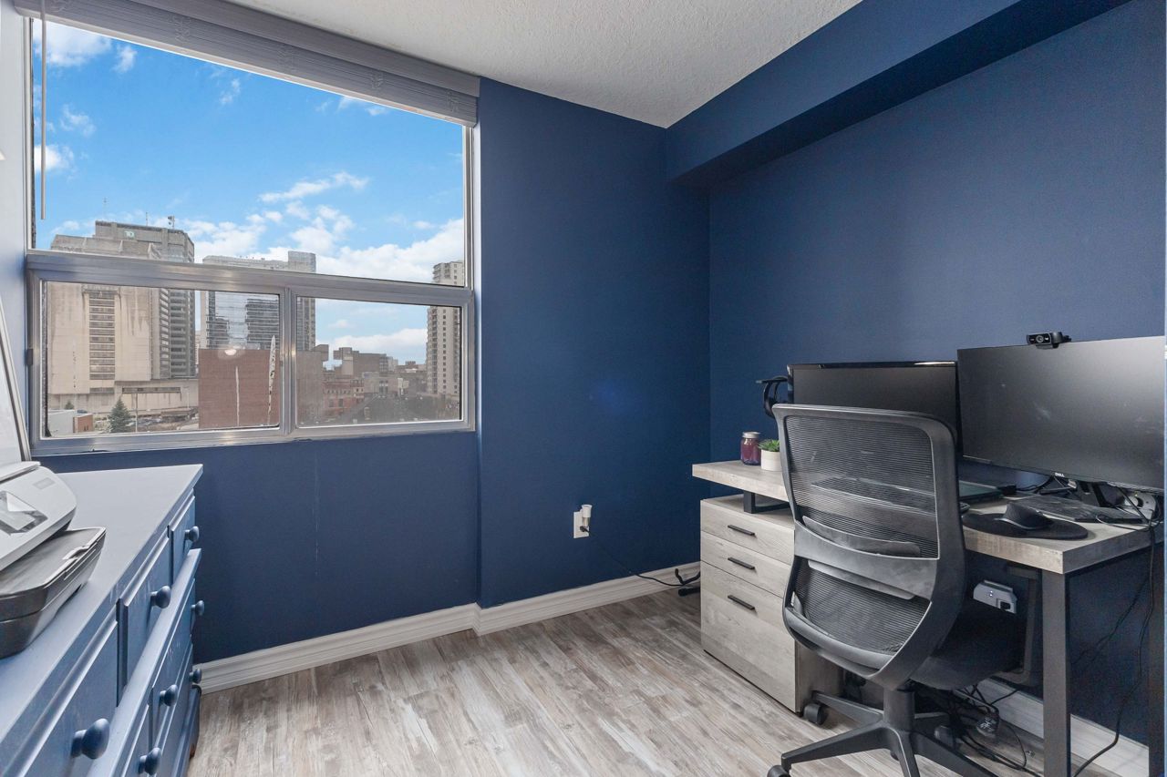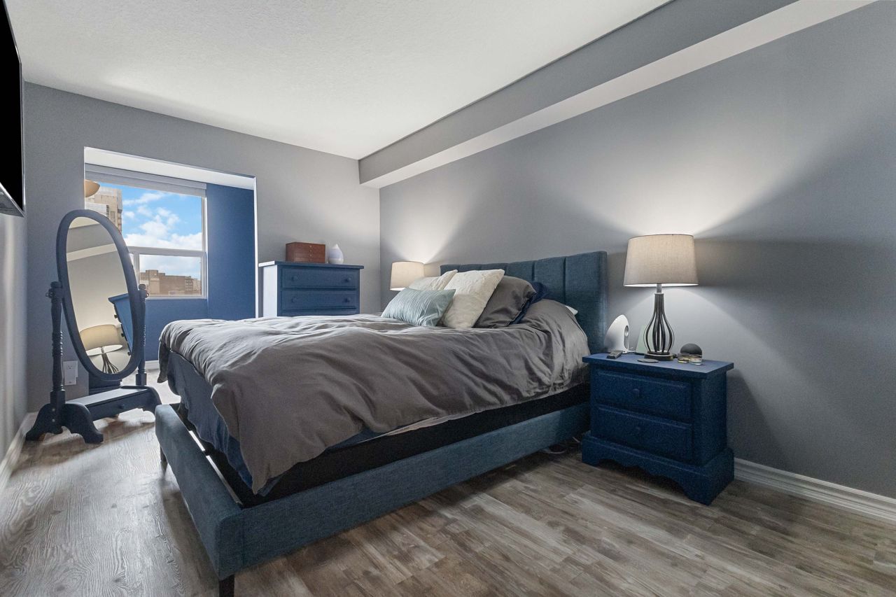 Fully renovated 1 BEDROOM PLUS OFFICE/DEN, beautiful new white kitchen with quartz countertops and subway tile backsplash, neutral vinyl floors (no carpet), bright and spacious unit with desirable west facing exposure overlooking downtown and sunsets! Fantastic downtown location and within walking distance to great restaurants, parks, trails, shopping, transit, summer festivals and more! This home offers spacious primary bedroom and small den/office, huge great room area and large eating area overlooking wall to wall windows with access to expansive balcony. 1 underground parking spot included. NOTE: Condo fee includes: heat, hydro, water, internet, cable tv, central air as well as extensive amenities including indoor pool, party room, workout room, convenience store on main level, party room and secure entry. 4 appliances included.