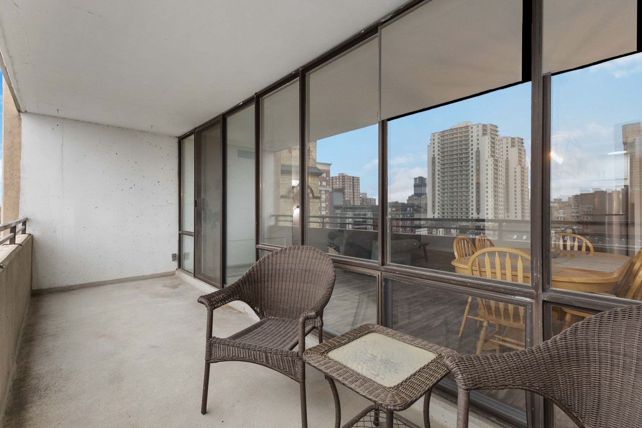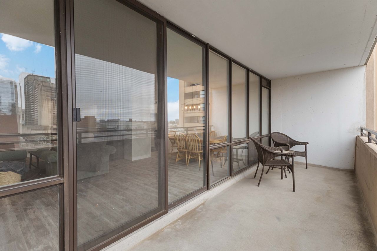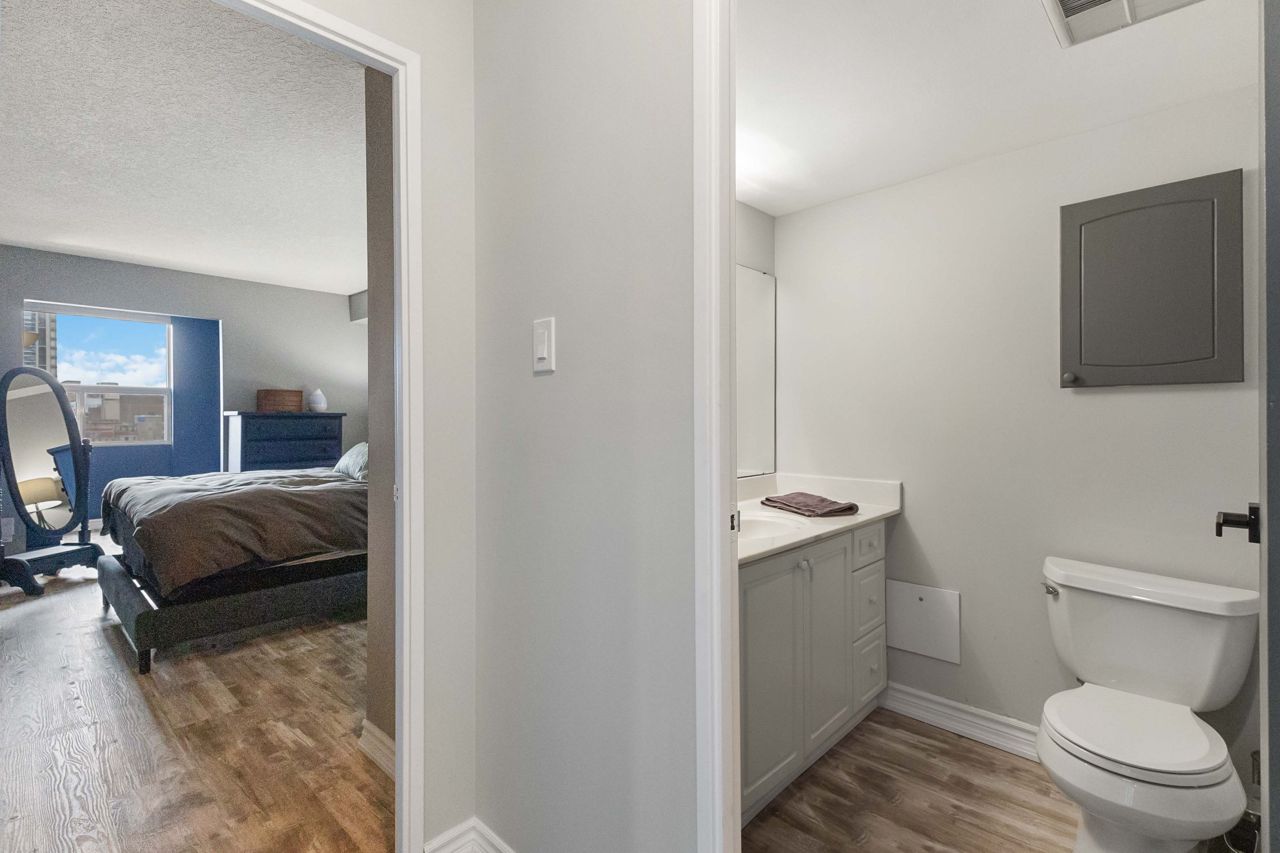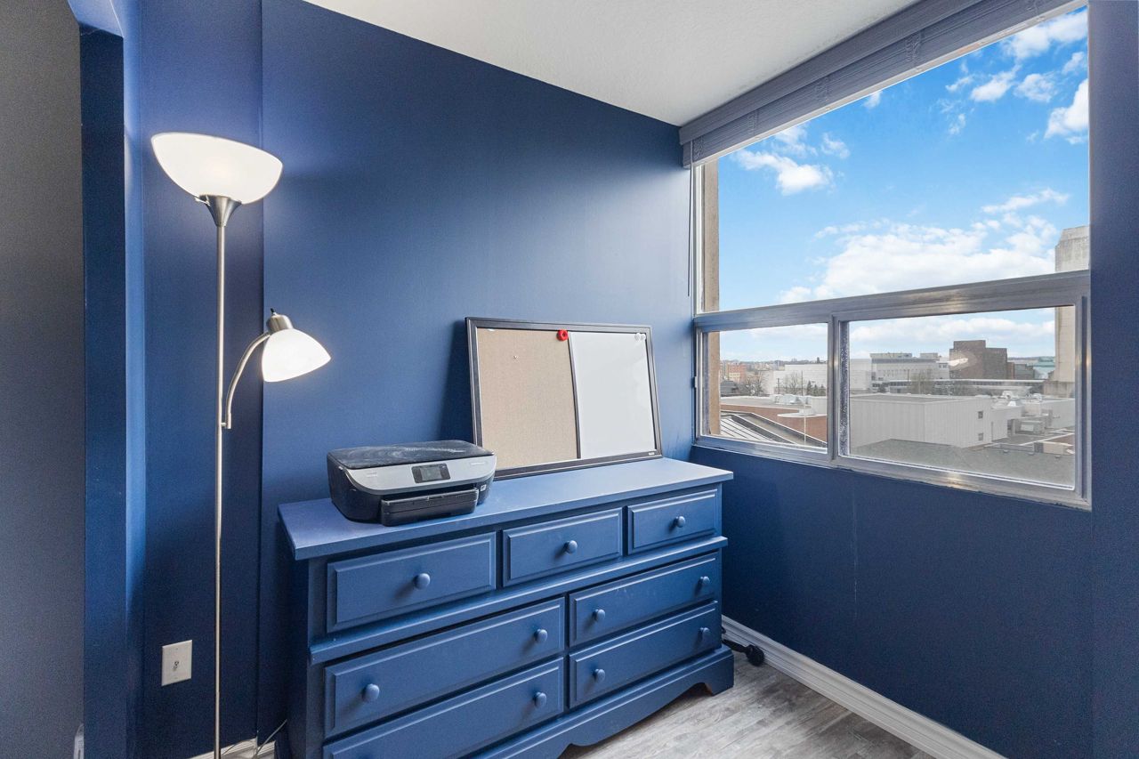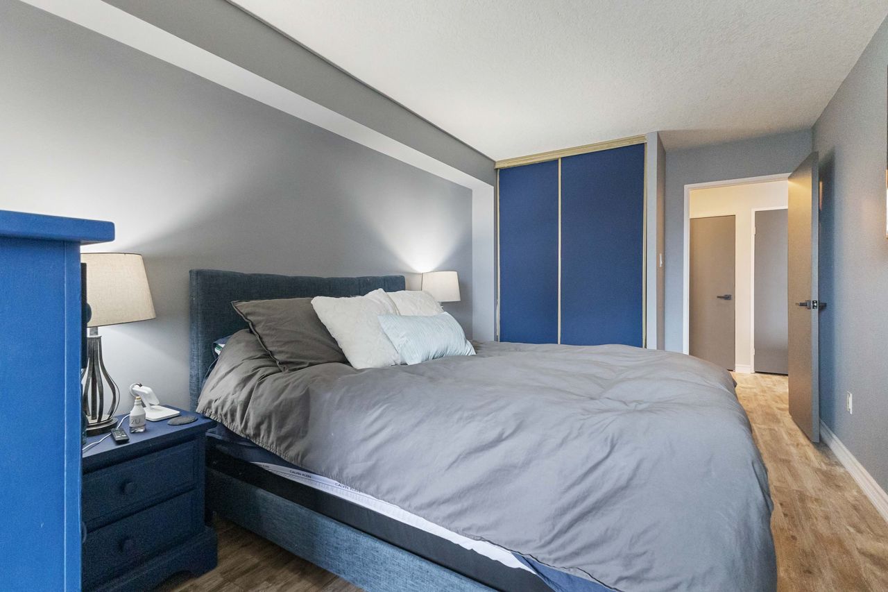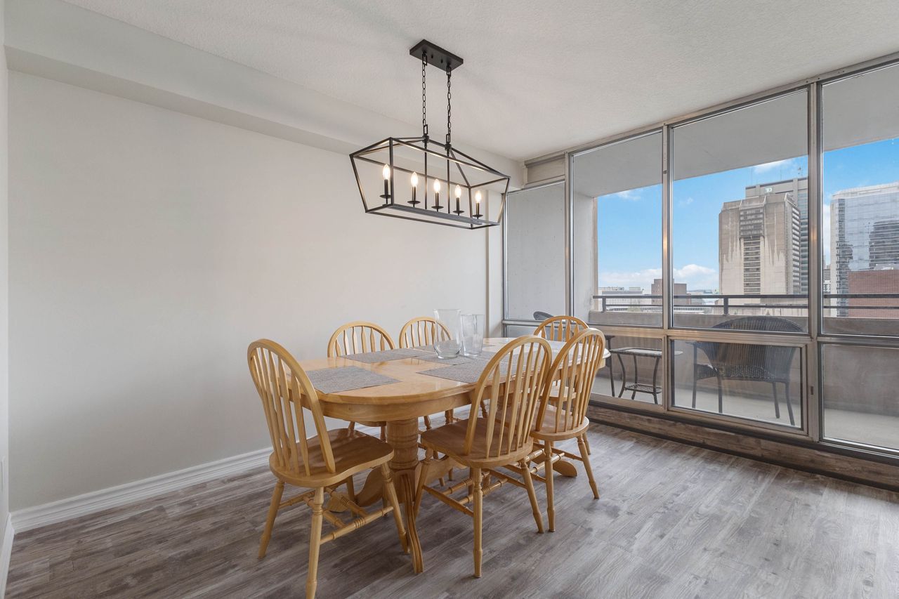 Fully renovated 1 BEDROOM PLUS OFFICE/DEN, beautiful new white kitchen with quartz countertops and subway tile backsplash, neutral vinyl floors (no carpet), bright and spacious unit with desirable west facing exposure overlooking downtown and sunsets! Fantastic downtown location and within walking distance to great restaurants, parks, trails, shopping, transit, summer festivals and more! This home offers spacious primary bedroom and small den/office, huge great room area and large eating area overlooking wall to wall windows with access to expansive balcony. 1 underground parking spot included. NOTE: Condo fee includes: heat, hydro, water, internet, cable tv, central air as well as extensive amenities including indoor pool, party room, workout room, convenience store on main level, party room and secure entry. 4 appliances included.
