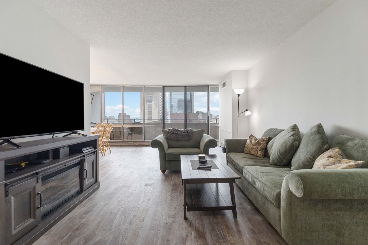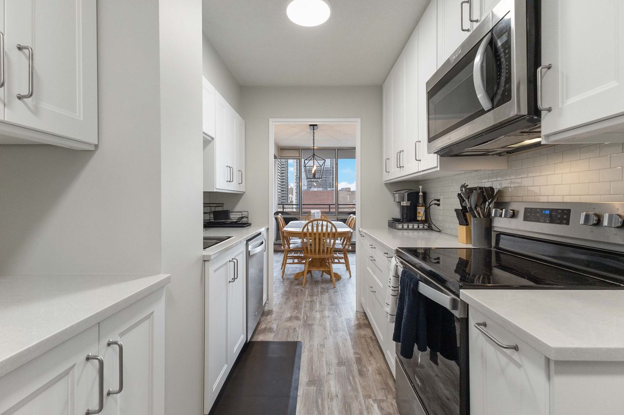 全新翻新的一卧室加书房/活动室,拥有美丽的白色厨房,石英台面和地铁瓷砖 backsplash,中性乙烯基地板(无地毯),明亮宽敞的单元,享有朝西视野,可俯瞰市中心和日落!极佳的市中心地段,步行可至一流餐馆、公园、小径、购物中心、公共交通、夏季节日活动等!此住宅提供宽敞的主卧室和小型书房/活动室,巨大的起居区,以及超大用餐区,可俯瞰落地窗并通往宽敞的阳台。包含1个地下停车位。注意:物业费包含:暖气、电力、水、网络、有线电视、中央空调,以及丰富的设施,包括室内游泳池、派对室、健身房、主层便利店、派对室和安全入口。包含4件电器。