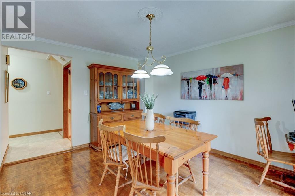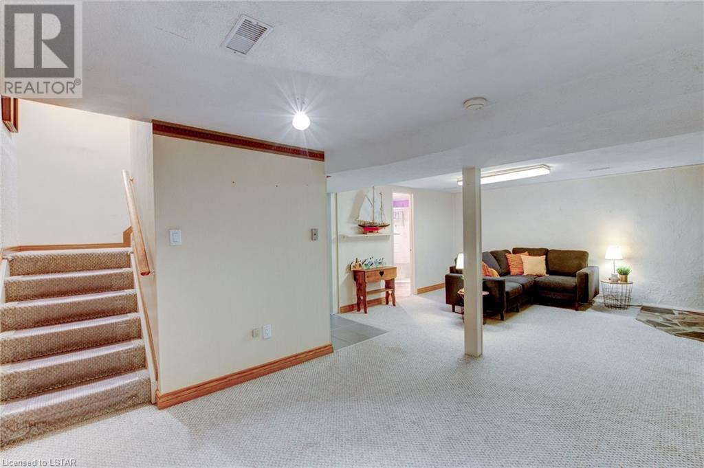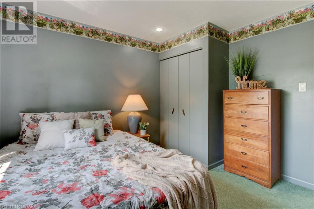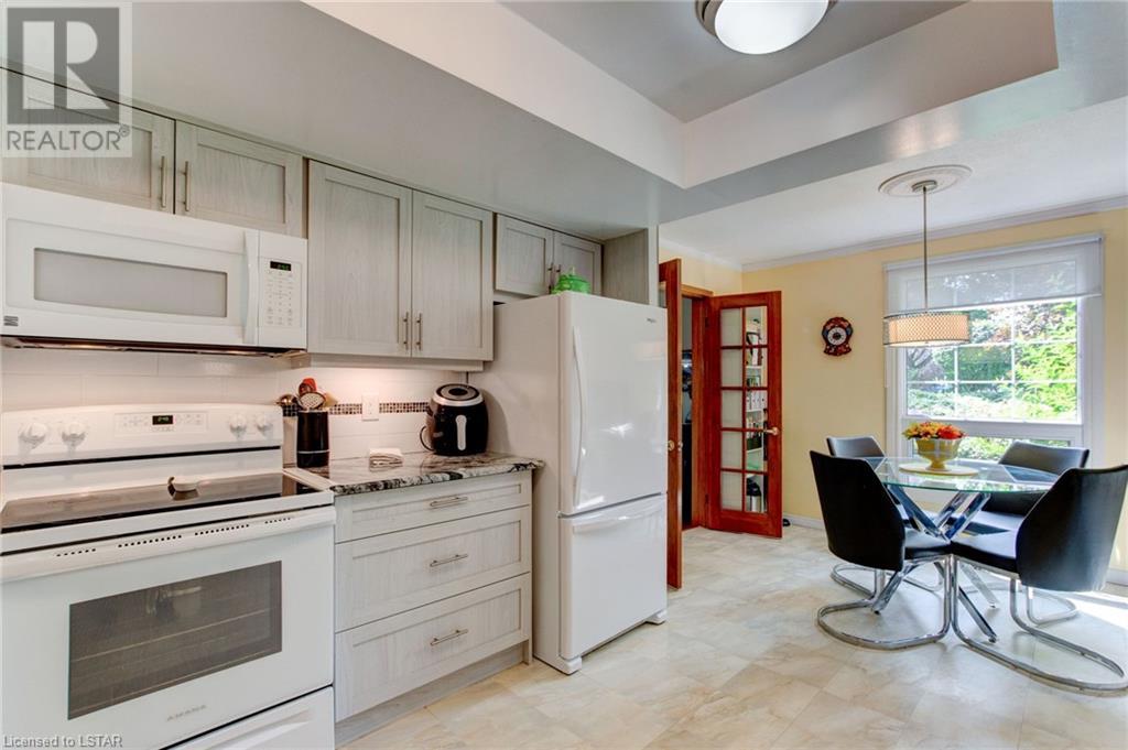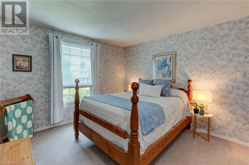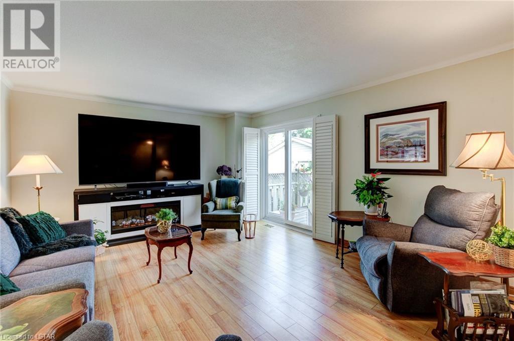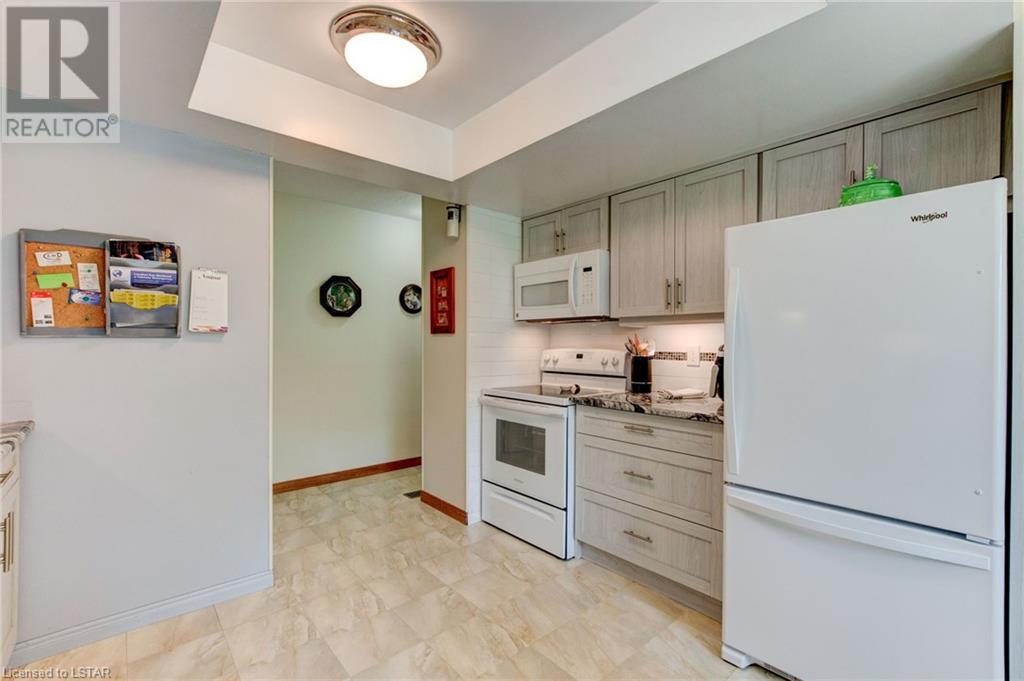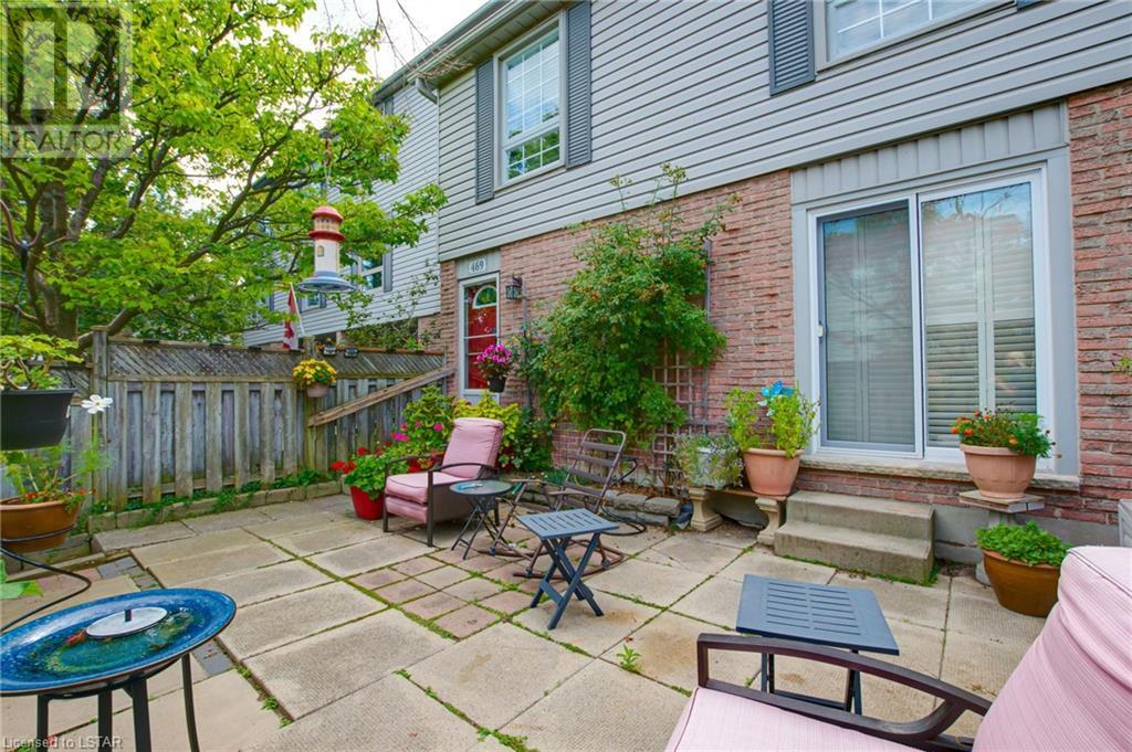 Looking for just the right home to get your family into the market? This outstanding west-end townhome is ready to welcome a new family. Located in a mature, well-maintained community in prestigeous Oakridge, this home has a great layout that’s perfect for busy families. The main level includes a warm, welcoming living room with patio door access and lots of natural light. It also offers a large formal dining room (again, tons of light!) and an awesome, cozy breakfast nook for everyday meals. The updated kitchen includes well-designed storage space in clean, modern cabinets, all framed by a stylish tile backsplash. Upstairs provides three large bedrooms, including an expansive primary with Canadian oak hardwood (2021), double closets and cheater access to an updated 3 piece main bath with large walk-in shower. The lower level has been finished with a great rec room with corner fireplace, another 3 piece bath, and a storage room/workshop with workbench included and a separate utility/laundry room. There’s more to love outside: You have walkout access to a front patio as well as rear greenspace, and an oversized detached single garage. Functional updates abound: electrical panel and electrical switches/receptacles (2023), furnace (2022), plus newer kitchen stove (2022) and fridge (2020). This home is in a sought-after neighbourhood close to parks, schools, trails, and golf at Thames Valley Golf Course. Shopping, services, and restaurants are all close at hand thanks to quick access to Hyde Park and easy access to the Wonderland South corridor. Come enjoy the cul de sac annual gathering as you meet your new neighbours. (id:22211)