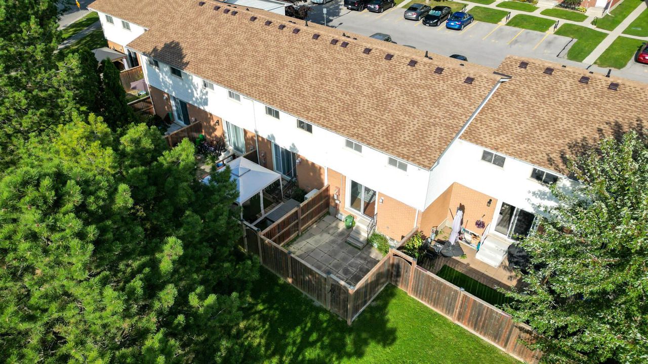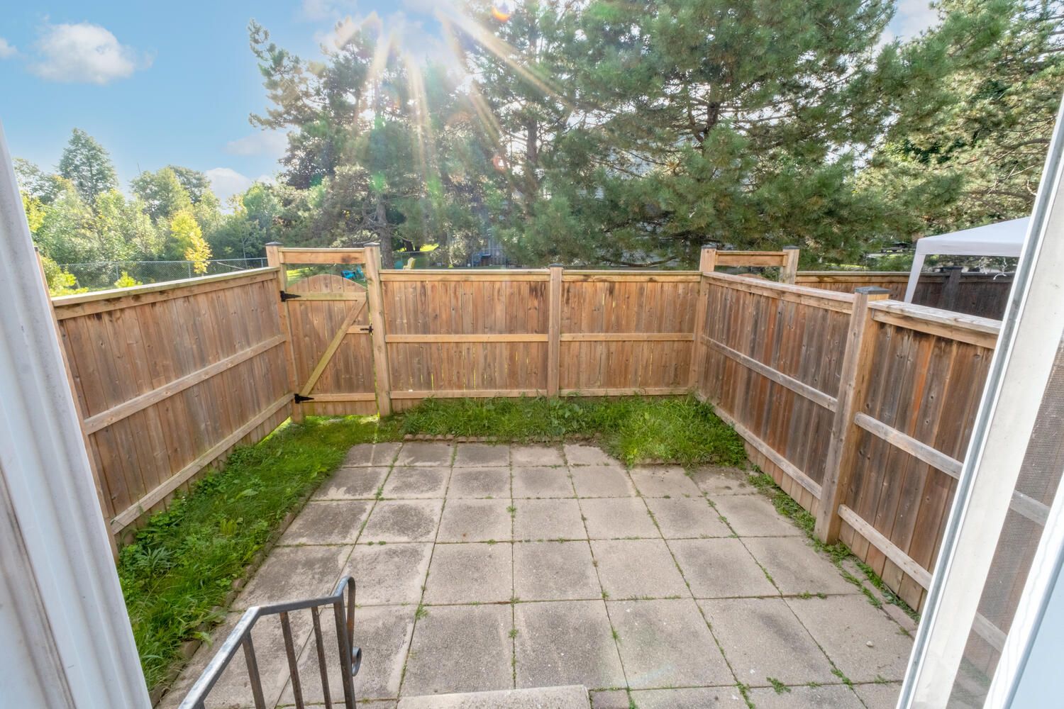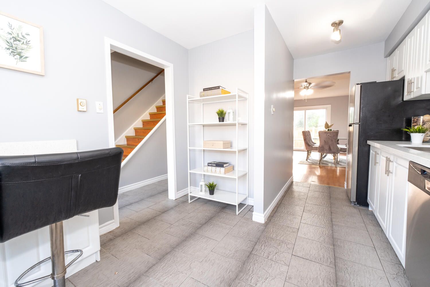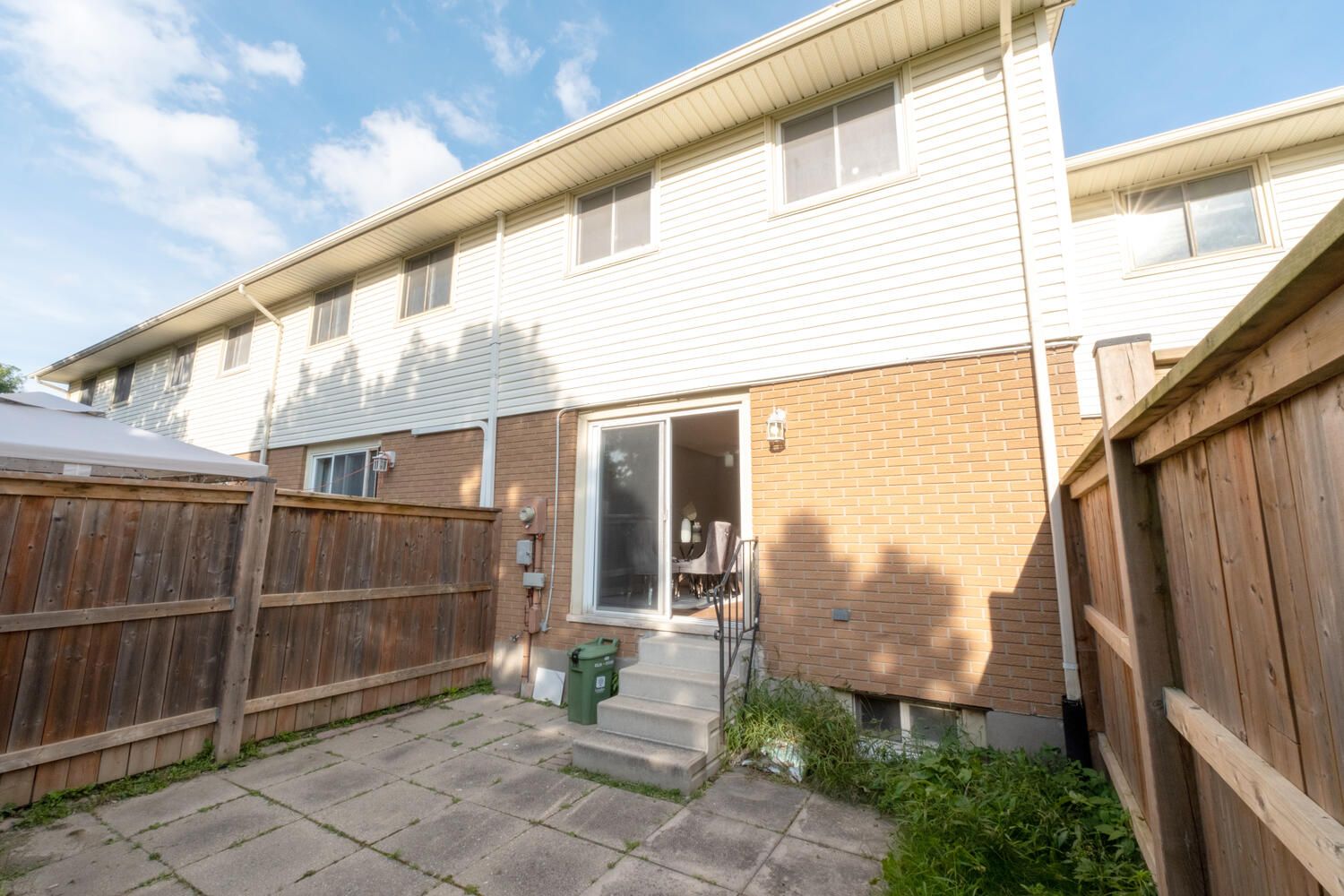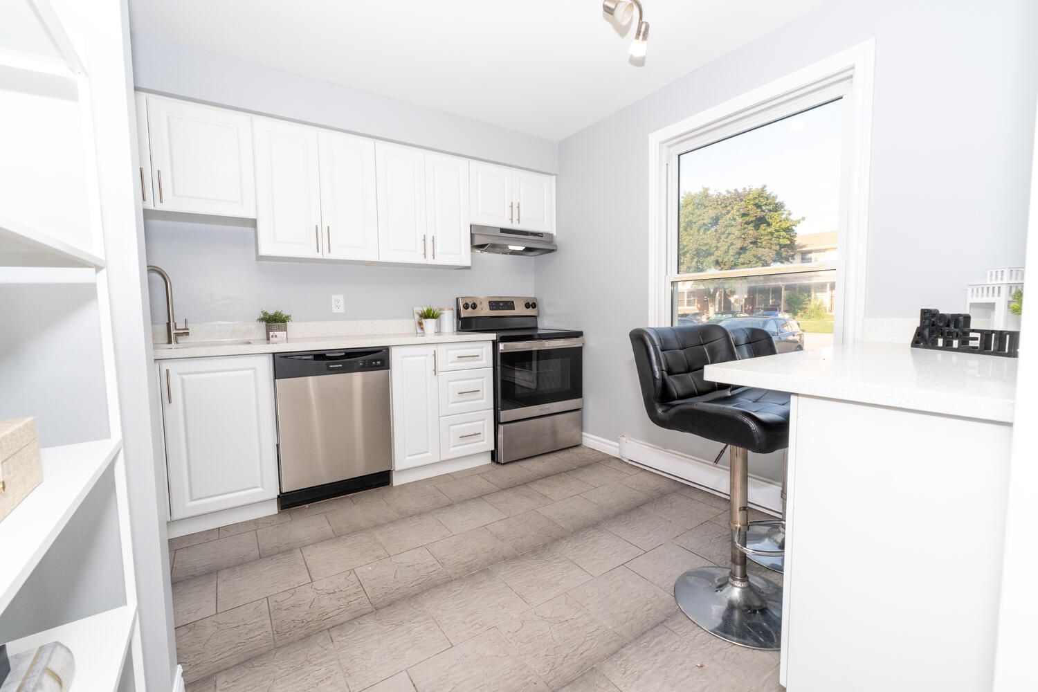 This attractive 3-bedroom, 3-bathroom townhouse is situated in the desirable White Oaks neighbourhood. It offers a low monthly condo fee , making it an excellent choice for first-time homeowners, professionals, or investors. The residence boasts an updated kitchen with a new quartz countertop, a double sink, and a brand-new, unused cooking range and dishwasher (2024). The laundry appliances (2022), refrigerator (2022), and completely renovated bathrooms with large, high-quality vanities are part of the recent upgrades. The open-plan living and dining areas have been newly painted. This unit features 3 ample bedrooms and is unique with its 2.5 bathrooms. The finished basement provides an ideal space for family entertainment, and the private, fenced backyard is perfect for morning relaxation. Additionally, there is a green space behind the property for tranquil strolls. Its prime location is within walking distance to White Oaks Mall, the library, community center, and bus routes, plus it's just a short drive to the 401.