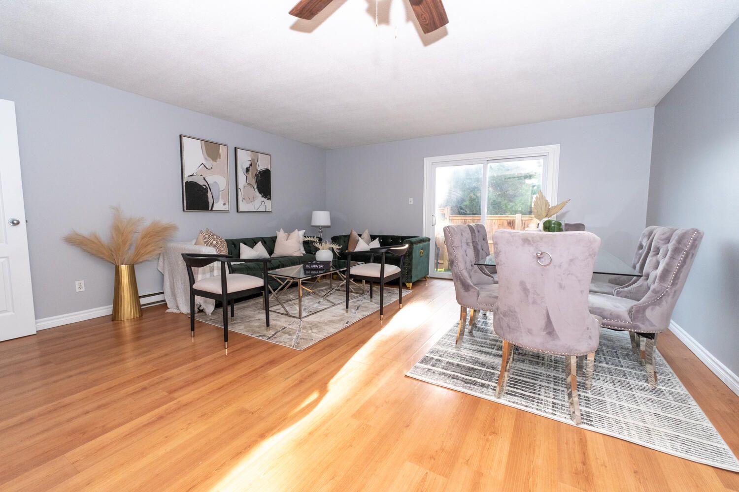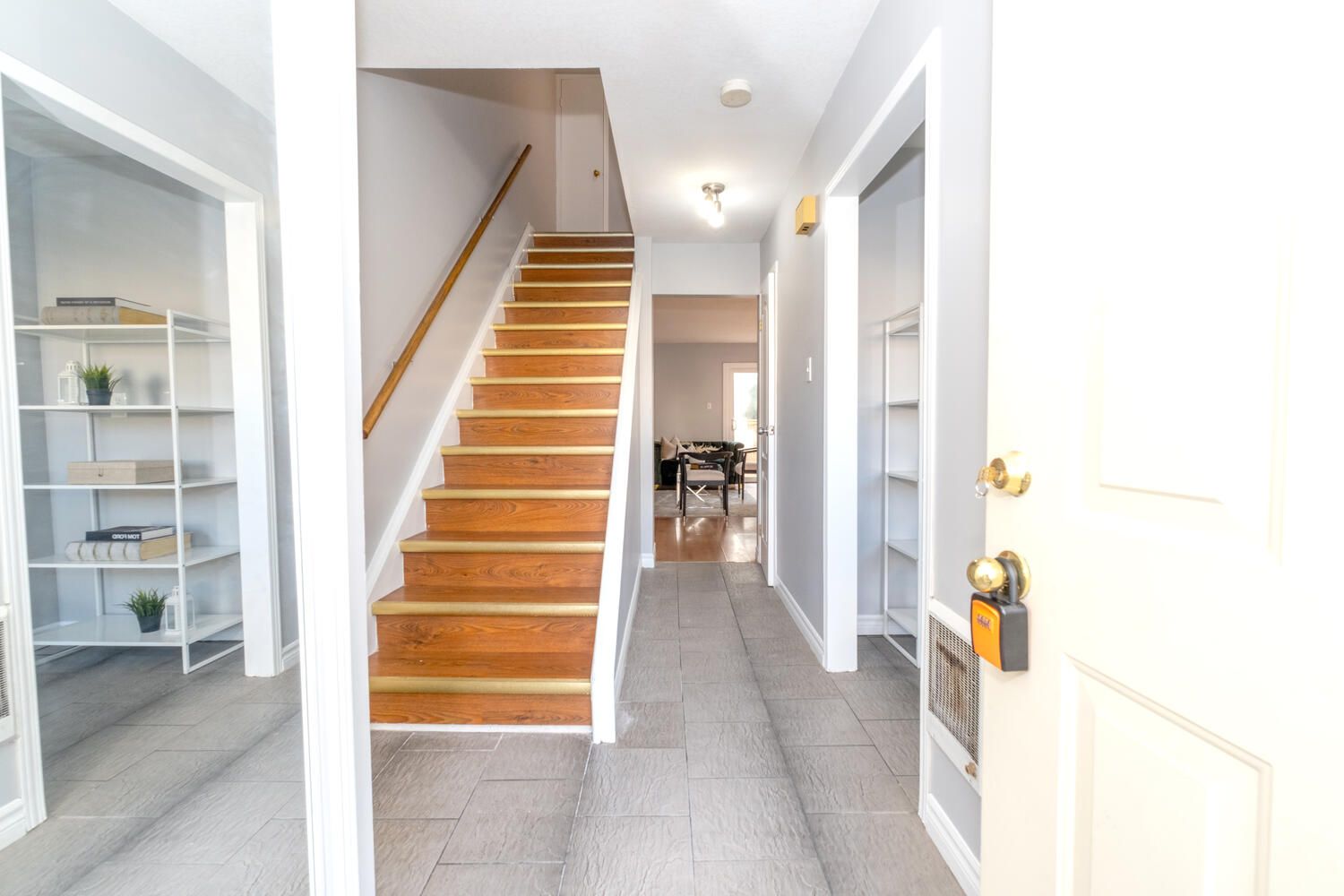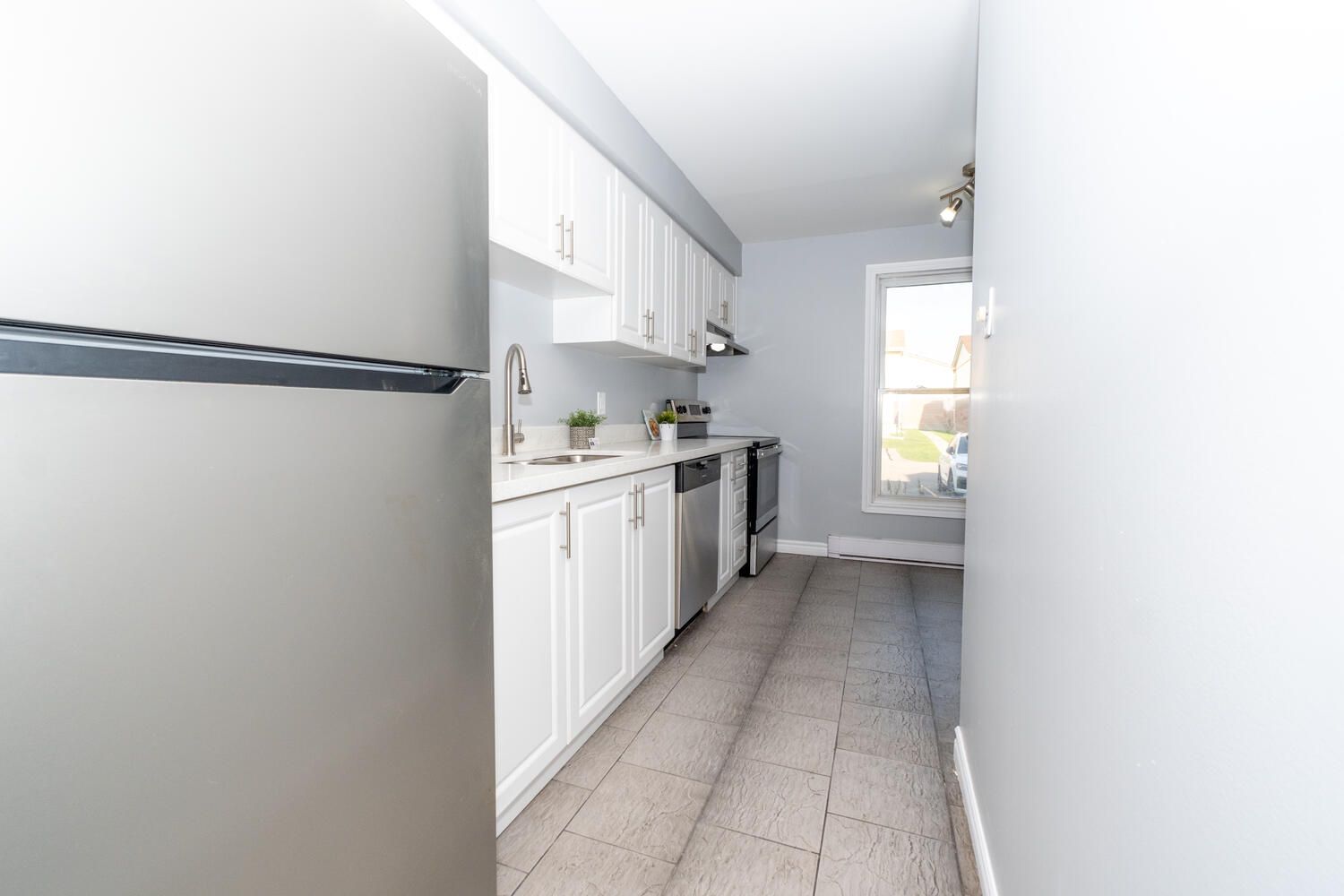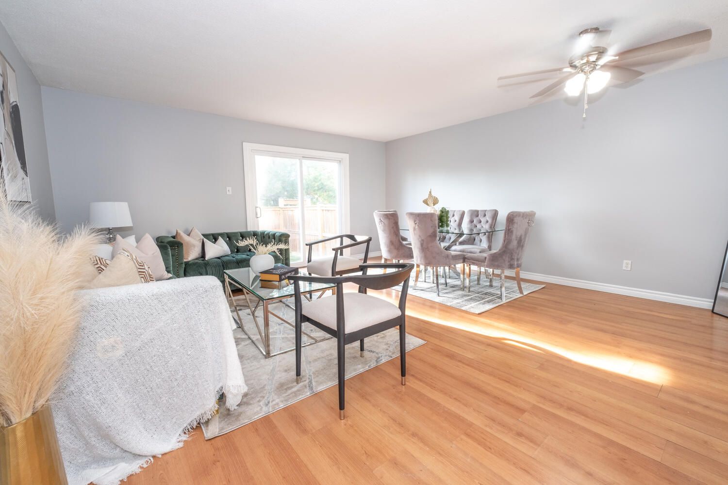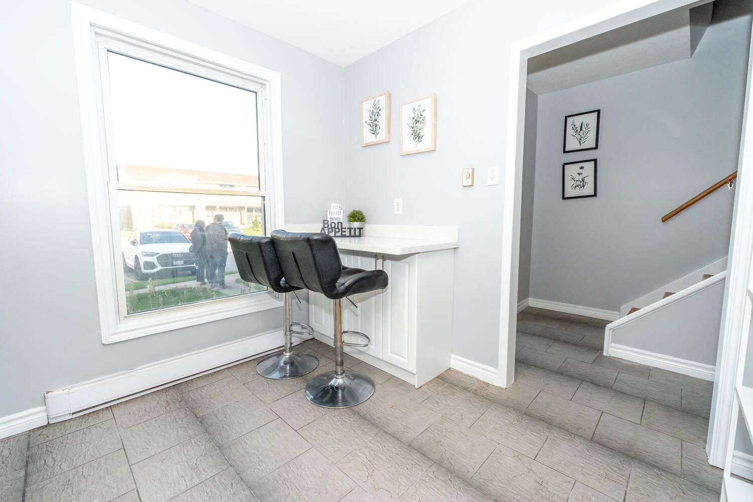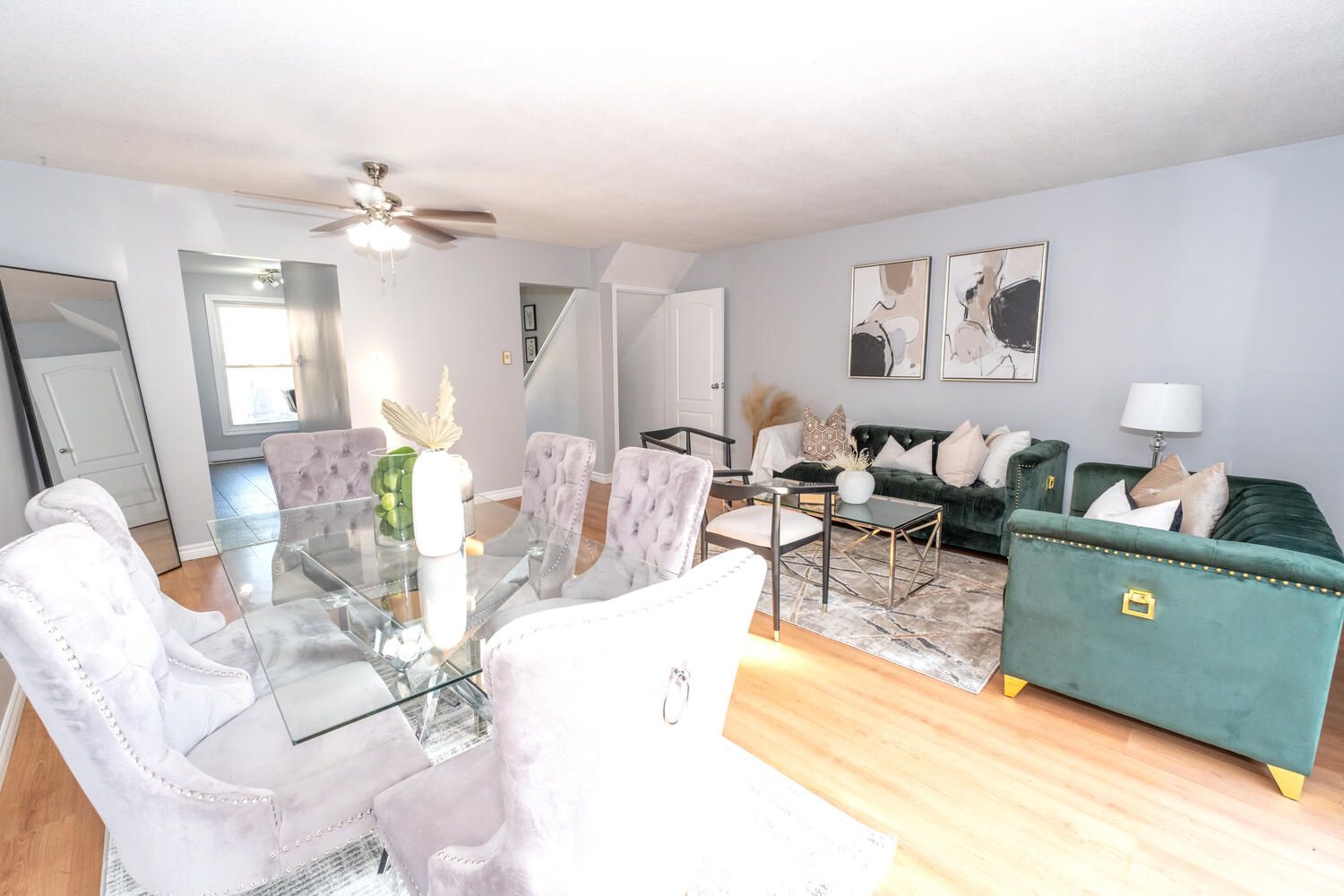 This attractive 3-bedroom, 3-bathroom townhouse is situated in the desirable White Oaks neighbourhood. It offers a low monthly condo fee , making it an excellent choice for first-time homeowners, professionals, or investors. The residence boasts an updated kitchen with a new quartz countertop, a double sink, and a brand-new, unused cooking range and dishwasher (2024). The laundry appliances (2022), refrigerator (2022), and completely renovated bathrooms with large, high-quality vanities are part of the recent upgrades. The open-plan living and dining areas have been newly painted. This unit features 3 ample bedrooms and is unique with its 2.5 bathrooms. The finished basement provides an ideal space for family entertainment, and the private, fenced backyard is perfect for morning relaxation. Additionally, there is a green space behind the property for tranquil strolls. Its prime location is within walking distance to White Oaks Mall, the library, community center, and bus routes, plus it's just a short drive to the 401.