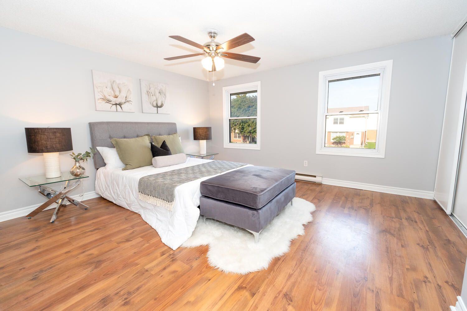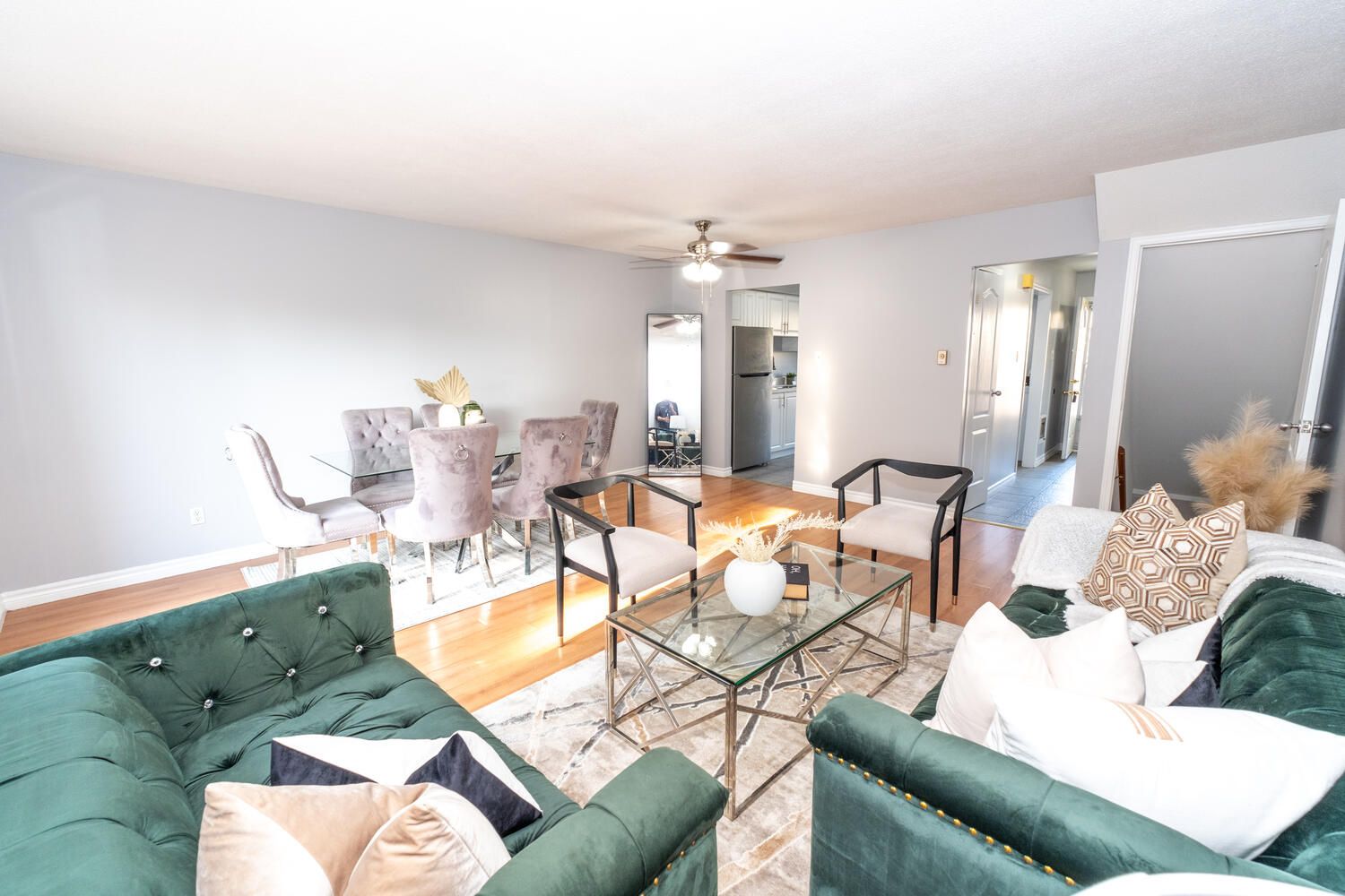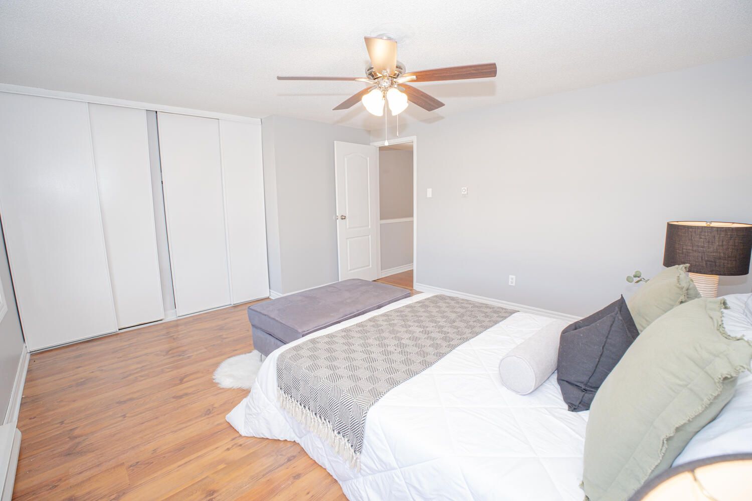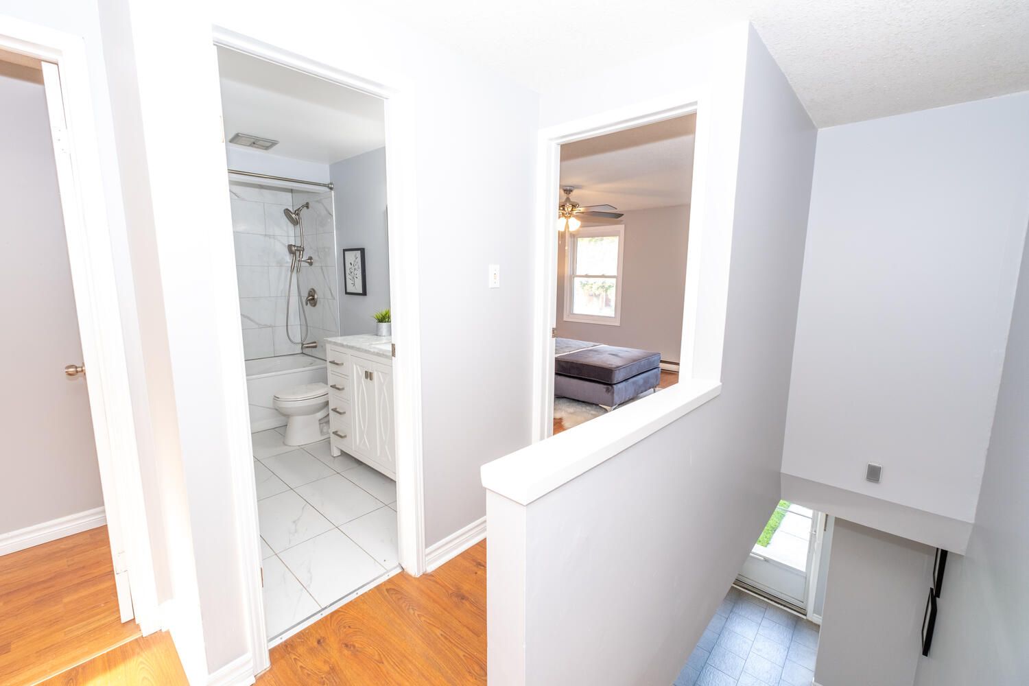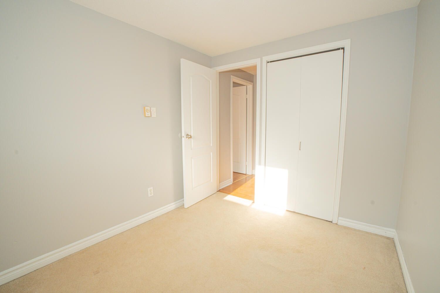 This attractive 3-bedroom, 3-bathroom townhouse is situated in the desirable White Oaks neighbourhood. It offers a low monthly condo fee , making it an excellent choice for first-time homeowners, professionals, or investors. The residence boasts an updated kitchen with a new quartz countertop, a double sink, and a brand-new, unused cooking range and dishwasher (2024). The laundry appliances (2022), refrigerator (2022), and completely renovated bathrooms with large, high-quality vanities are part of the recent upgrades. The open-plan living and dining areas have been newly painted. This unit features 3 ample bedrooms and is unique with its 2.5 bathrooms. The finished basement provides an ideal space for family entertainment, and the private, fenced backyard is perfect for morning relaxation. Additionally, there is a green space behind the property for tranquil strolls. Its prime location is within walking distance to White Oaks Mall, the library, community center, and bus routes, plus it's just a short drive to the 401.