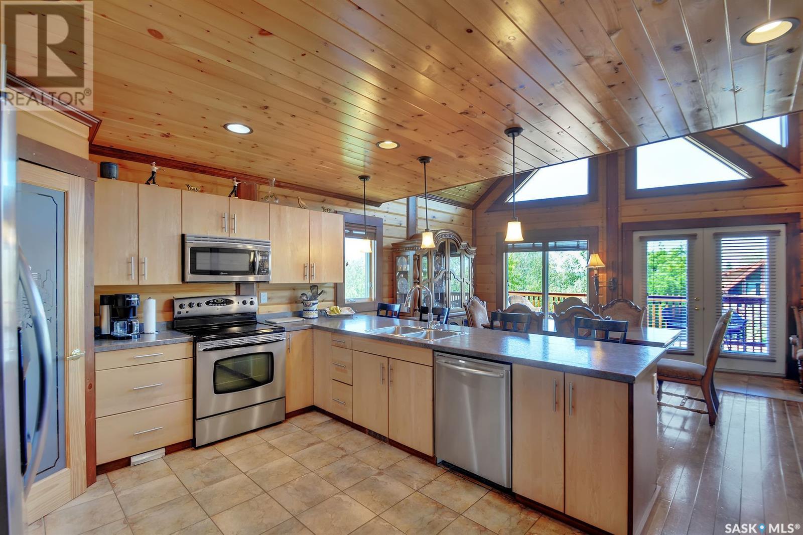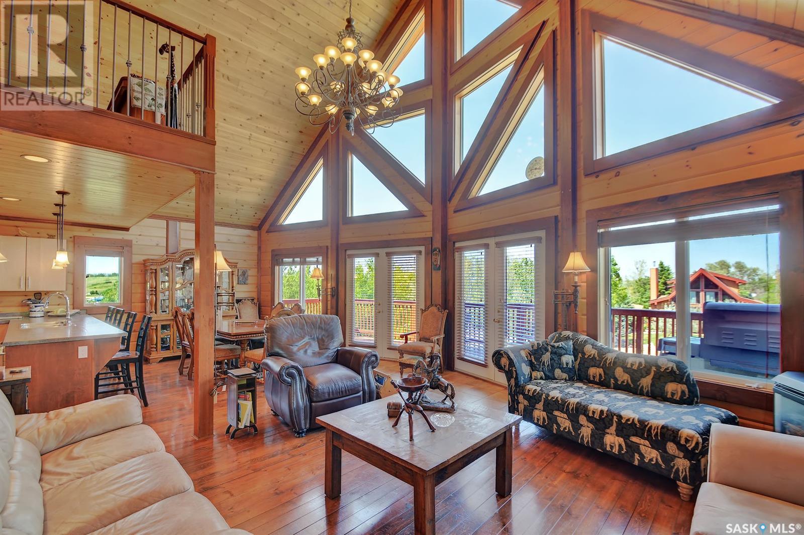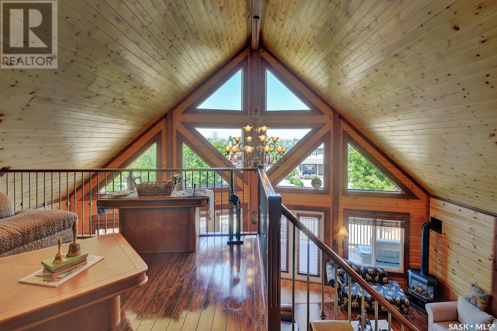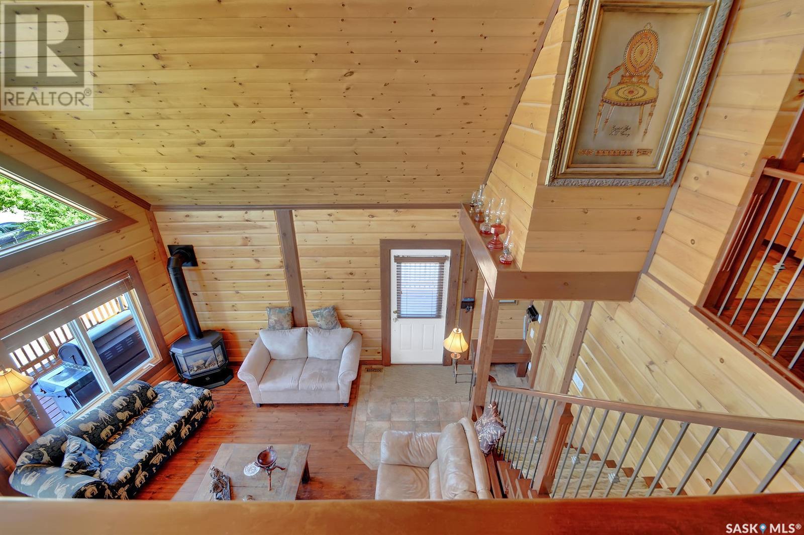 WOW! What else could you ask for? Fully furnished opulent home on double lot offering a 100ft frontage. This beautiful Timber Block engineered home is perched atop the hills of Manitou Beach and shines inside and out! Exceptional street appeal featuring a massive deck to enjoy overlooking lake view. Upon climbing the stairs you enter the foyer spilling into the open living, dining and kitchen spaces that is spellbinding! Featuring exceptional workmanship and the beauty of pine finishings and flooring throughout. The living and dining spaces run across the front of home and feature floor to ceiling doors and windows spilling beautiful natural light into the space. In the evening cozy up in front of the gas fireplace and watch the stars. And wait till you see the chandelier! Kitchen has a very large peninsula with seating and lots of counter space for food prep and entertaining. The master suite is on the main level and cleverly shares access to the main bath/laundry which has a walk in shower, show stopping deep soaker claw foot tub and tastefully concealed washer & dryer. The loft is a spacious 540 sq. ft. with shed dormers. This level offers a "swing space" (bedroom/media/ office) many options to make it your own haven with a magnificent view. There is a 3 piece bath on this level as well with a 2 person walk in shower. The basement has a large recreation room with wet bar and gas fireplace. Great space for family fun for kids and adults alike. This level is completed with 2 more large bedrooms, 3 piece bath and utility room. Floors on lower level with the exception of the bathroom are cork, soft and warm on the feet. So many details: R30 walls, R40 ceiling, metal roofing, triple concrete drive, custom Hunter Douglas blinds, natural gas BBQ hookup, central vac, air conditioning, stainless appliances, large pantry and the storage and closet space is exceptional! If you are looking for one of the nicest homes in one of the best locations at Manitou Beach this is it! (id:22211)