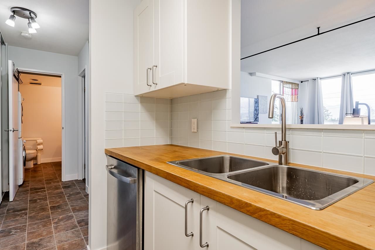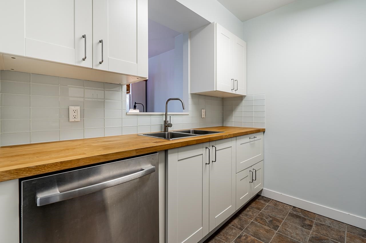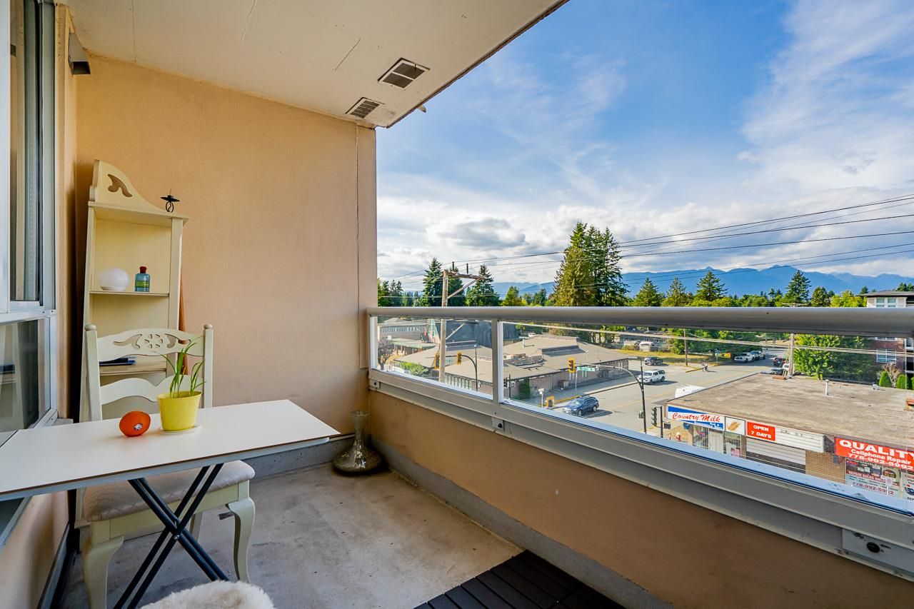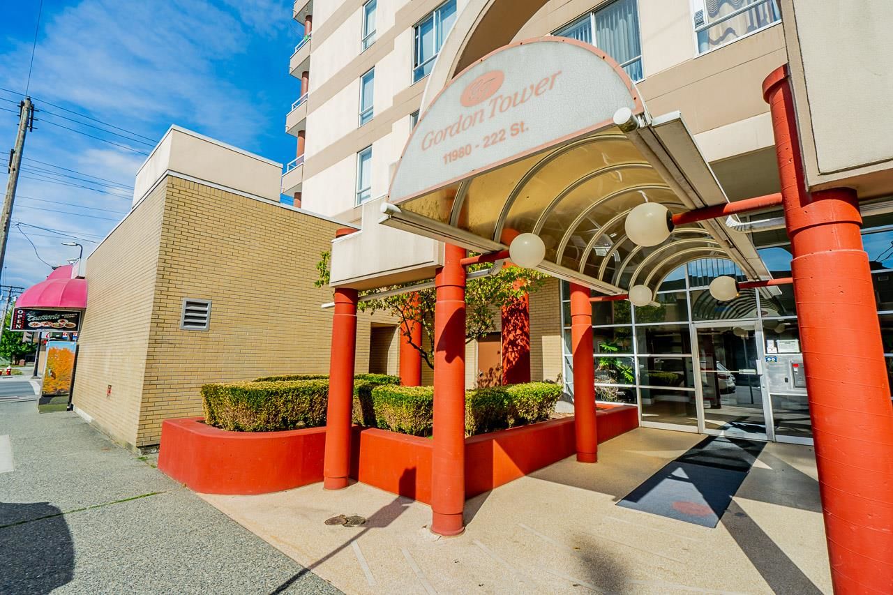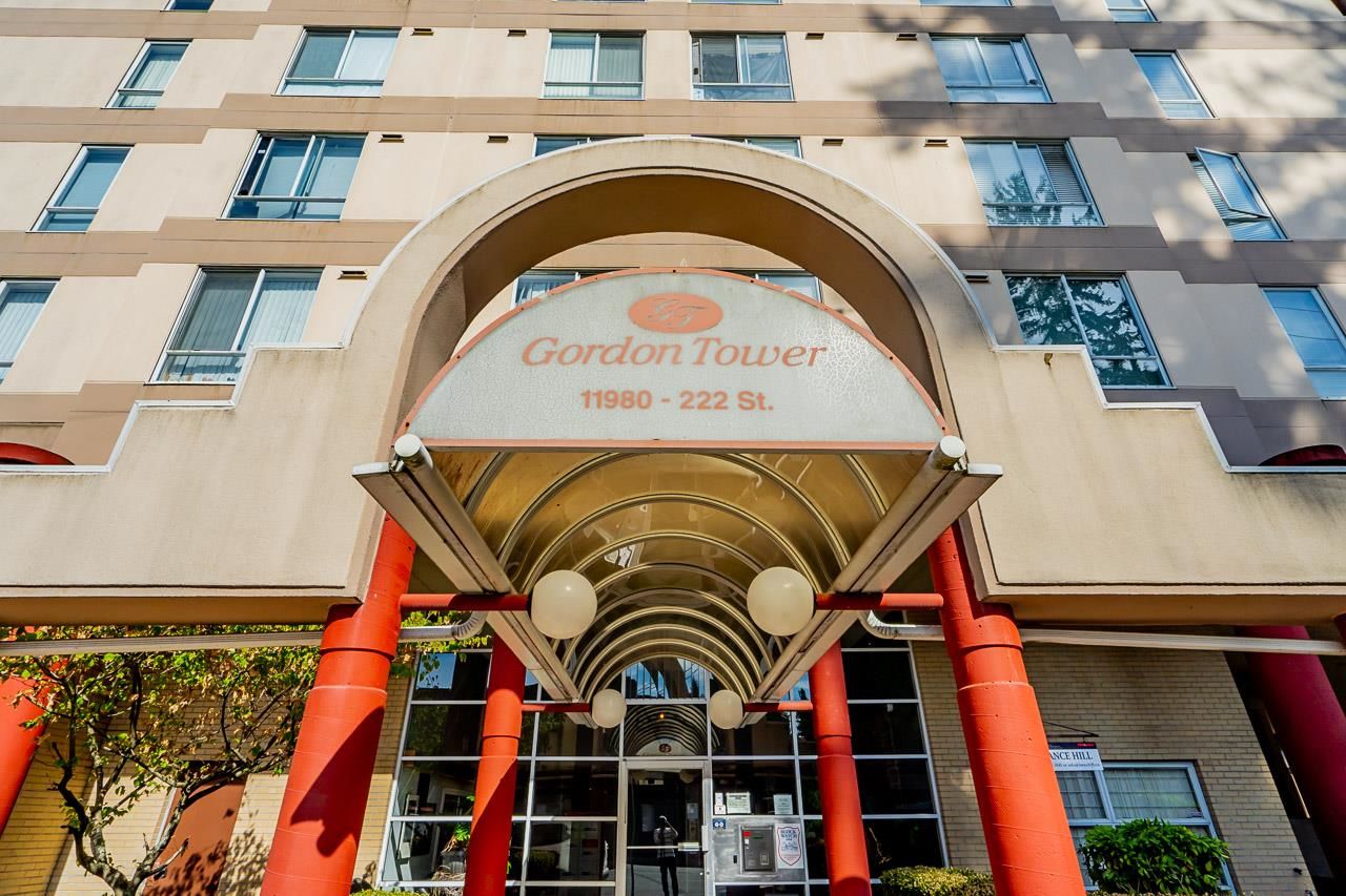 WOW! UPDATED 4th floor unit in the CONCRETE Gordon Towers! NEW shaker style cabinets, NEW butcher block counter tops, NEW backsplash, NEW Stainless Steel kitchen appliances, NEW wide plank laminate floor, NEW paint, NEW light fixtures, NEW floor to ceiling closet doors! NOTHING to do here but move in and enjoy this SPACIOUS one bedroom home with a northern MOUNTAIN VIEW and covered deck! HOT WATER included in the LOW strata fee! WALK to the West Coast Express and all the amenities of downtown Maple Ridge!