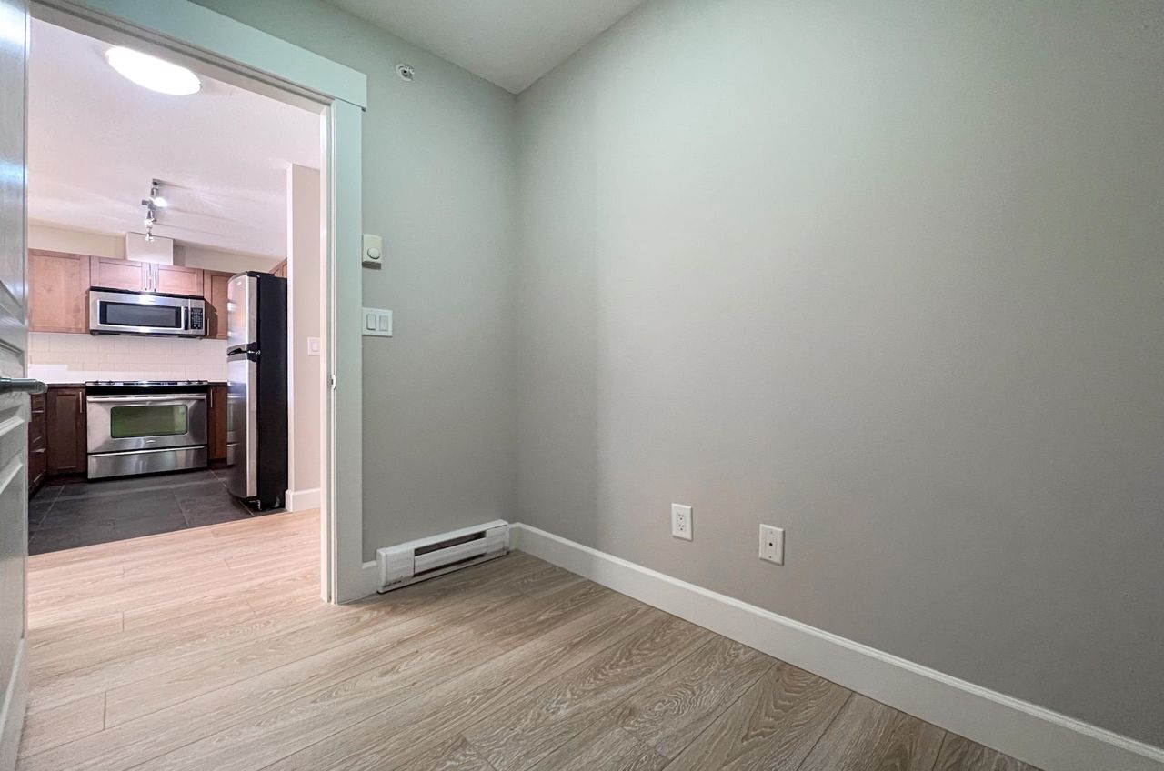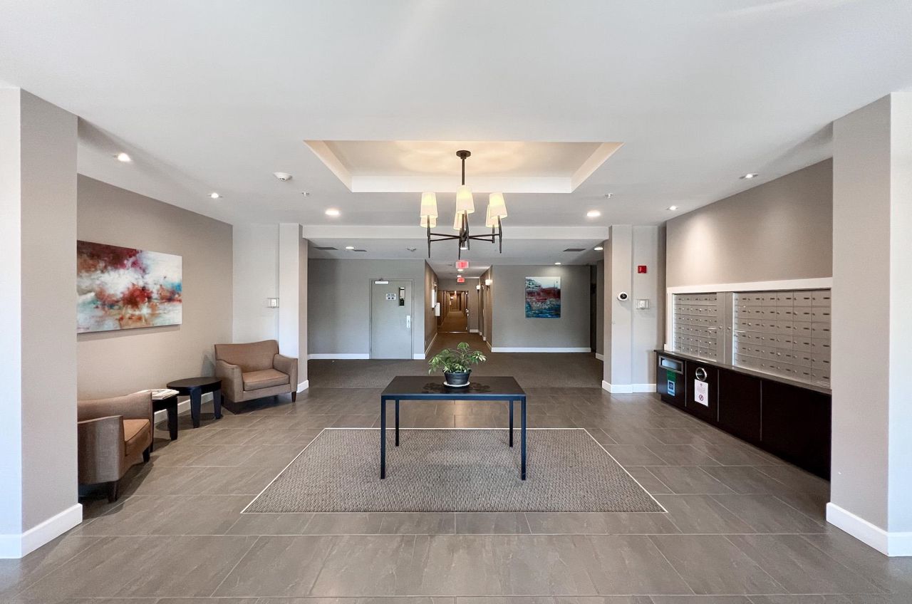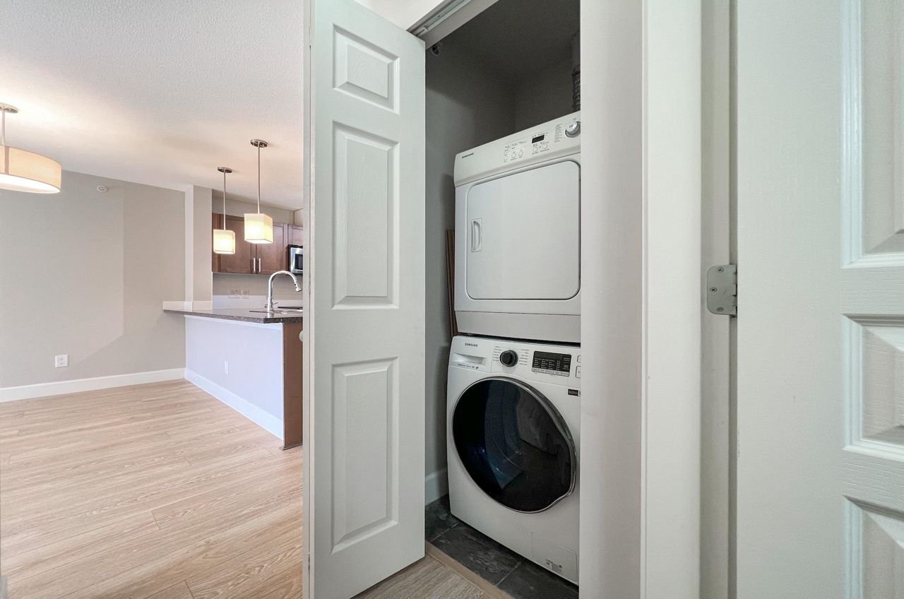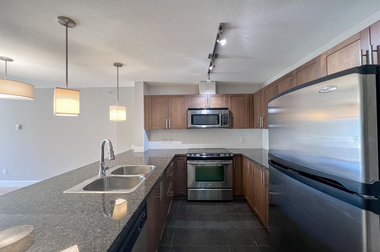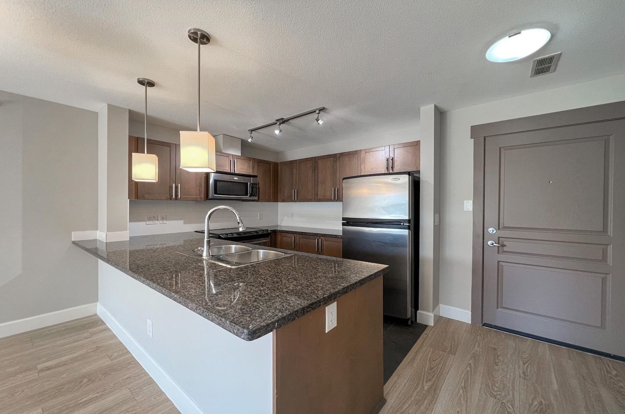 The Maxx, built by MacLean Homes, NEW RENOVATED one bedroom & a Den, top unit. New laminated flooring, Fresh painting, brand new windows/door blinds in living room. Newer Washing/Dry machine (less than 1 year). Only 64 suites in this 4 storey building. Secured parking & close to downtown, shopping, schools, transit, seniors centre, recreation & all services. Features granite counters & stainless steel appliances. Move-in ready!
