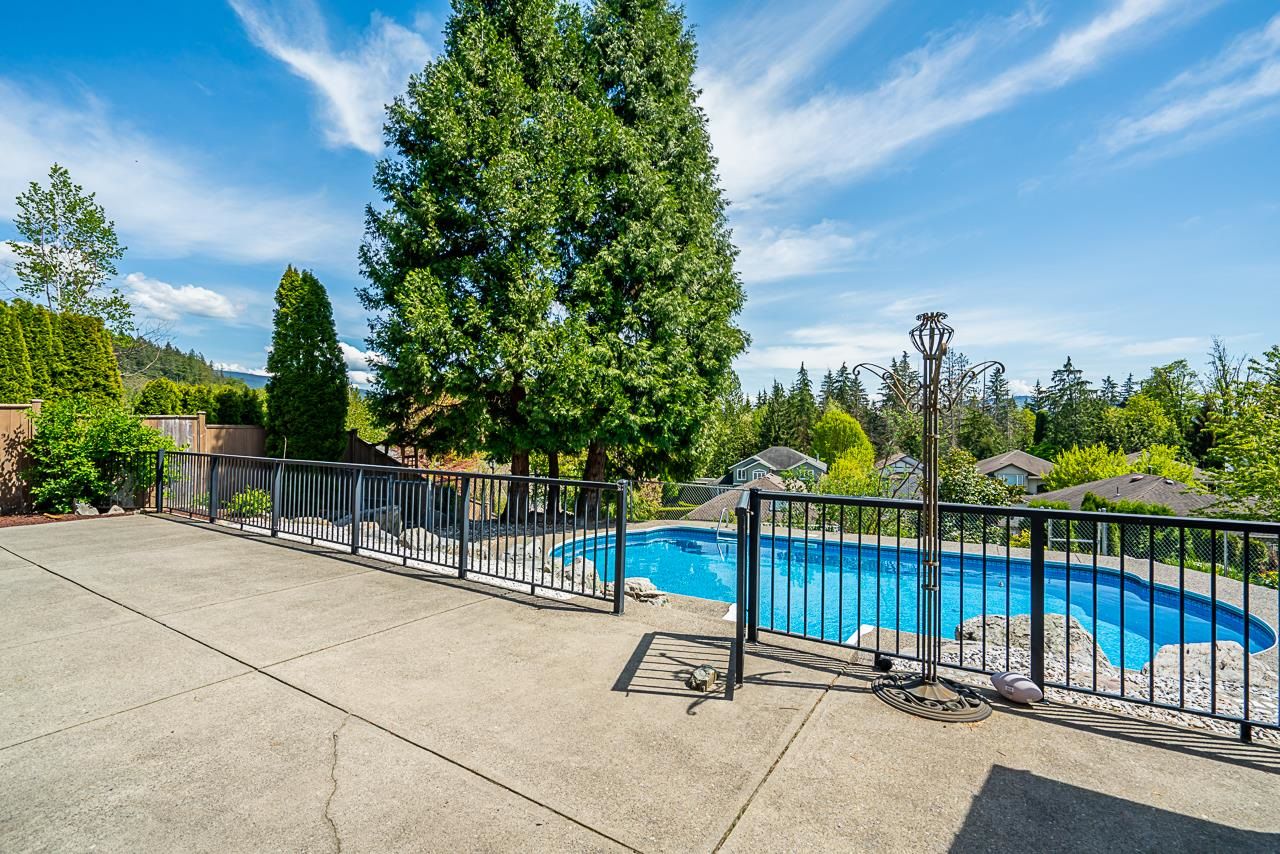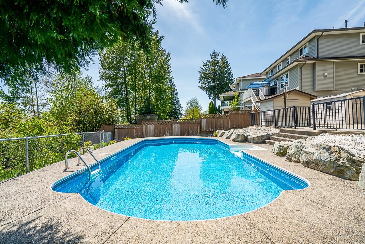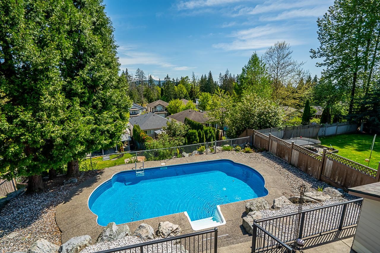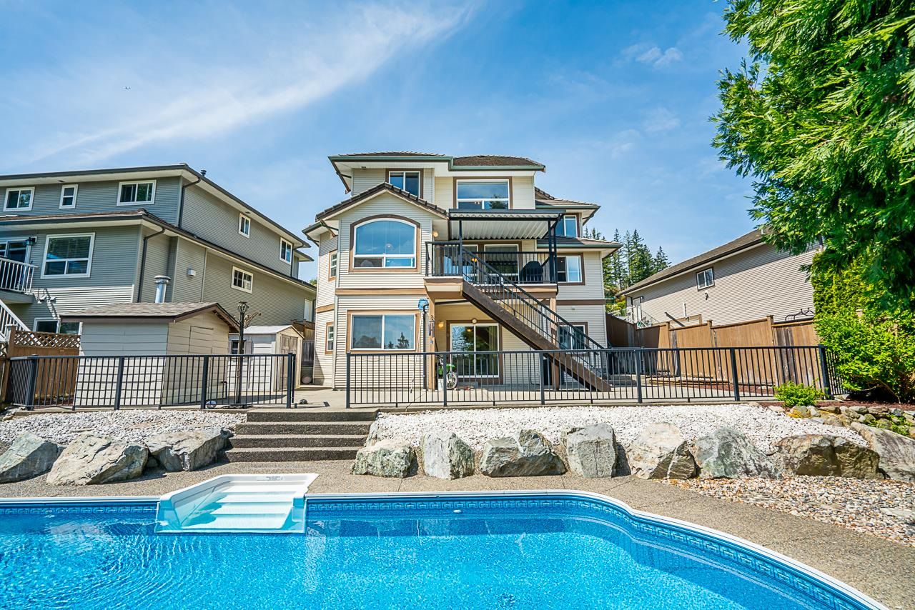 Silver Valley awaits you! In the desirable Rockridge neighbourhood, this is an absolutely BEAUTIFUL 3 storey home w/fully finished walk-out basement that leads out to a covered patio & large, low-maintenance backyard, featuring a 16 x 32' in-ground heated pool. This home boasts views of Mt. Baker & the Golden Ears mountains. Bright & open floor plan with tons of features which include split staircase, 12' ceiling in living room & dining room with custom designed coffered ceiling, 3 full baths and 2 piece powder room, tiled entry with 18' ceiling, built-in bookshelf in large family room, concrete tile roof - the list goes on! Basement can easily be converted into a suite, which currently has a wet-bar and massive rec room. This home has been meticulously maintained and it shows!