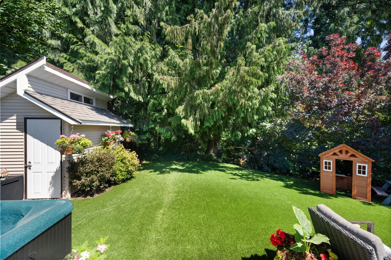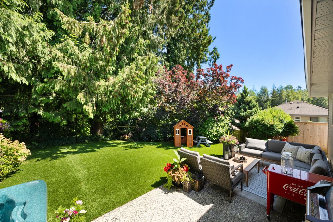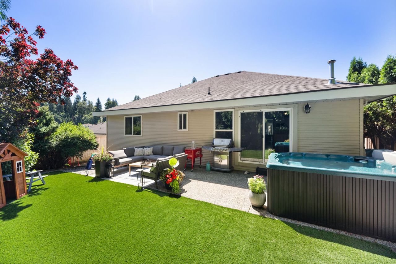 Welcome to the sought after neighbourhood of Kanaka Creek! This tastefully updated 3 bed 2 bath unique rancher style home with a bonus loft/media room sits on a 6003 Sqft lot backing onto the protected green space of Kanaka Creek. Featuring spacious single level living with laminate flooring throughout, updated kitchen with quartz countertops and updated backsplash, fully renovated bathrooms and updated laundry room with new appliances and built in cabinetry. Step out to the private backyard oasis surrounded by nature with recently installed high end no maintenance turf, hot tub and storage shed. Other highlights: massive bonus attic storage, EV charging, built in vacuum. Conveniently located mins from transit, parks, schools and shopping. Perfect home for upsizers and downsizers alike!