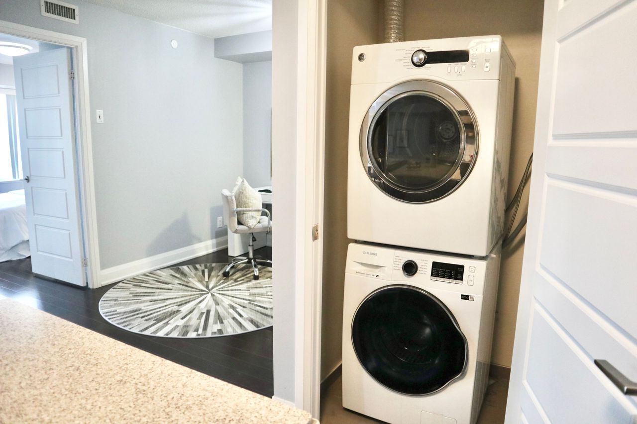 Rapidly Developing Unionville Community, High Level With Sun-Splashed West View. Spacious 1 Bedroom + Den Unit, 640 Sq.Ft. + 52 Sq. Ft Balcony As Per Builder's Plan. Open Concept Living/ Dining/ Den. Quartz Stone Kitchen Countertops With Upgraded Double Undermount Sink, Ceramic Backsplash. 24 Hour Concierge, Visitor Parking, Full Recreational Facilities: Fitness Room, Yoga Studio, Swimming Pool etc. Easy Access To 404 & 407, Go Transit & YRT. Walking Distance To Parks, Whole Food, LCBO & Restaurants, YMCA, Cineplex, Future York University Campus.Stainless Steel Appliances: Fridge, Stove, Dishwasher, Range Hood. Washer & Dryer. All Elfs and Window Coverings. 1 Parking And 1 Locker Included.