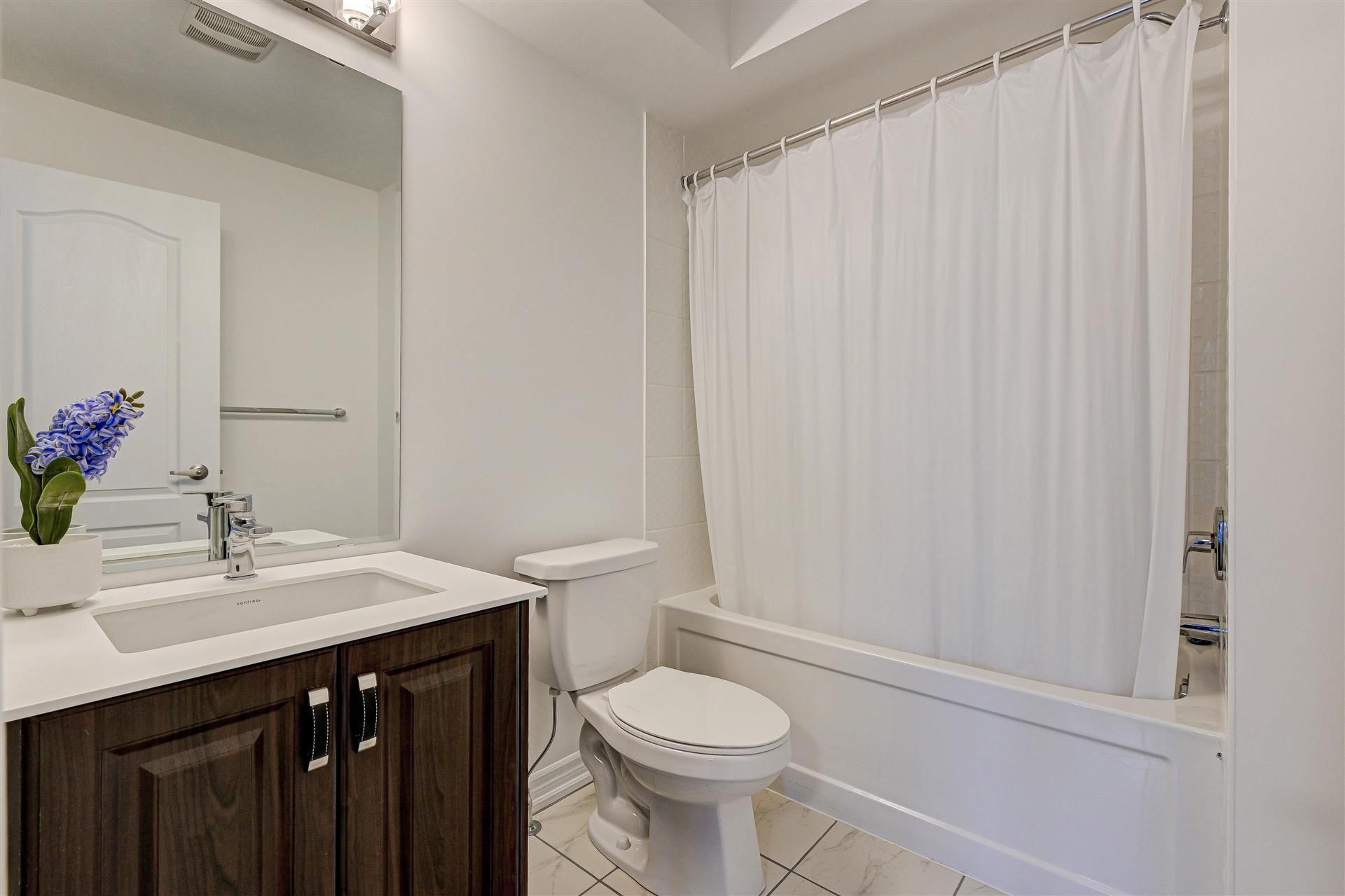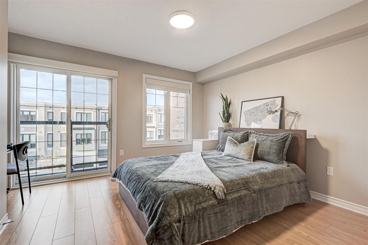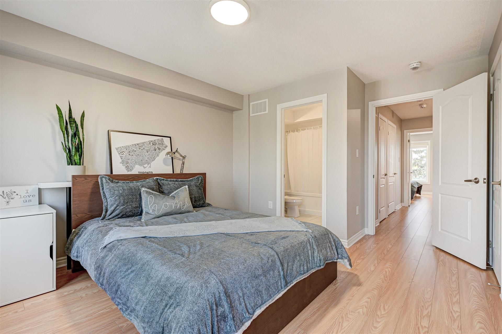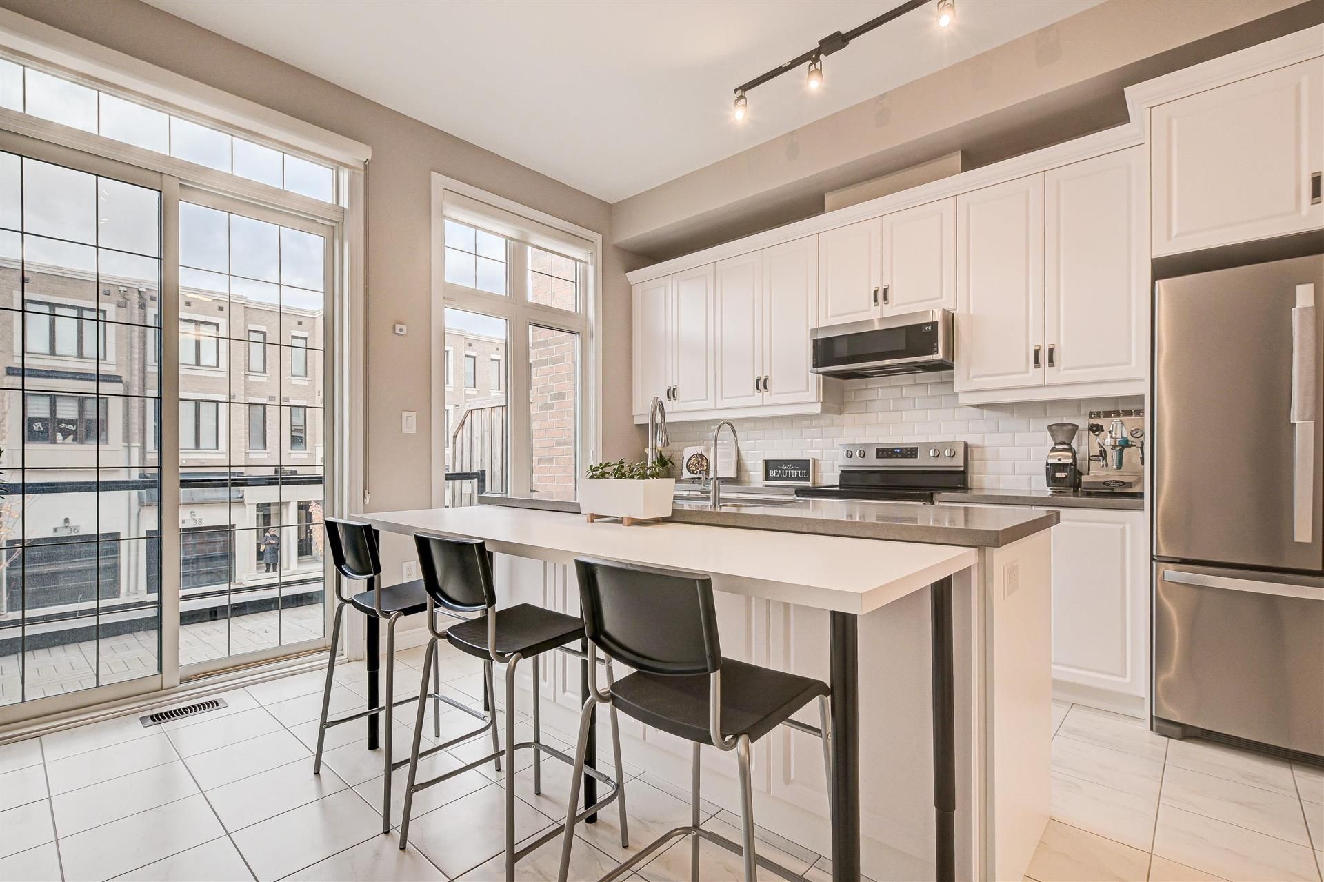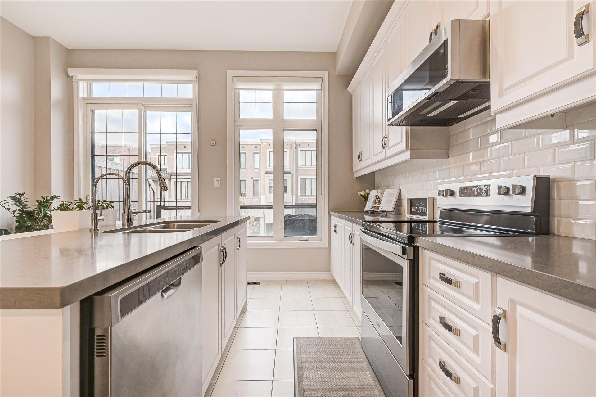 Rarely offered - Contemporary style Town home with three levels of practical living space nested in popular Greensborough community. Main level features an inviting open concept living /dining room with 10 ft. smooth ceiling & sun filled South-Facing large windows, a modern White Kitchen w/ Centre Island and quartz counter finishes, ample tall cabinetry, backsplash, stainless steel appliances, & a walk-out to an open-air Terrance ready for outdoor lounge & BBQ fun. Upper level provides the cozy comfort of laundry station, and Ensuite bath for both bedrooms. Ground level, with welcoming 9 ft. ceiling, finished w/ a spacious recreation space, 3 pcs Bath (w/shower) & above-ground large window (makes perfect use as Home Office) with separate entrance door & a walk-out access to Basement Garage (per MPAC des.) & rear laneway driveway. Prime location w/ close proximity to Mount Joy Go Train Station, Swan Lake Park, all the shops & restaurants Markham Road & 16th Ave corridor has to offer.Proud Original Owner- Well Maintained and Ready for Move In. POTL fee ($136.65) includes garbage and snow removal for common elements.