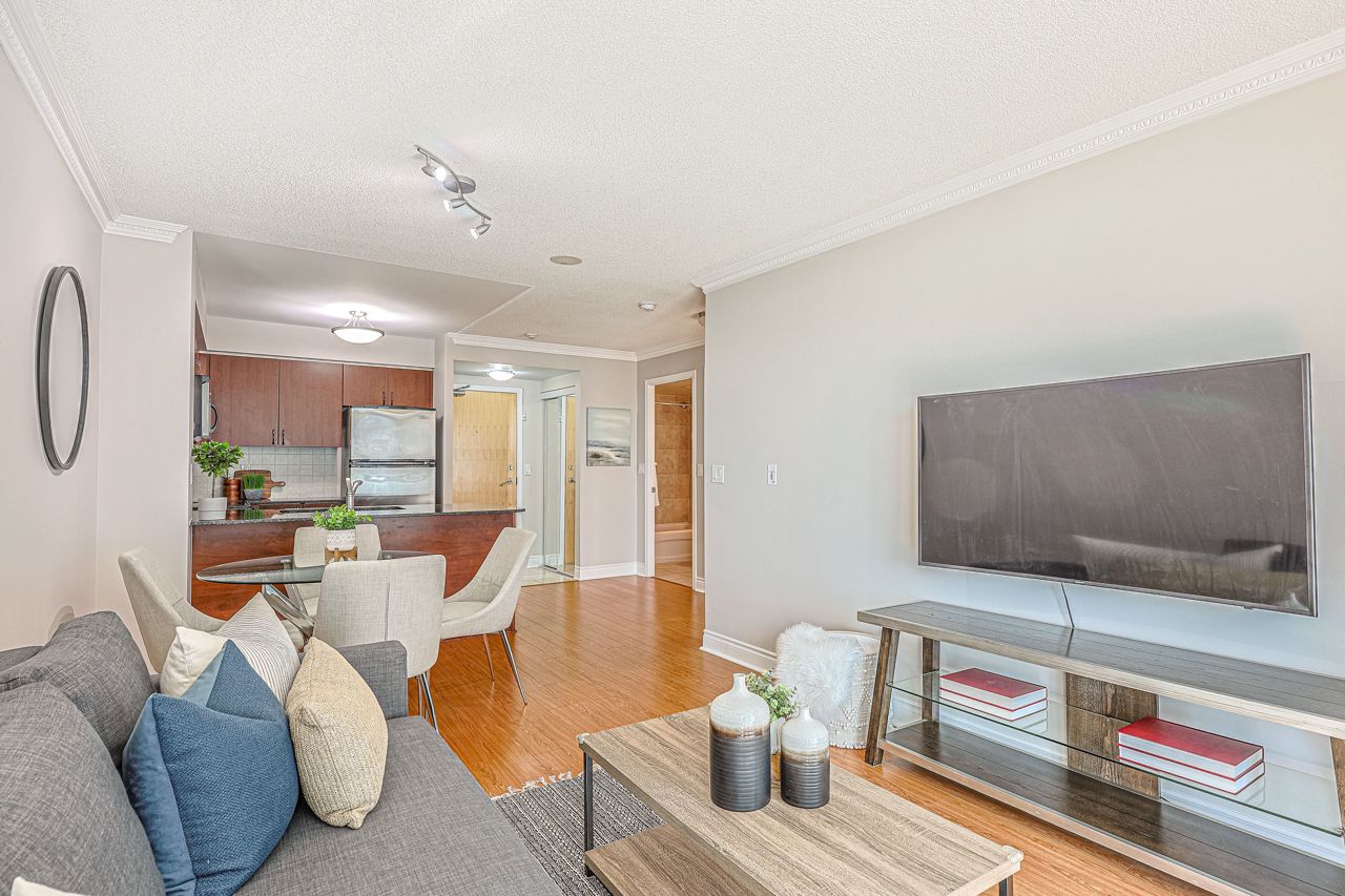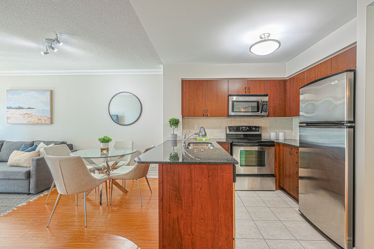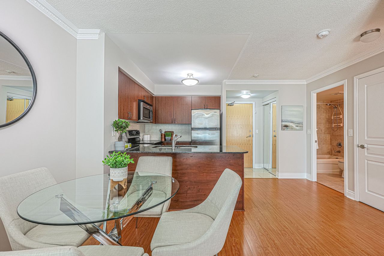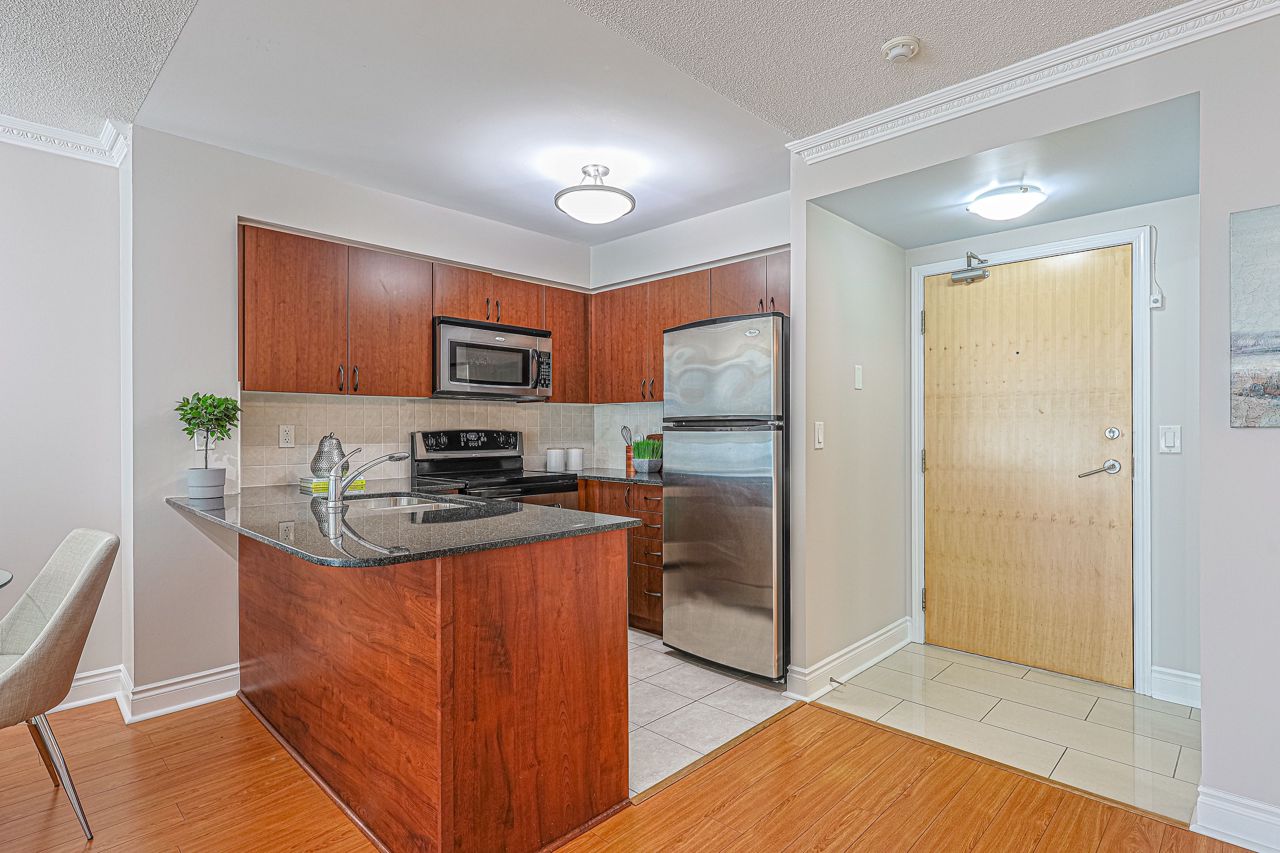 Luxury 1 Bedroom Unit With Sun-Filled Balcony. Approximately 593 Sqft With A Great Functional And Open Concept Layout. The Modern Kitchen Features Granite Countertop & Backsplash And Stainless Steel Appliances. The Living Room Area Is Showcased By The Elegant Crown Moulding. 24 Hour Concierge And With Great Amenities. Walking Distance To Schools, Many Shops, Medical Centre, Hotel, Parks, Close To Go Train Station, Hwy 407 Downtown Markham And The Future York University Markham Campus. A Must See!Existing: Fridge, Stove, Dishwasher, Washer & Dryer, All Elf's, All Window Coverings.