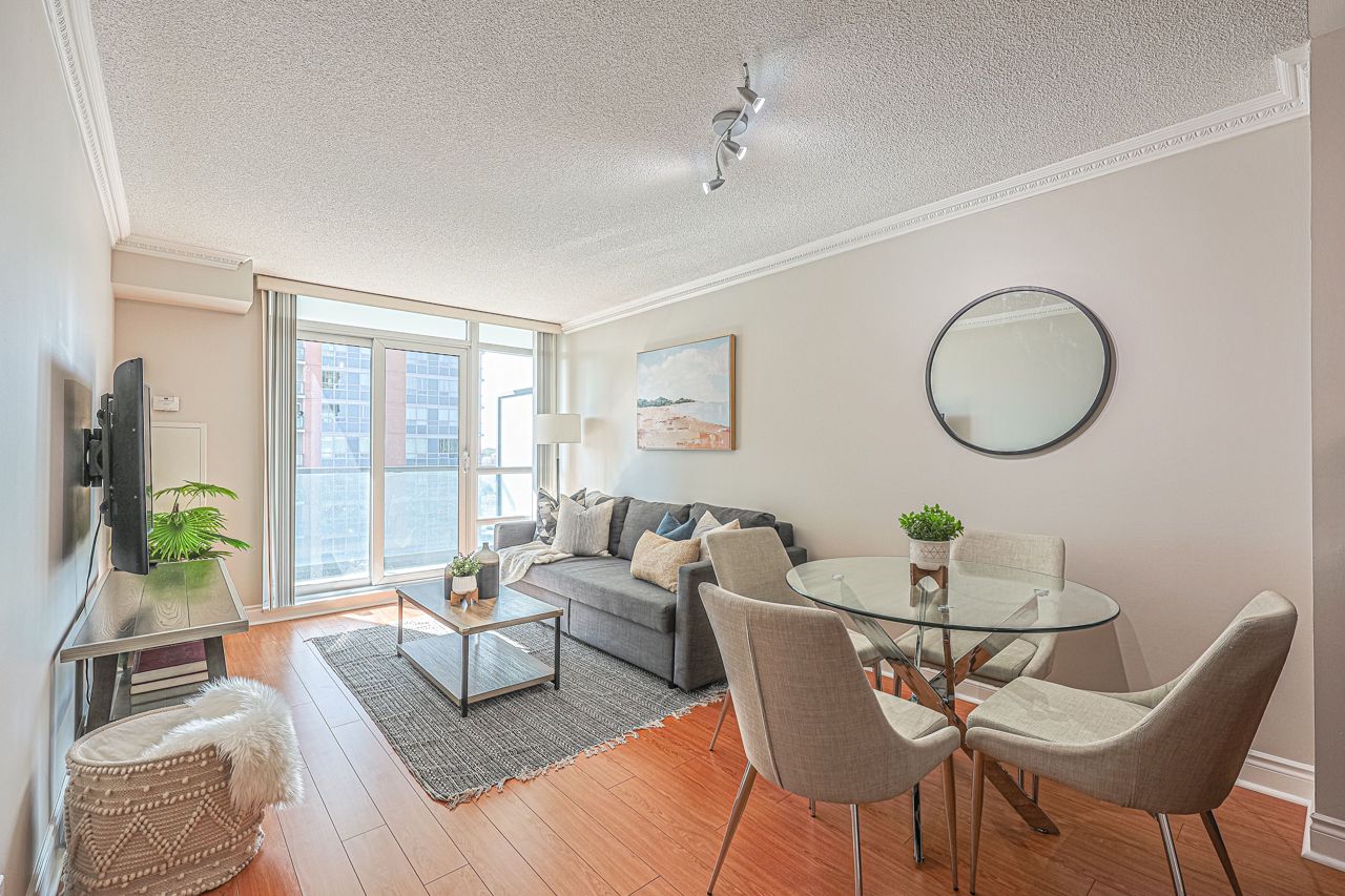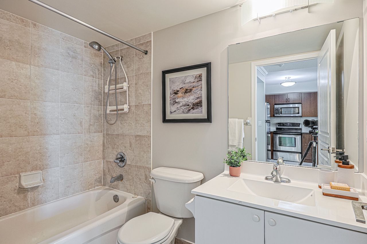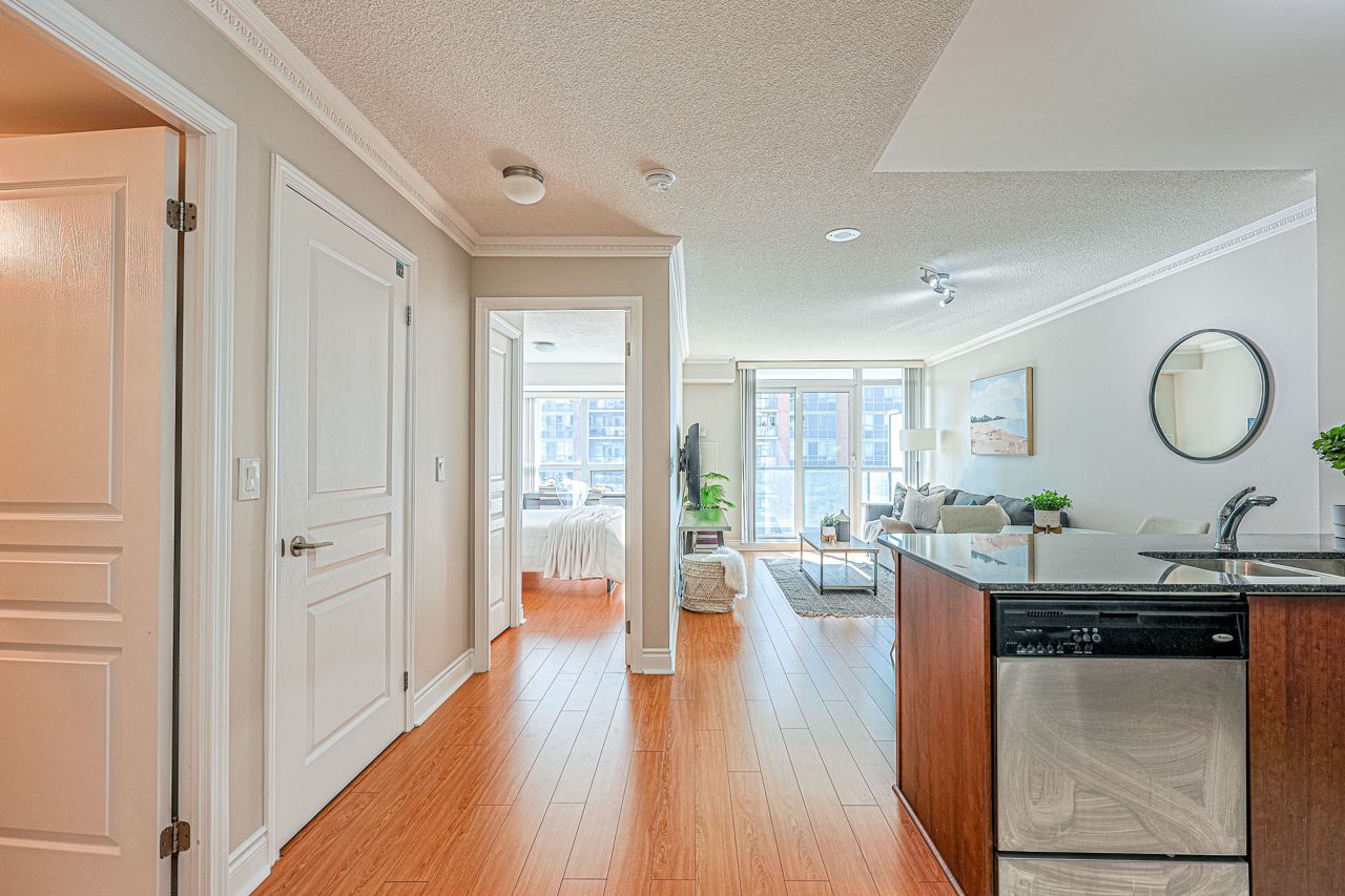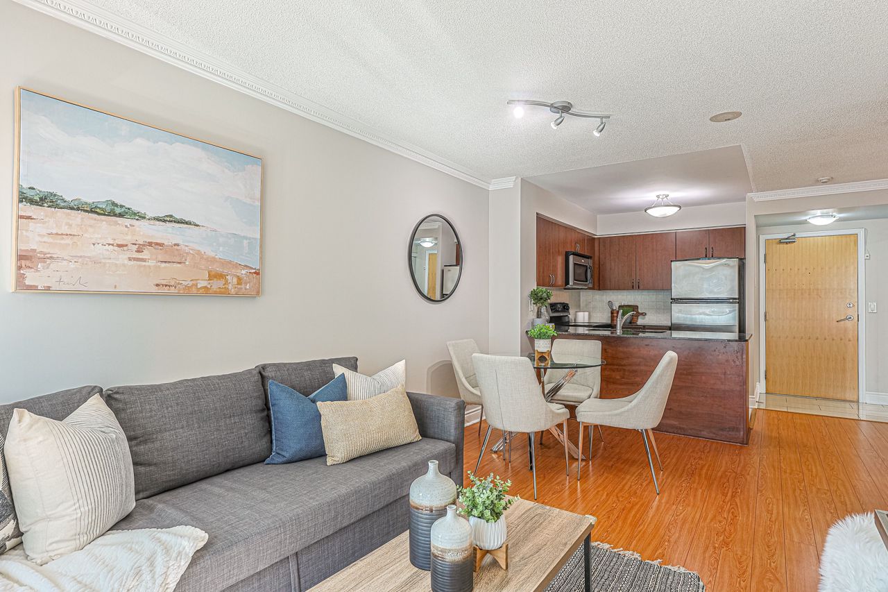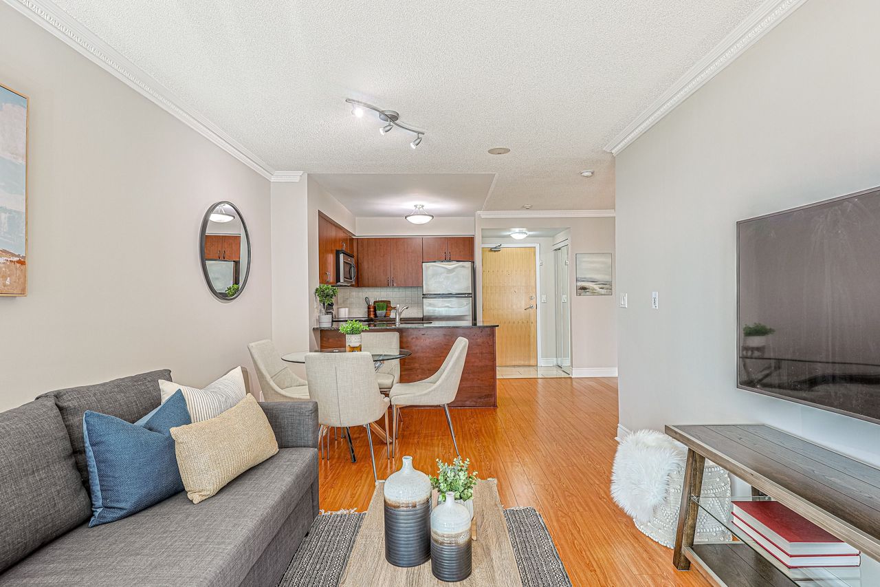 Luxury 1 Bedroom Unit With Sun-Filled Balcony. Approximately 593 Sqft With A Great Functional And Open Concept Layout. The Modern Kitchen Features Granite Countertop & Backsplash And Stainless Steel Appliances. The Living Room Area Is Showcased By The Elegant Crown Moulding. 24 Hour Concierge And With Great Amenities. Walking Distance To Schools, Many Shops, Medical Centre, Hotel, Parks, Close To Go Train Station, Hwy 407 Downtown Markham And The Future York University Markham Campus. A Must See!Existing: Fridge, Stove, Dishwasher, Washer & Dryer, All Elf's, All Window Coverings.