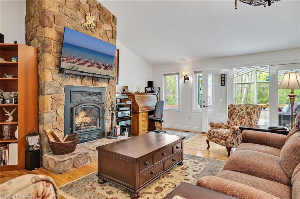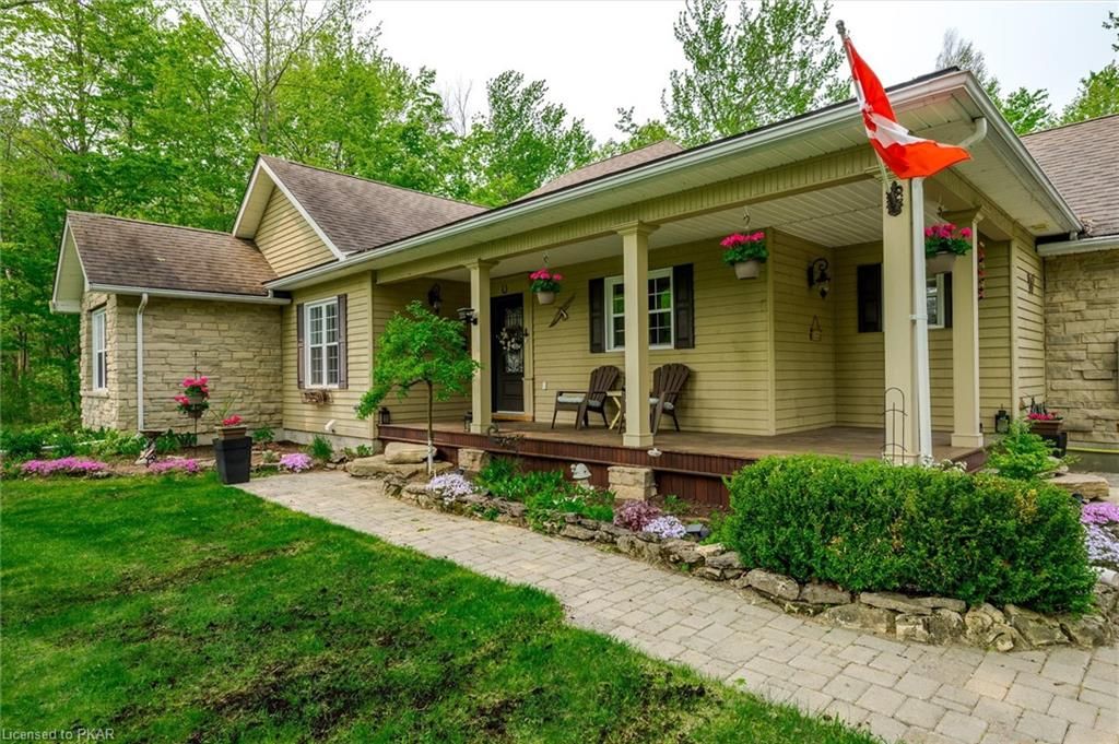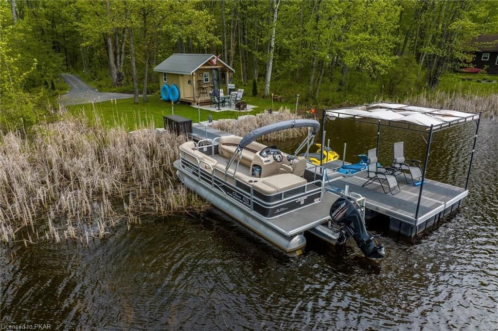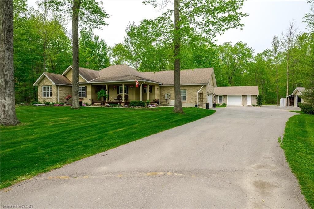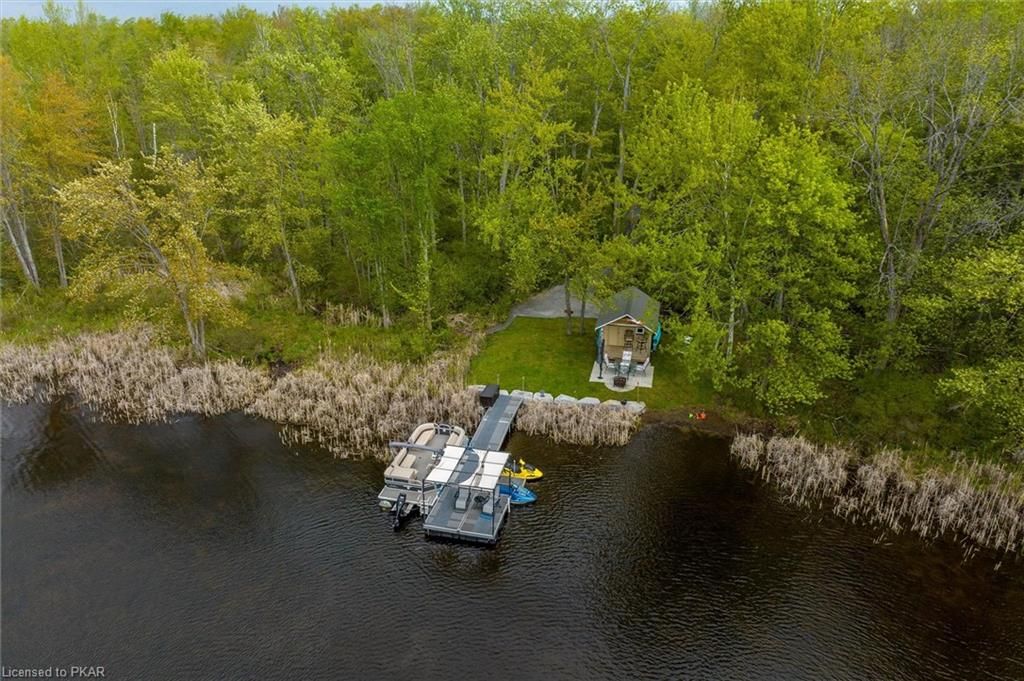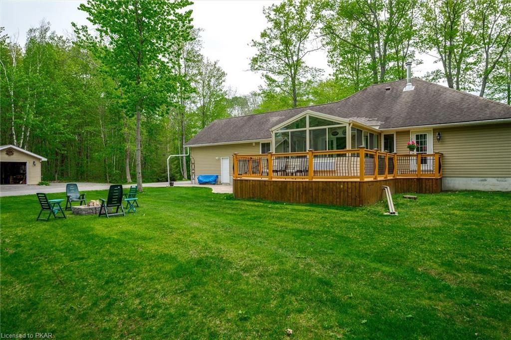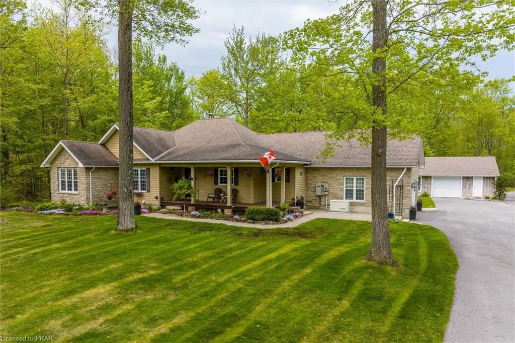 Executive 3 bed bungalow situated on 16 acres of trees and trails with over 500 feet of natural waterfront along the Crowe river with sandy beach entry and a 250 sq ft floating dock. Located near the mouth of Crowe lake means you have all the quiet and calm water of the river but are on the lake in less than a minute for recreational boating. A spacious open concept design centered around a stone floor to ceiling wood burning fireplace plus a 4 season glassed solarium, hardwood floors, cherry finished custom kitchen cabinets, granite counters, and stainless steel appliances. 3 bright spacious bedrooms include a primary with 4 pc. ensuite, heated floor, walk in closet plus separate access to the wrap around deck. This home is protected by a 18Kw Generac generator installed in 2022 fully automatic as well as WIFI enabled.Sit and relax on your front cedar porch with views of the river or stretch out on your large backyard deck overlooking your secluded backyard with firepit or of course head over to the water and enjoy the sun and fun.There is a bunkie
