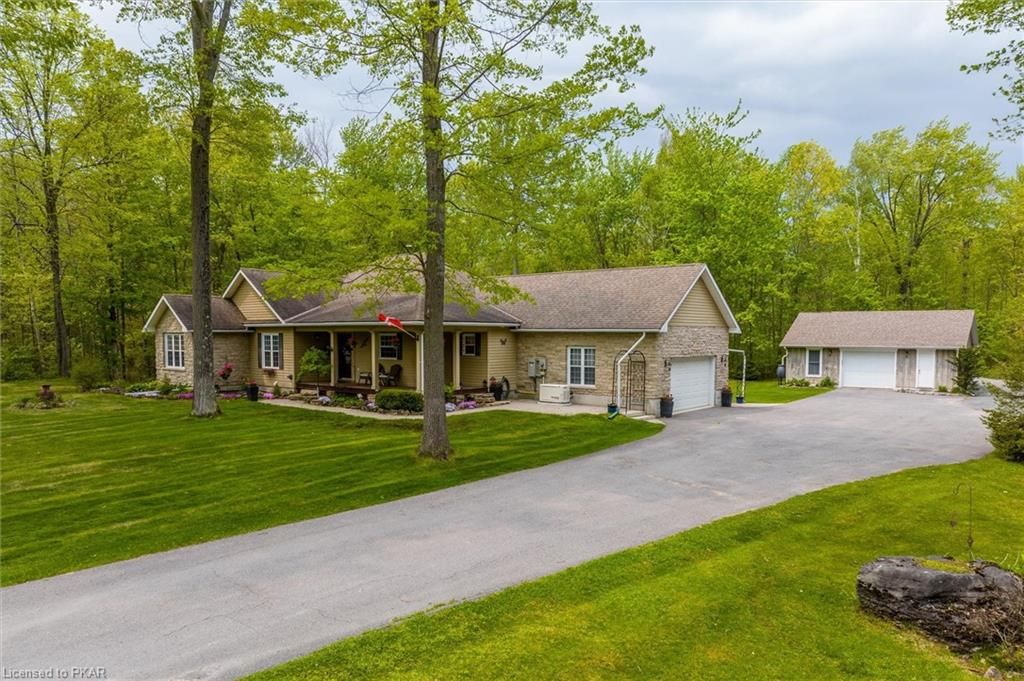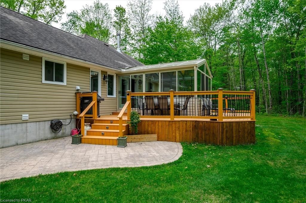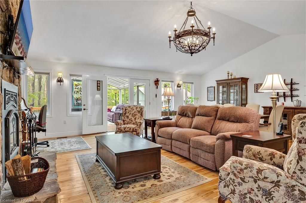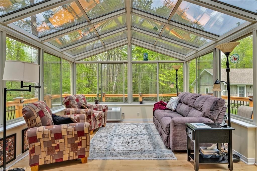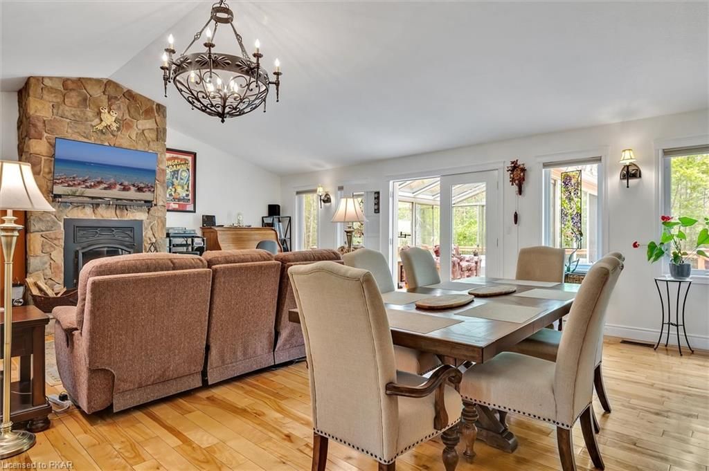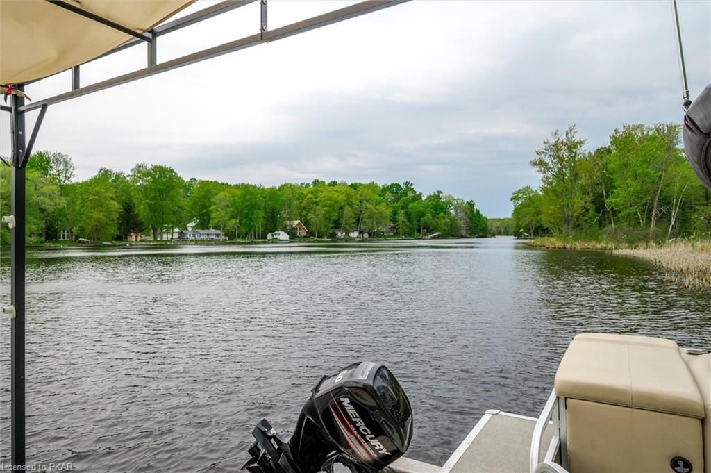 Executive 3 bed bungalow situated on 16 acres of trees and trails with over 500 feet of natural waterfront along the Crowe river with sandy beach entry and a 250 sq ft floating dock. Located near the mouth of Crowe lake means you have all the quiet and calm water of the river but are on the lake in less than a minute for recreational boating. A spacious open concept design centered around a stone floor to ceiling wood burning fireplace plus a 4 season glassed solarium, hardwood floors, cherry finished custom kitchen cabinets, granite counters, and stainless steel appliances. 3 bright spacious bedrooms include a primary with 4 pc. ensuite, heated floor, walk in closet plus separate access to the wrap around deck. This home is protected by a 18Kw Generac generator installed in 2022 fully automatic as well as WIFI enabled.Sit and relax on your front cedar porch with views of the river or stretch out on your large backyard deck overlooking your secluded backyard with firepit or of course head over to the water and enjoy the sun and fun.There is a bunkie