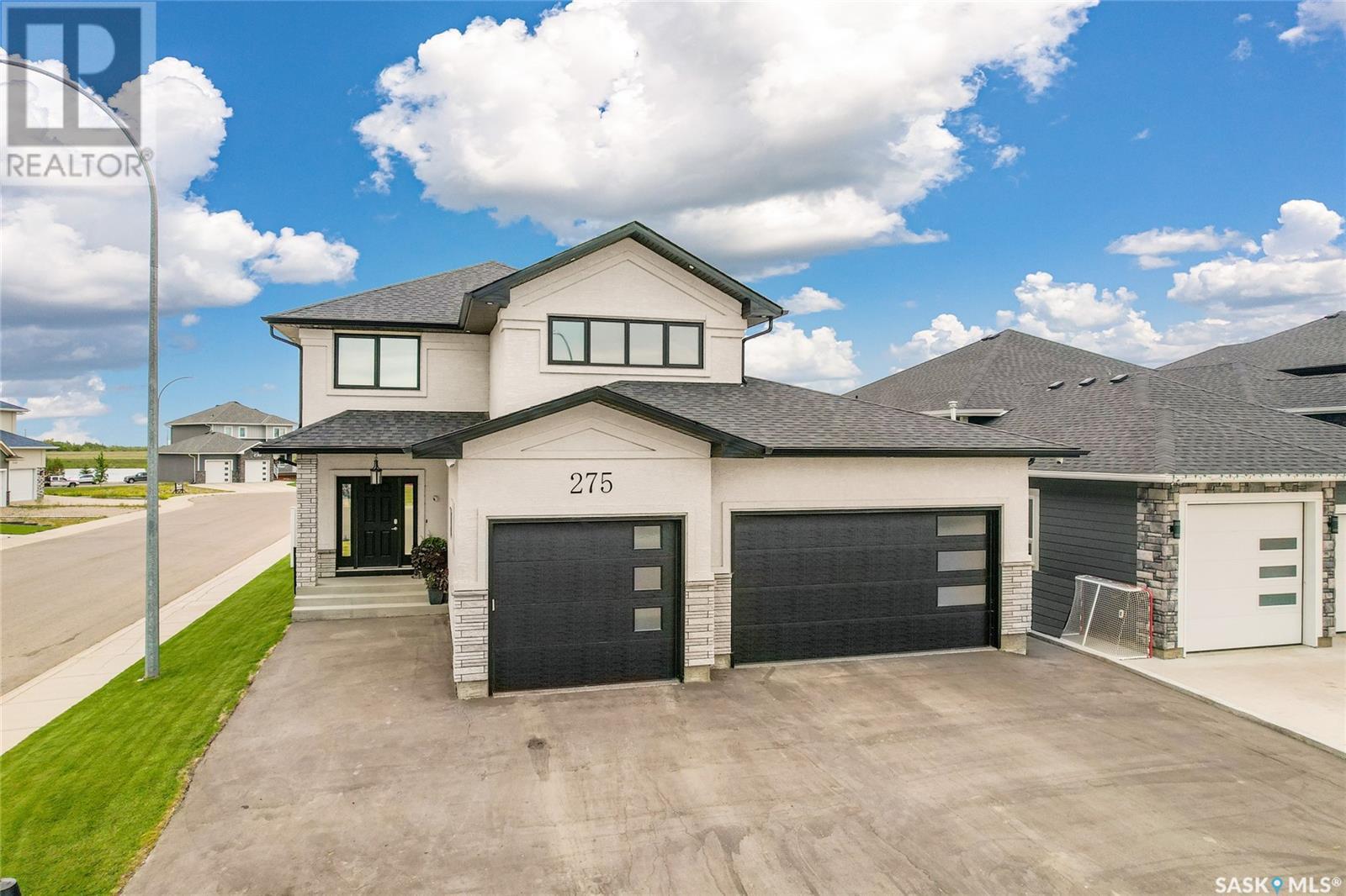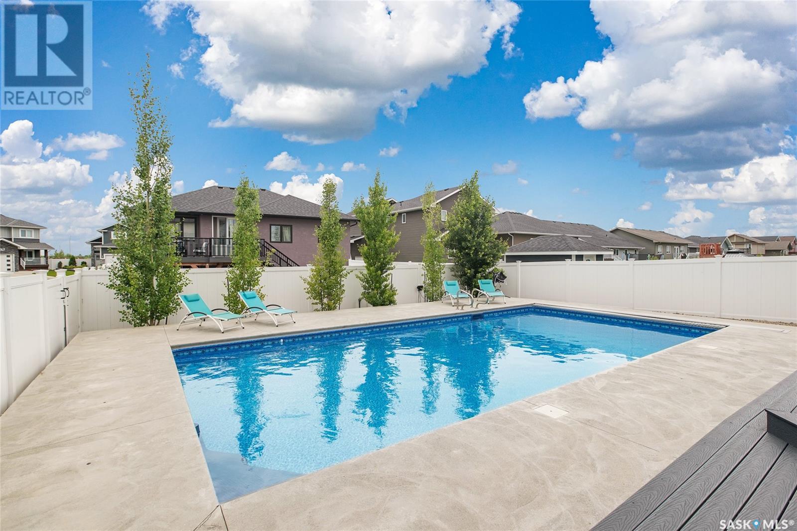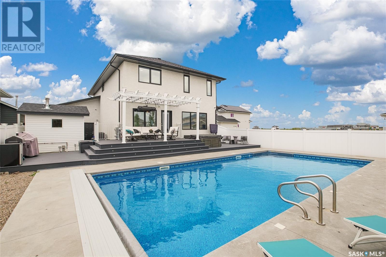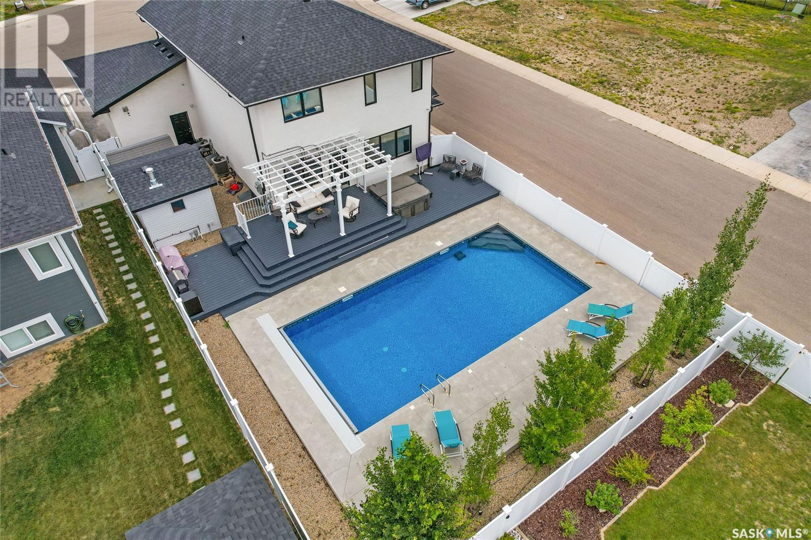 Rare find! Check out this stunning almost 2100 sq ft 2 Storey located at 275 Cowan Cres in Lake Vista, Martensville. Outside leaves you in awe with this huge Heated In ground pool with electric automatic security cover which allows one to walk on. Surrounding the pool is tons of concrete, hot tub, gas deck heater, natural gas BBQ pool shed, storage shed, LED lighting, and composite decking making the back yard maintenance free. Inside is turnkey and boasts 4 bedrooms, 4 bathrooms, bonus room on 2nd, main floor laundry, massive kitchen to entertain in, tons of triple pane windows with sun tint and a heated triple car garage with epoxy flooring. Other notables: high end security camera system, AC, C/V with floor sweeps, appliances, extra wide asphalt driveway, vinyl fencing, custom window treatments, luxury vinyl plank through out and much more. Location is key with views of ponds, steps from walking paths, and only block from school make this the perfect family home. Don't miss out! (id:22211)