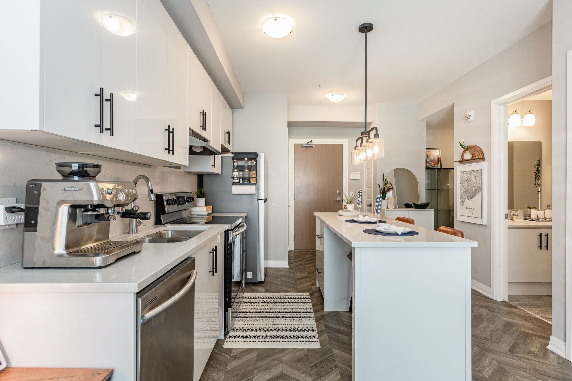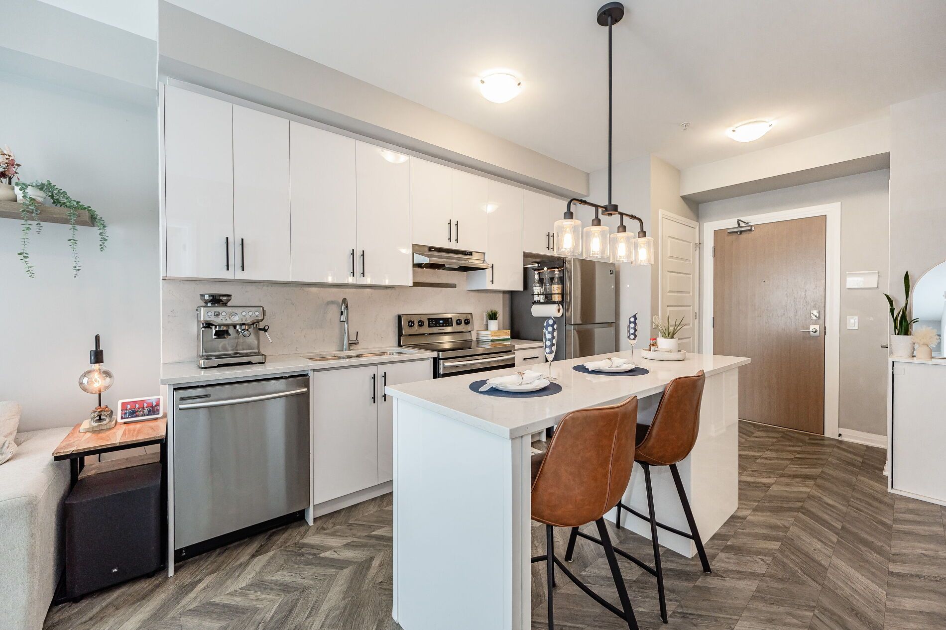 flooring, modern kitchen with quartz countertops, all stainless steel appliances & breakfast bar &