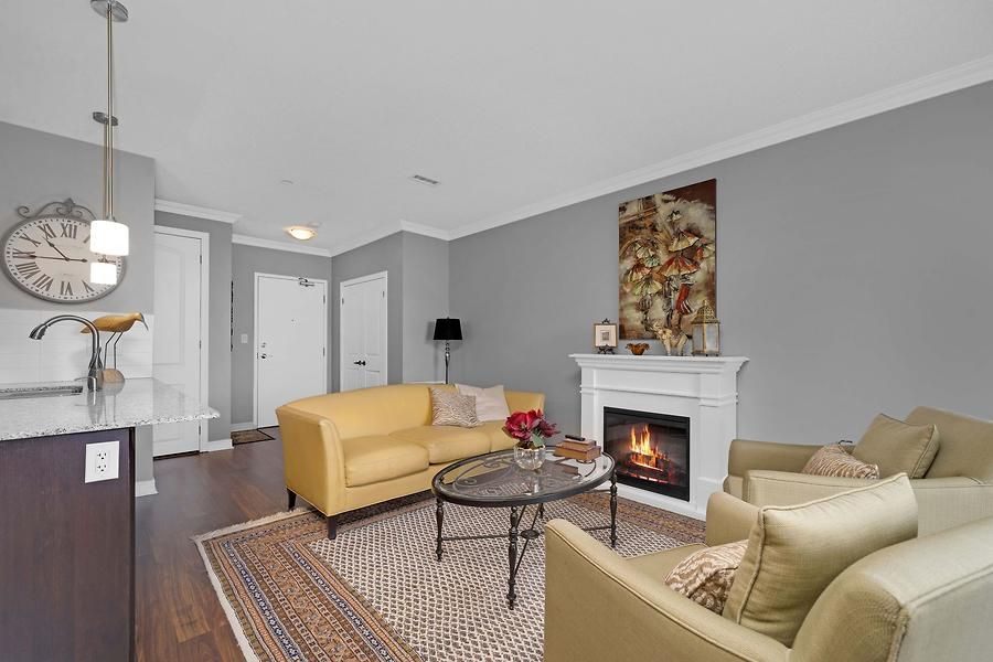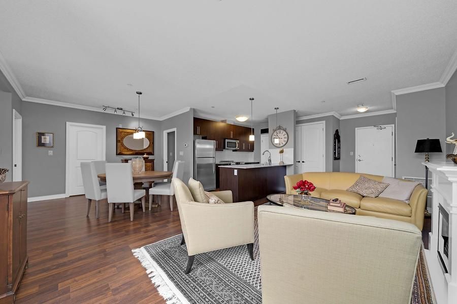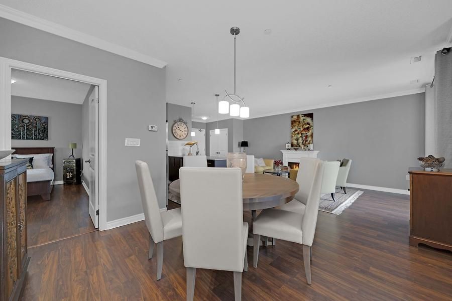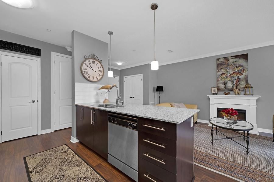 Two bedroom plus den open concept 1375 sq ft corner unit with 9’ ceilings. Two owned parking spots & lg locker located within walking distance to downtown & many other amenities. Kitchen has convenient pantry, granite countertops, stainless appliances & undermount sink and is open to large living room with cozy fireplace. Dining area will accommodate your furniture. Large primary bedroom with recently renovated ensuite has glass shower, granite countertop & double sinks. Good sized 2nd bedroom & recently updated 2nd full bath. The building offers exercise area, ample visitor parking, Party room & games room. A highly upgraded & updated unit in a well located & maintained building with favourable condo fees and energy efficiencies for low utilities.